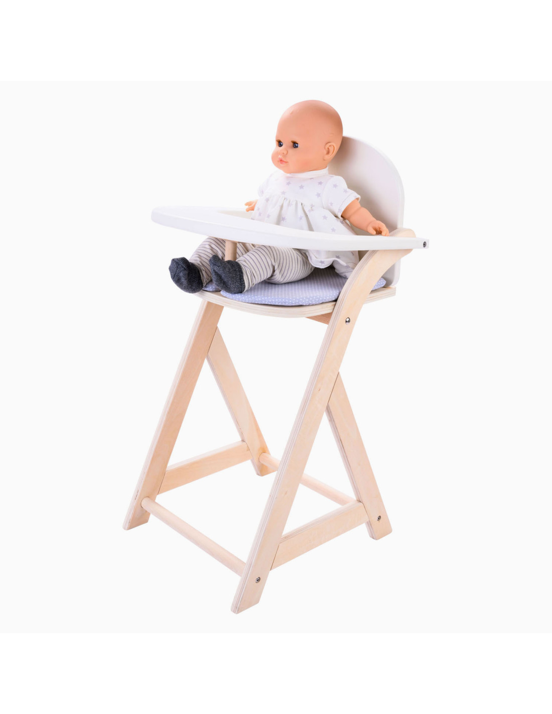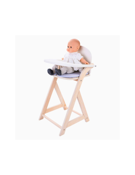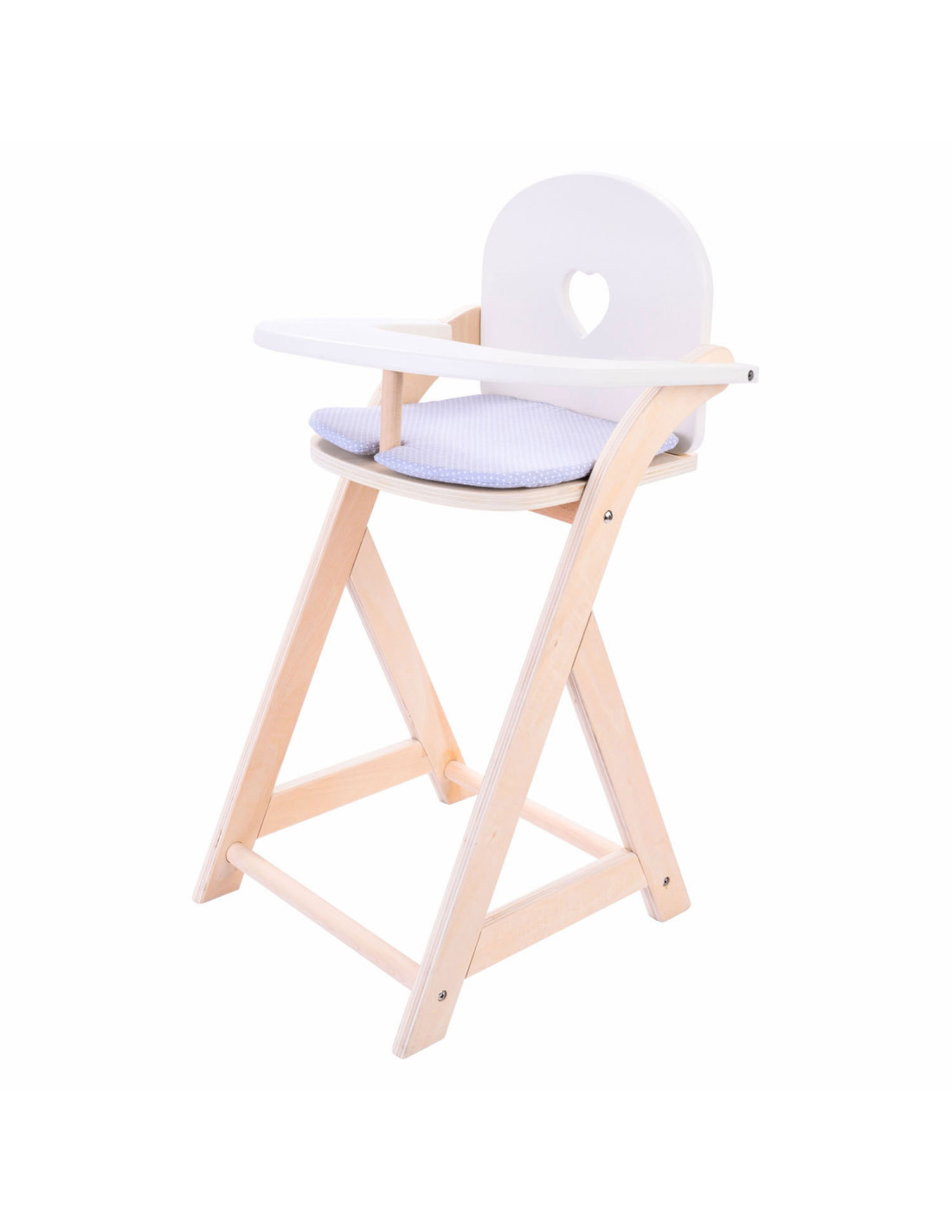 Geef jouw pop eten in deze mooie kinderstoel! Deze houten poppen kinderstoel wordt geleverd met een kussentje in de kleuren grijs/ wit. De kinderstoel is geschikt voor alle poppen.