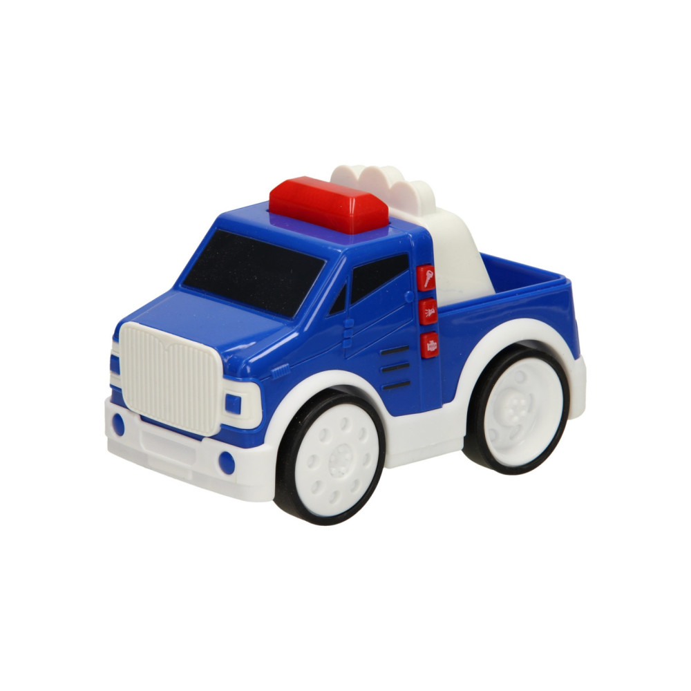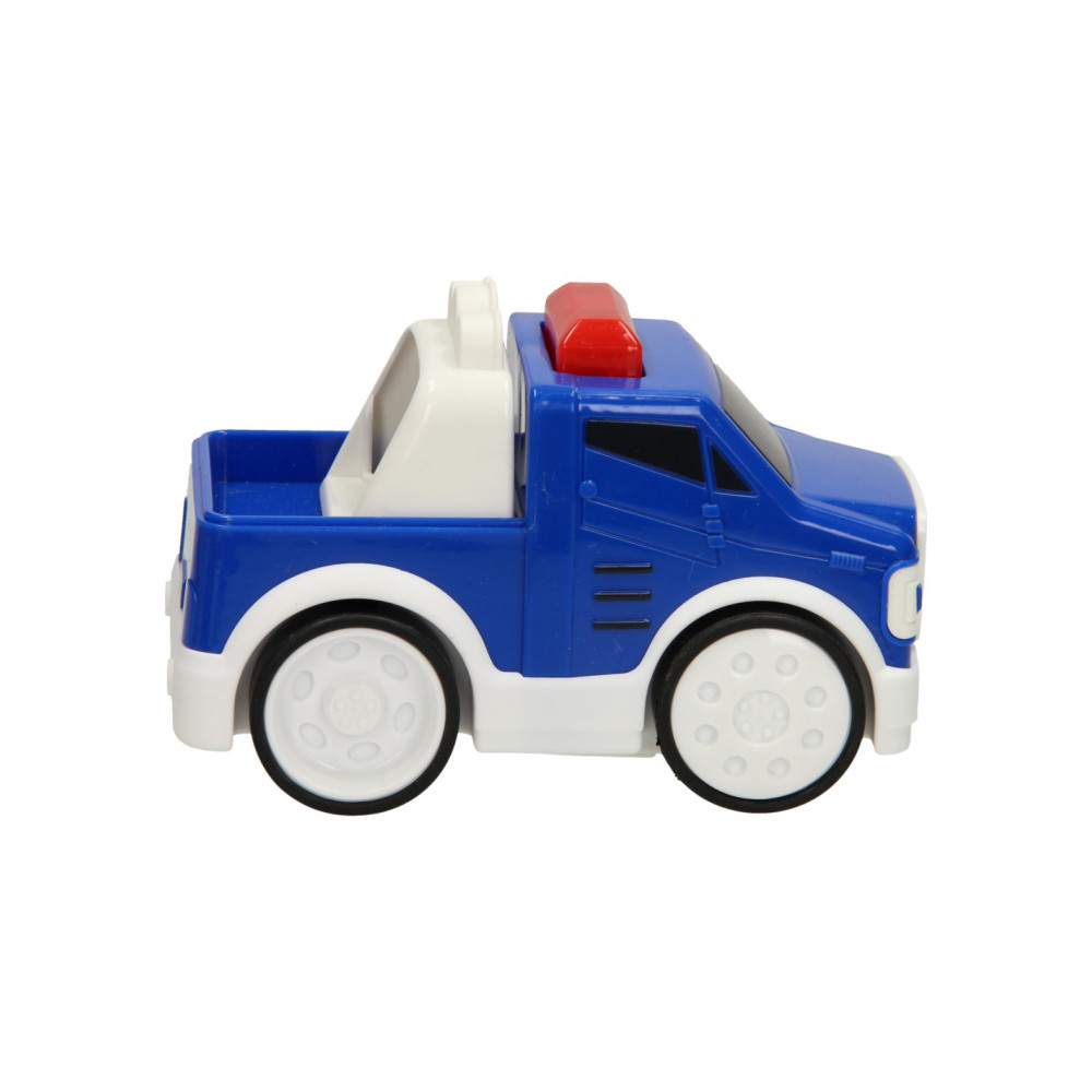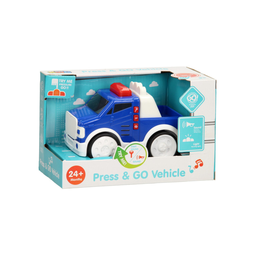 Tatu, tatu, daar komt je Press & Go Politieauto aan! Druk op het zwaailicht en laat je blauwe speelgoedauto rijden. De kunststoffen Press & Go Auto - Politie is zeer geschikt voor jonge kinderen. De auto is lekker groot en geeft licht en geluid! Werkt op 2AAA batterijen (inbegrepen).