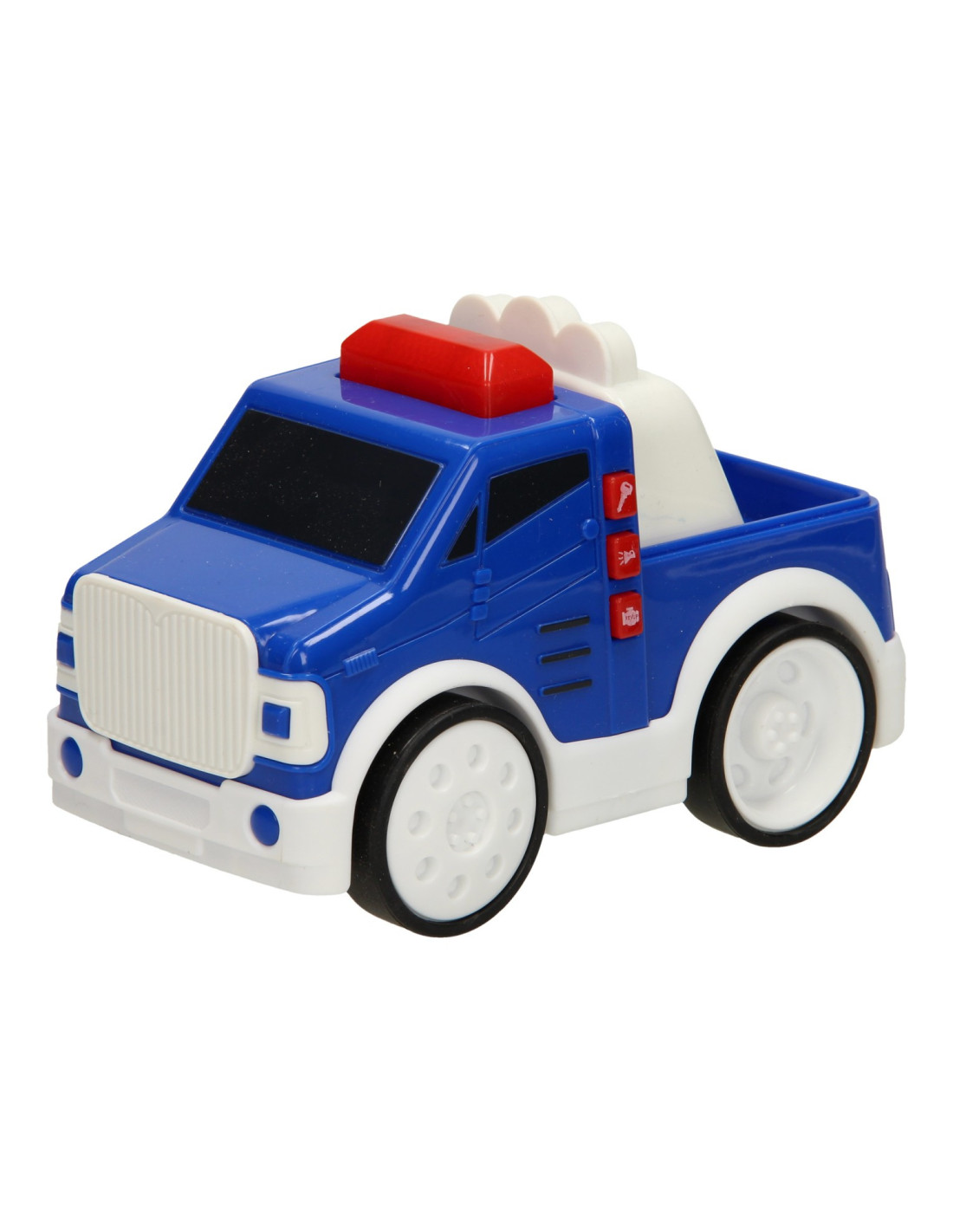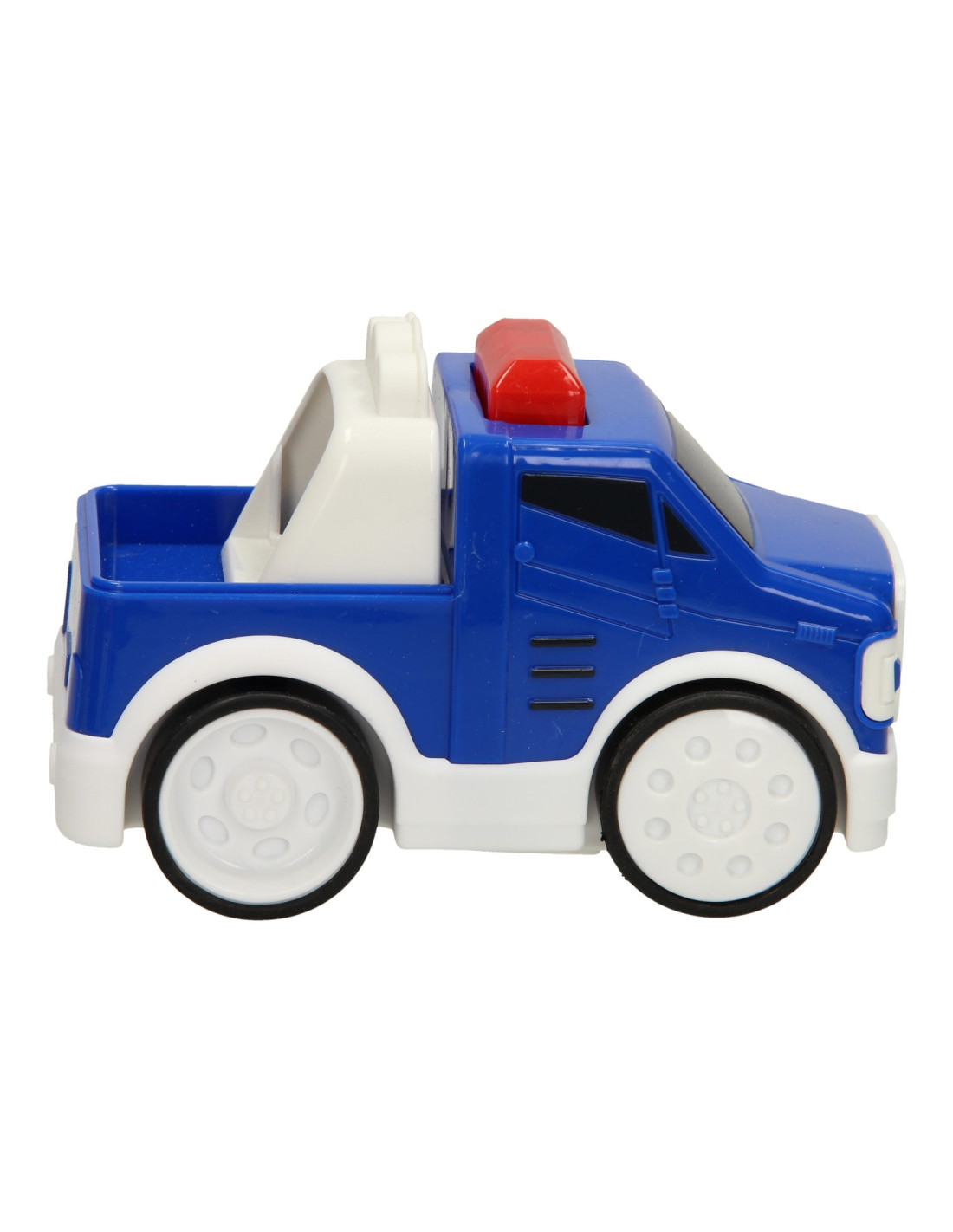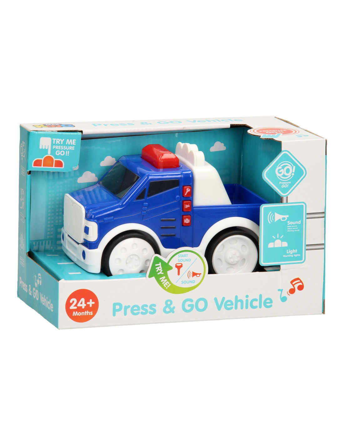 Tatu, tatu, daar komt je Press & Go Politieauto aan! Druk op het zwaailicht en laat je blauwe speelgoedauto rijden. De kunststoffen Press & Go Auto - Politie is zeer geschikt voor jonge kinderen. De auto is lekker groot en geeft licht en geluid! Werkt op 2AAA batterijen (inbegrepen).