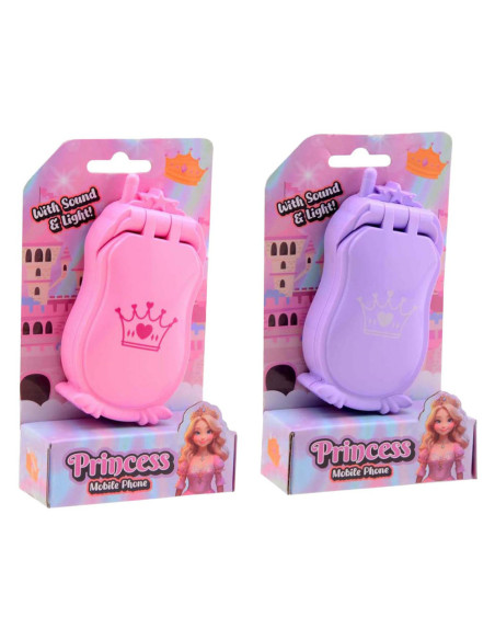 Klapbare prinsessentelefoon met licht en geluid, een spiegeltje en drukknoppen. Gemaakt van kunststof en verkrijgbaar in verschillende kleuren. Inclusief batterijen. Geschikt vanaf 3 jaar.