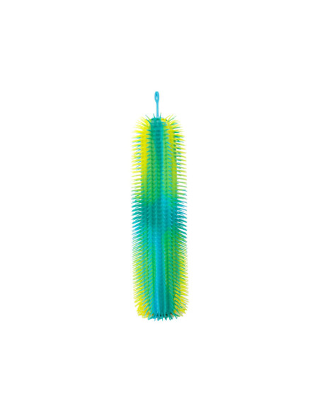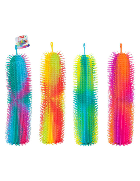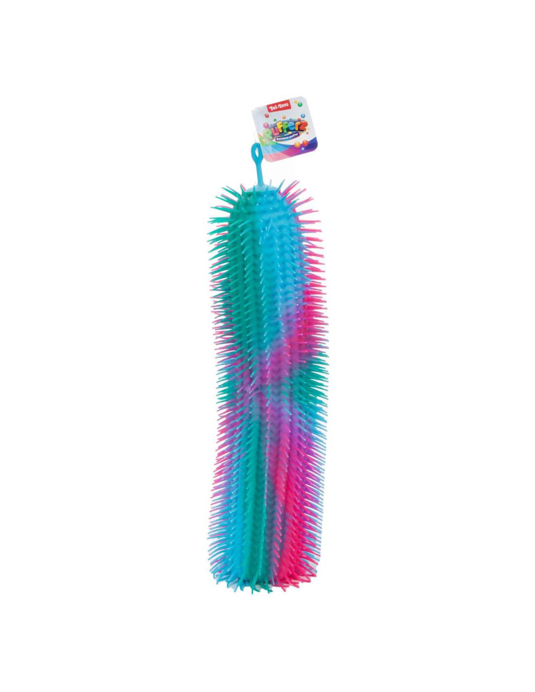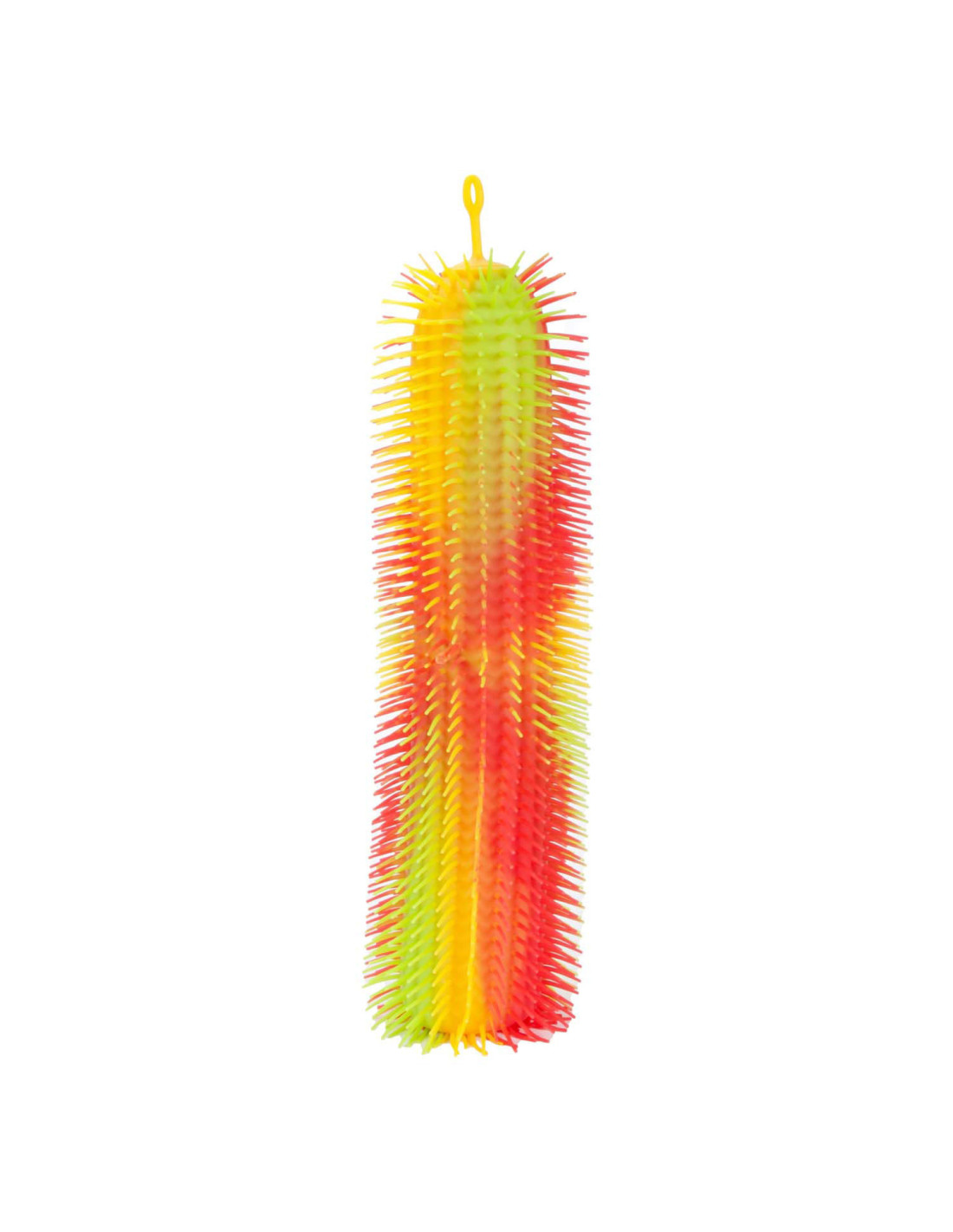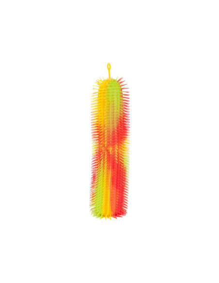 Langwerpige pufferfiguur van 50cm lang in vrolijke regenboog neonkleuren. Geschikt voor kinderen van 3 jaar en ouder.