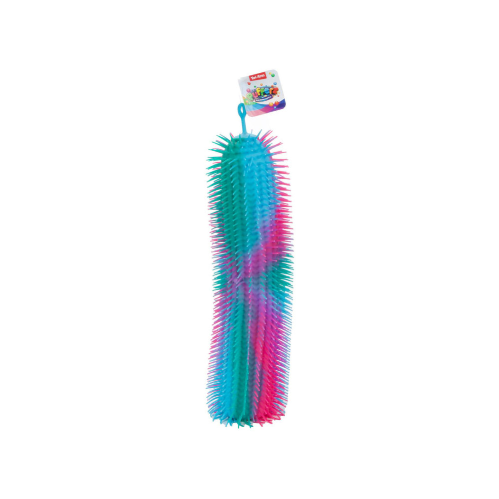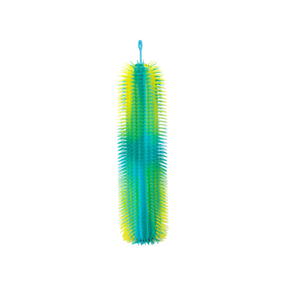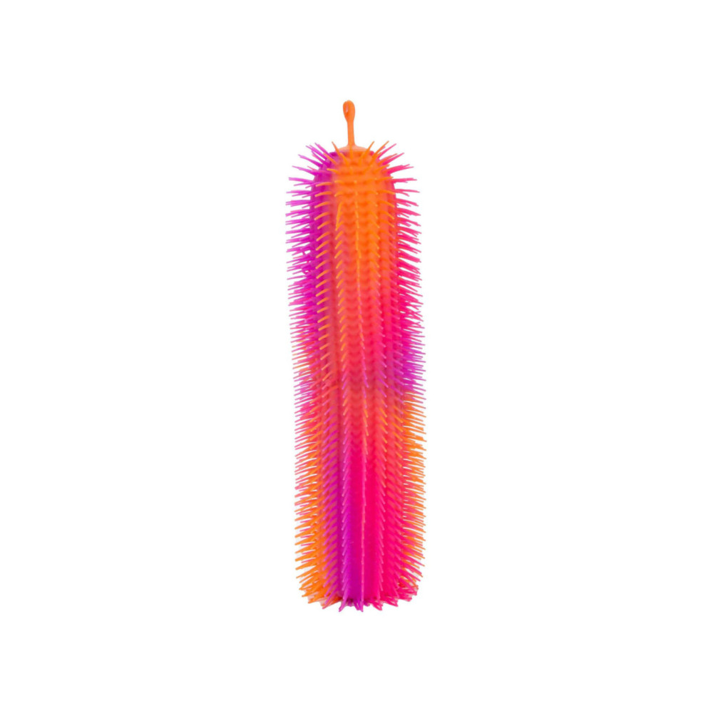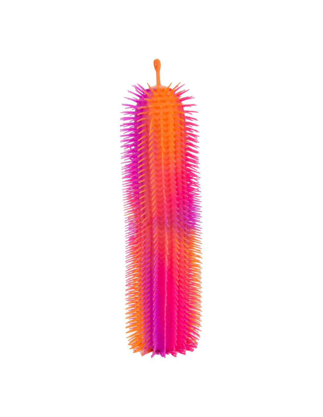 Langwerpige pufferfiguur van 50cm lang in vrolijke regenboog neonkleuren. Geschikt voor kinderen van 3 jaar en ouder.