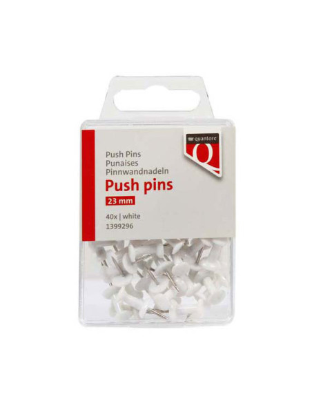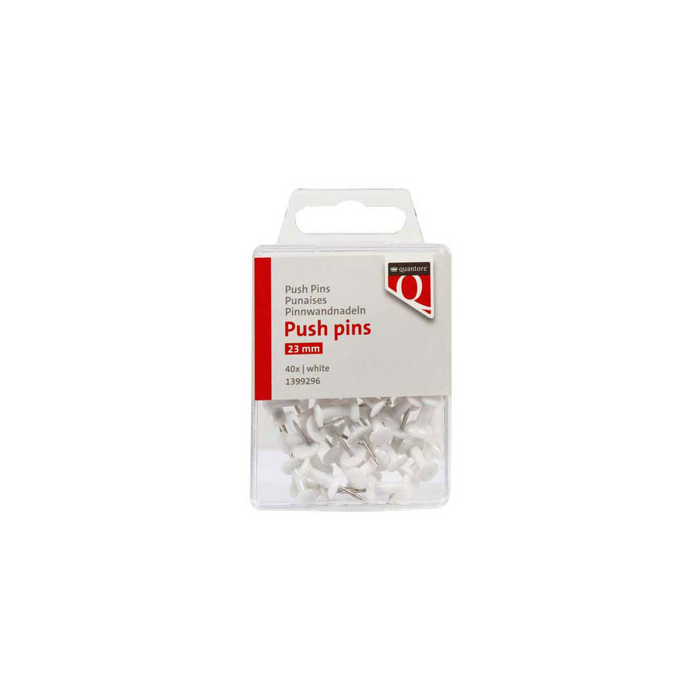 De punaises van Quantore zijn een praktische oplossing voor het ophangen van notities, foto’s, memo’s of tekeningen op prikborden en zachte wanden. Deze punaises zijn uitgevoerd in neutraal wit en passen in elke kantoor-, school- of thuisomgeving. Ze hebben een stevige kunststof kop en een scherpe metalen punt, waardoor ze gemakkelijk in gebruik zijn en stevig blijven zitten. Verpakt in een handige blister met 40 stuks.
