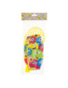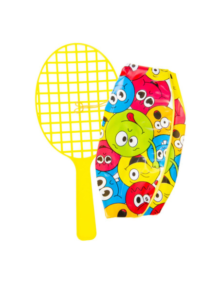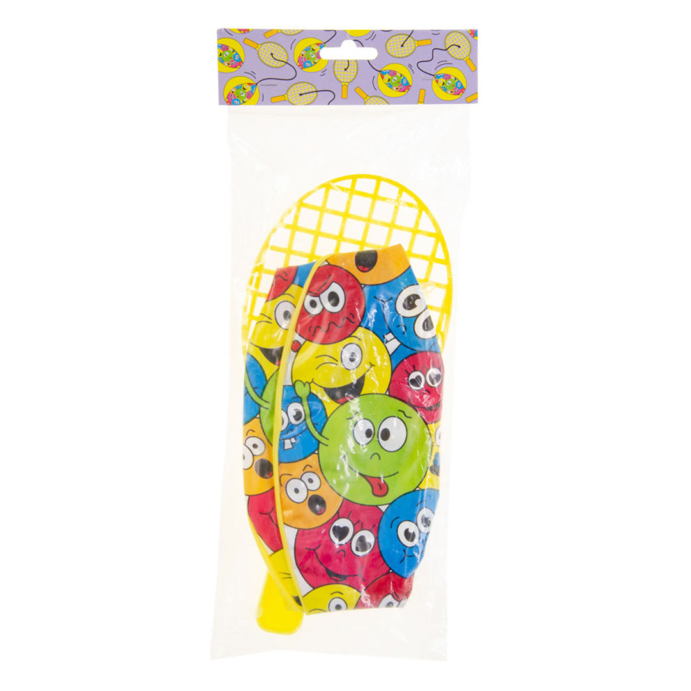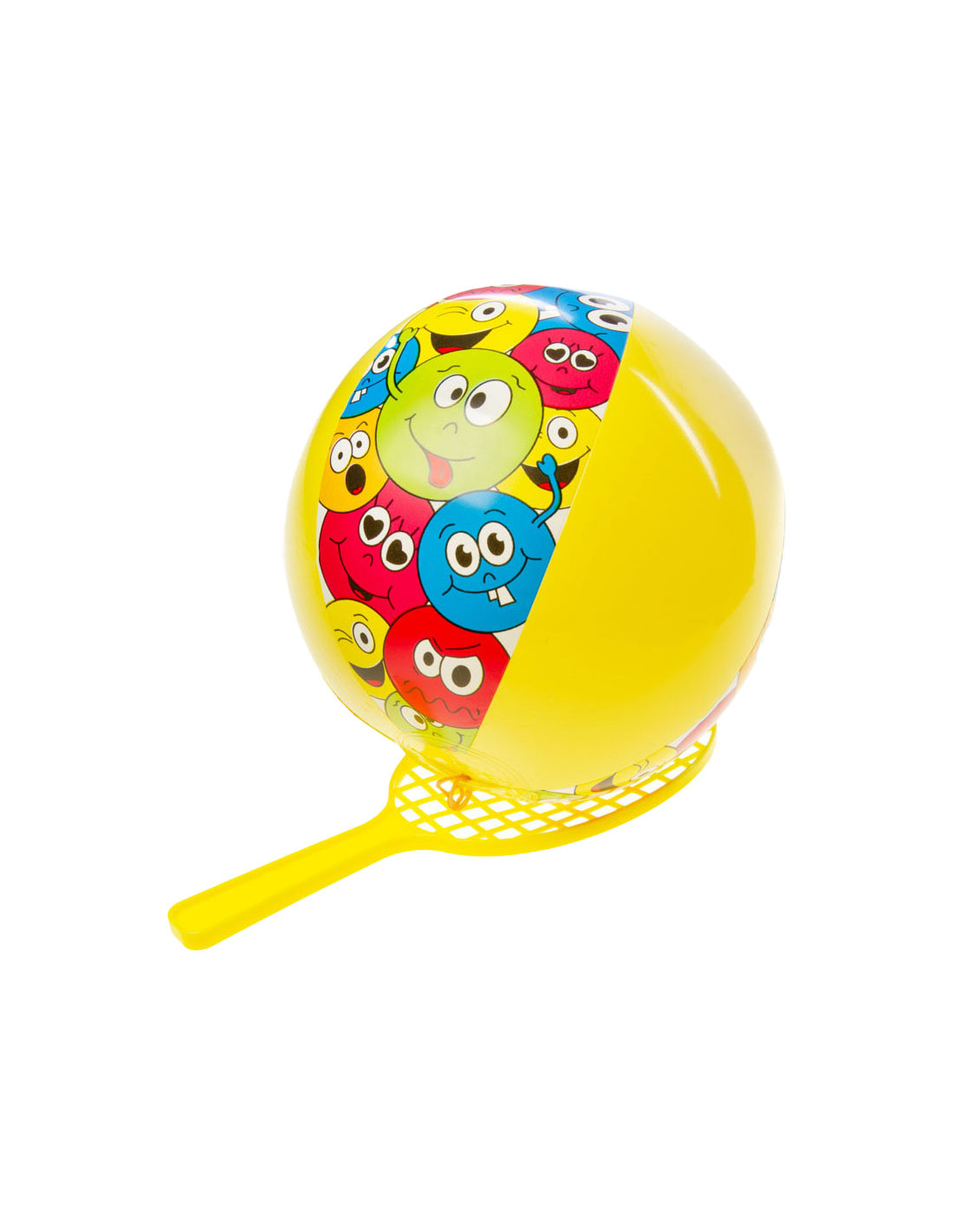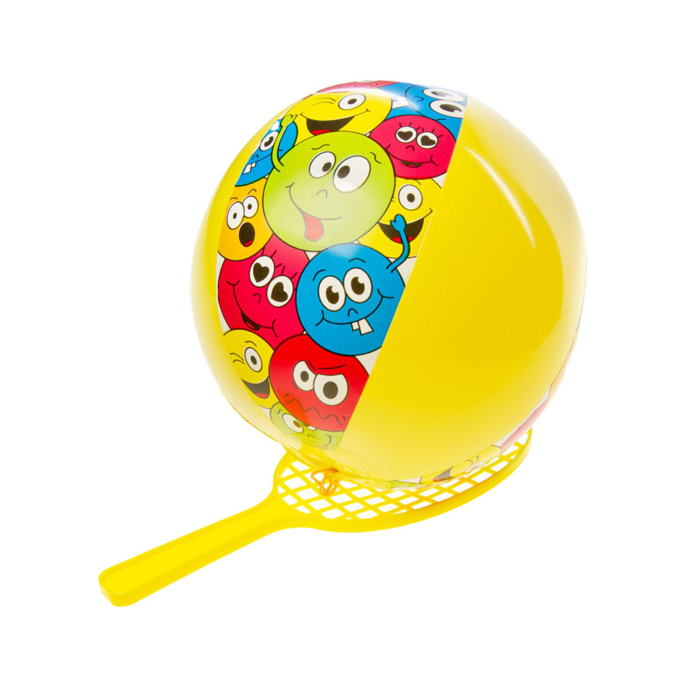 Geel racket met opblaasbare gele bal met verschillende lachgezichtjes, die met een elastiek aan het racket vastzit. Afmetingen bal: diameter 24 centimeter. Afmetingen racket: 24 bij 11 centimeter.