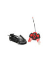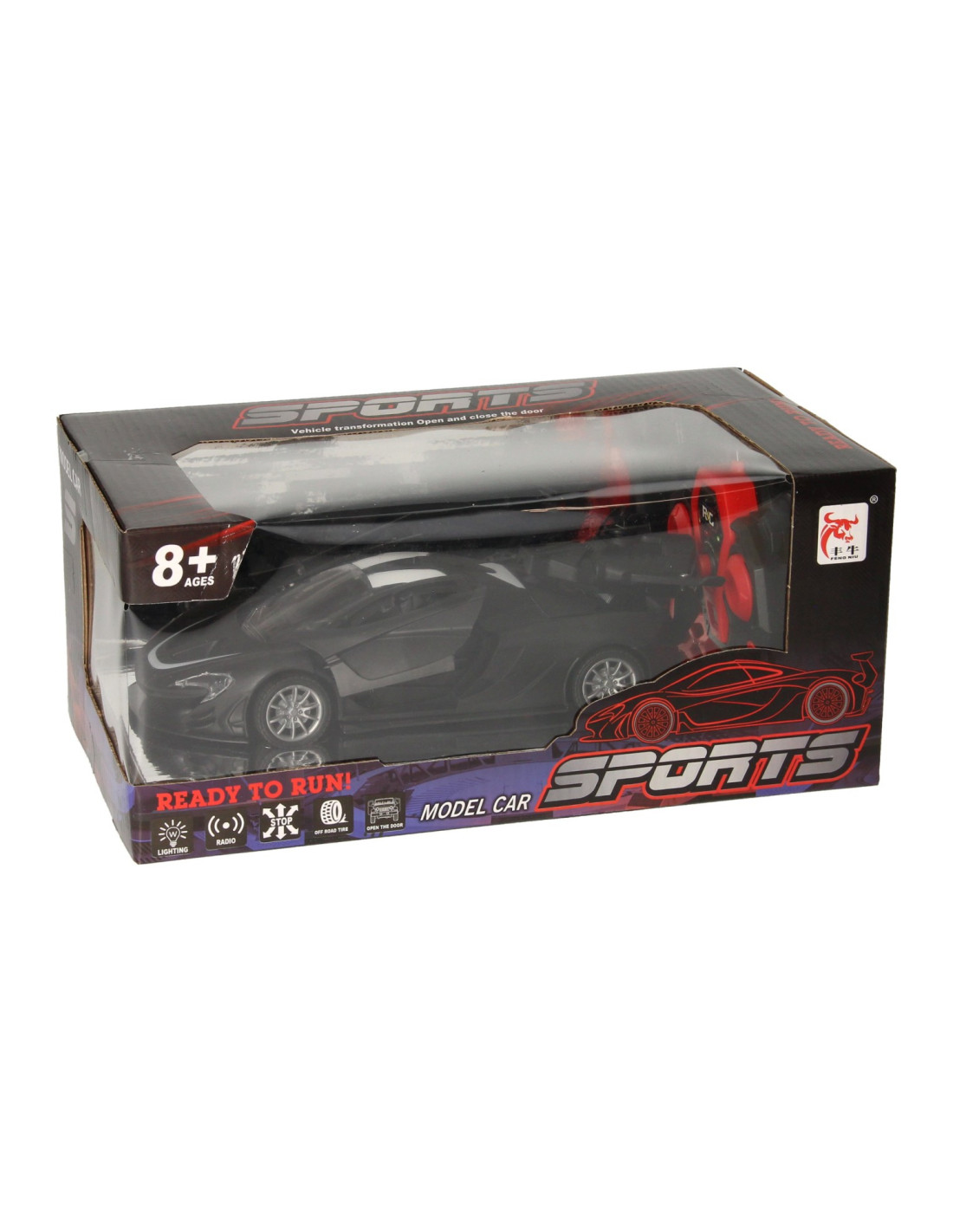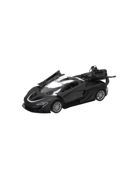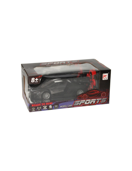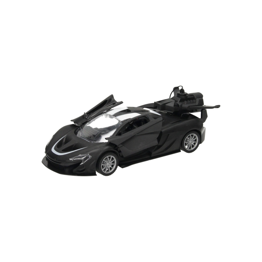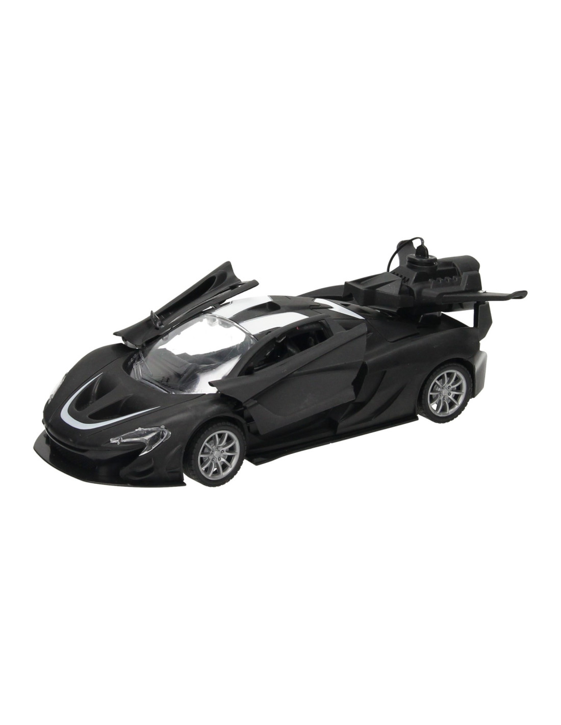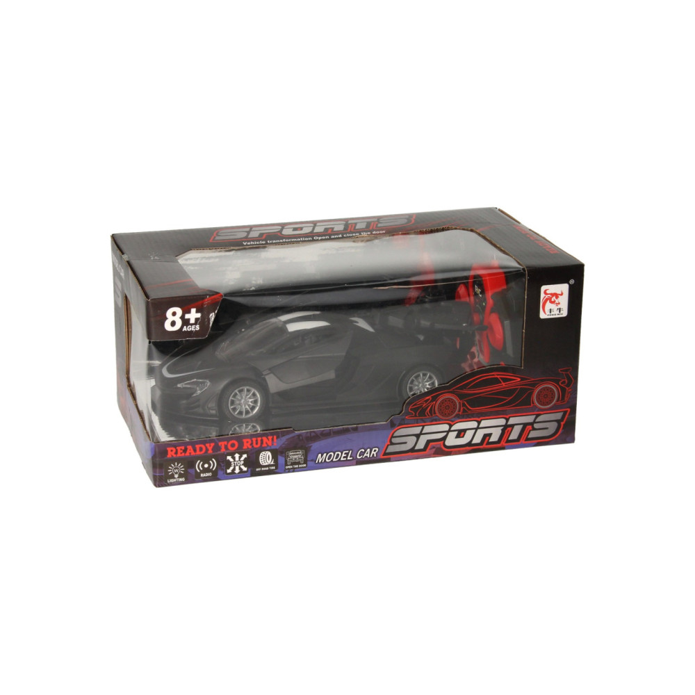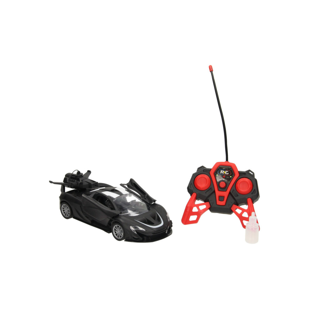 Zwarte RC sportwagen met vleugeldeuren en stoomfunctie. De auto is 22,5 x 10,5 x 8 centimeter groot en geschikt voor kinderen vanaf 6 jaar.