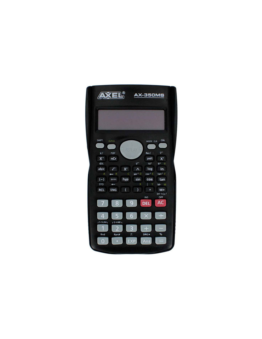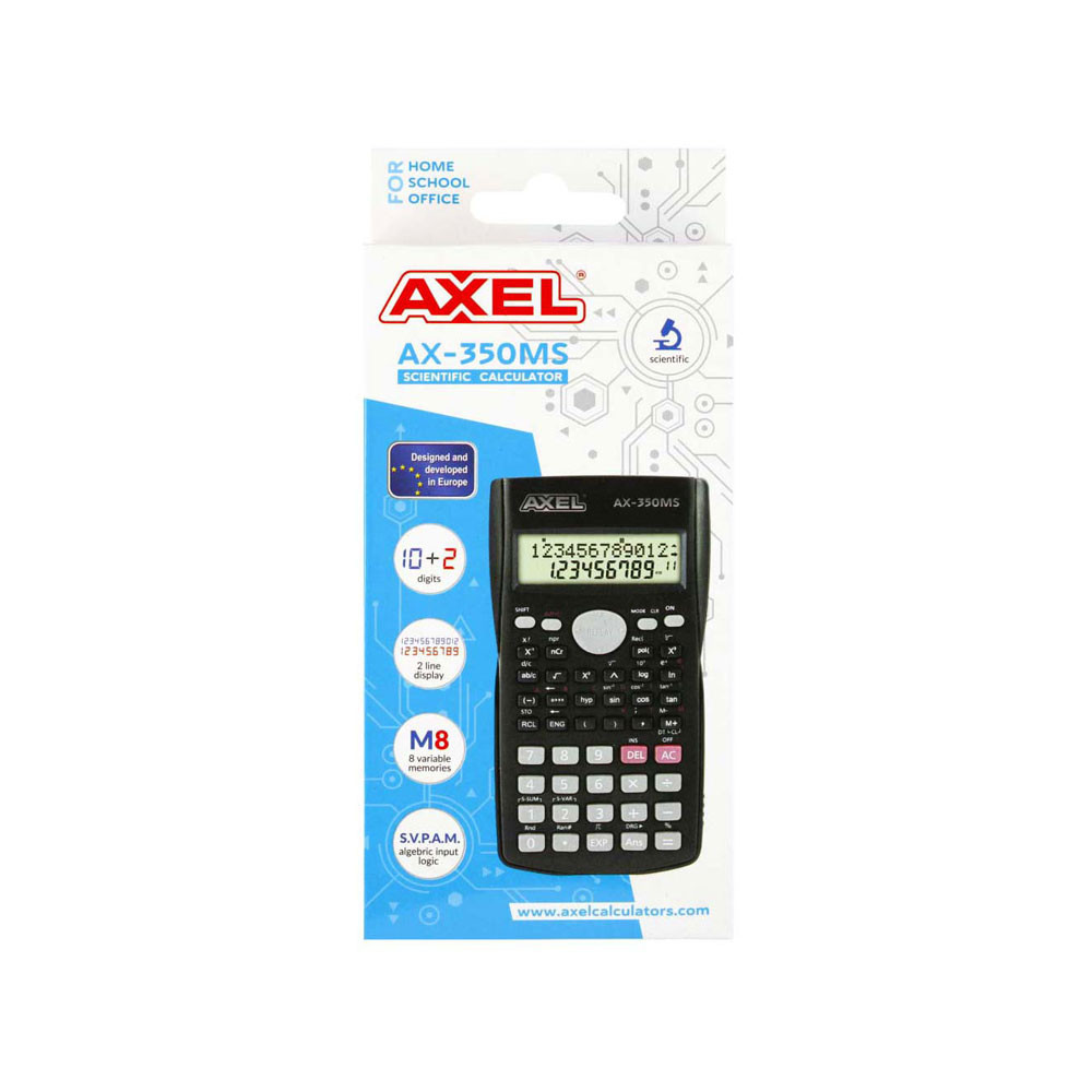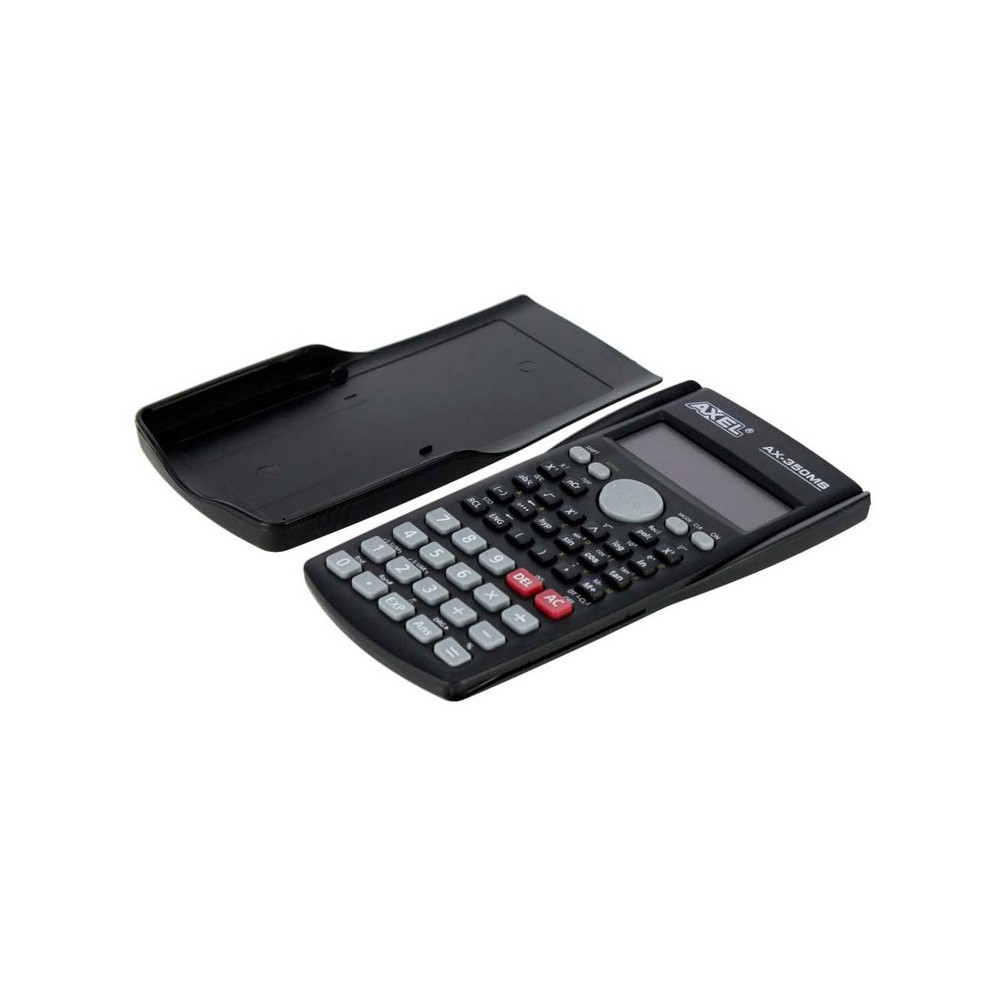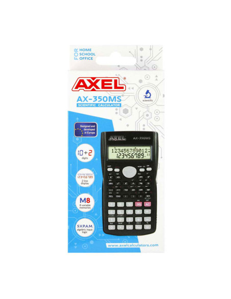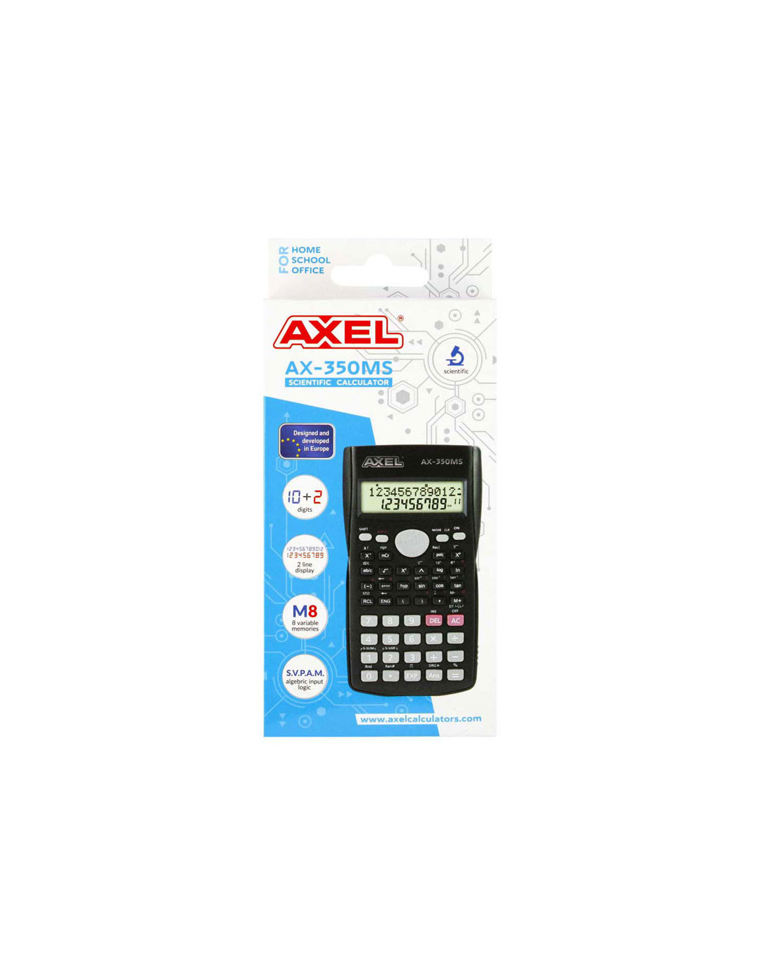 Rekenmachine AX-350MS met beschermende deksel. Afmetingen: 8 x 2 x 16 centimeter. Werkt op 2 x LR44-batterijen - inbegrepen in de verpakking.