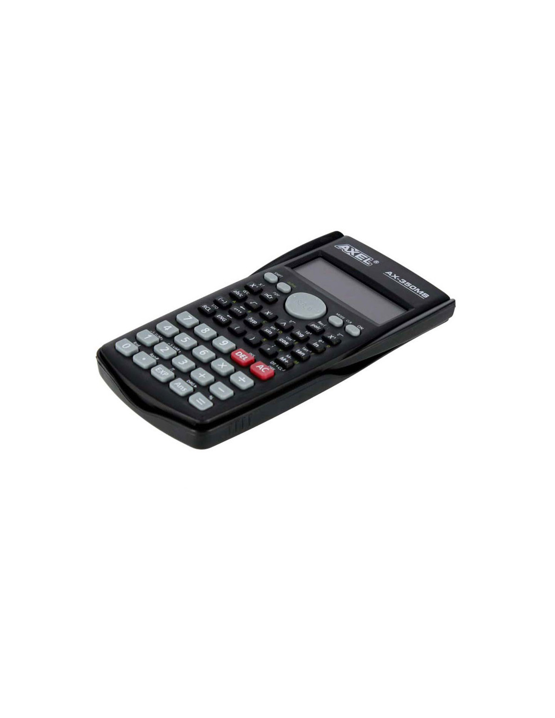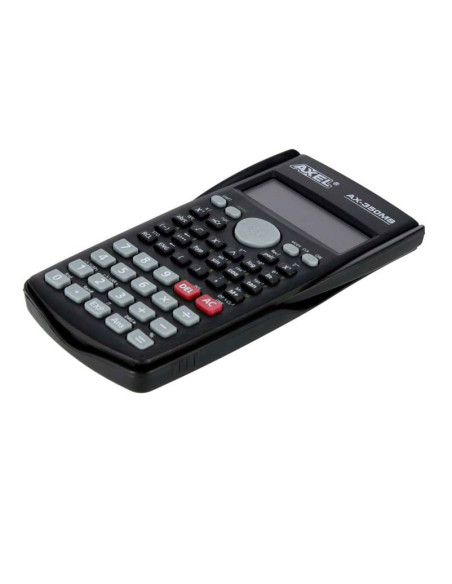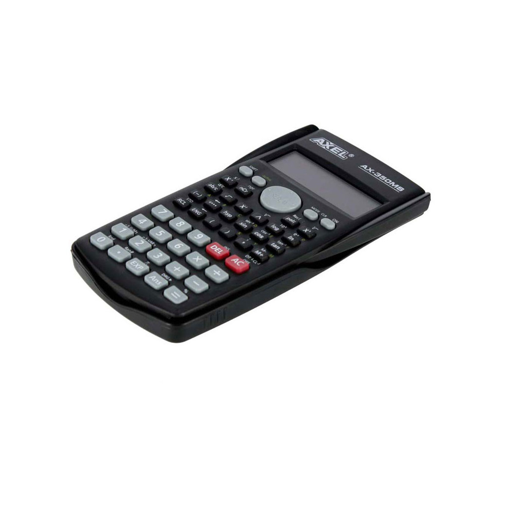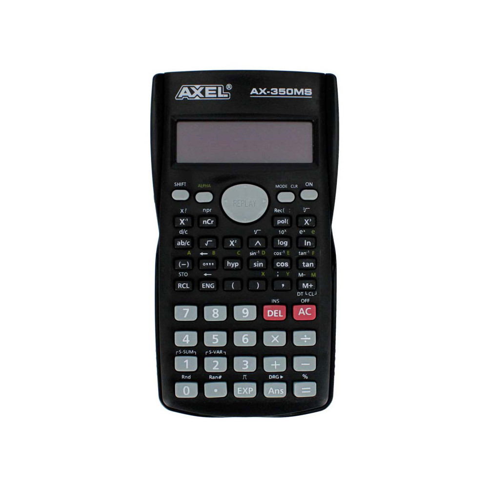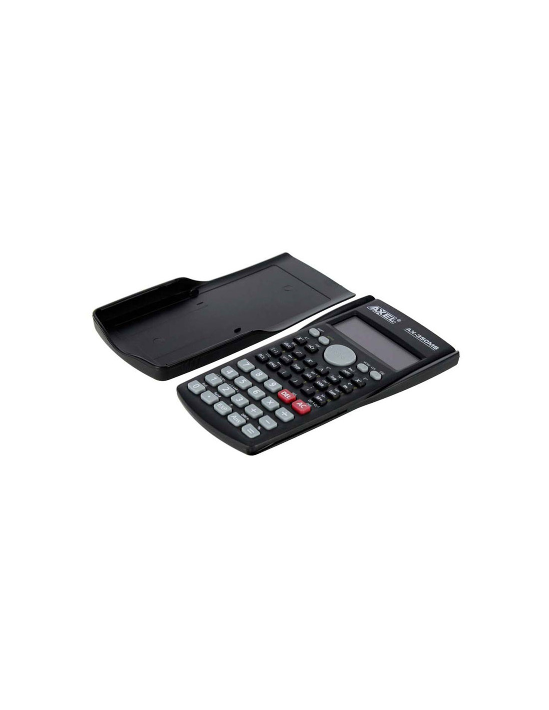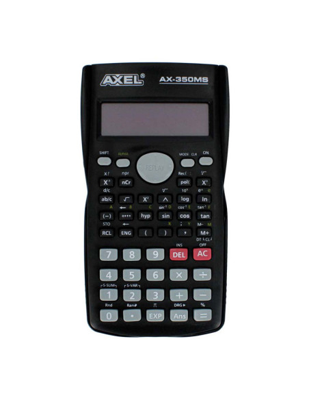Rekenmachine AX-350MS met beschermende deksel. Afmetingen: 8 x 2 x 16 centimeter. Werkt op 2 x LR44-batterijen - inbegrepen in de verpakking.