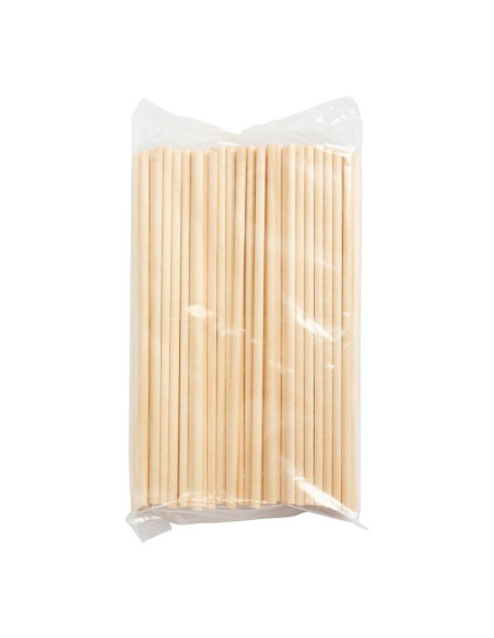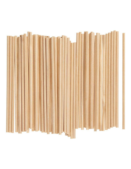 Ronde stokken van licht hout. De stokjes hebben een lengte van 15 centimeter en een doorsnede van 4 millimeter.