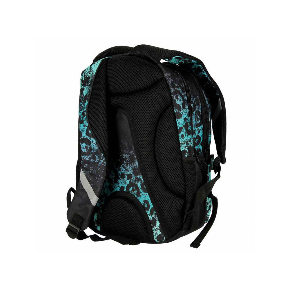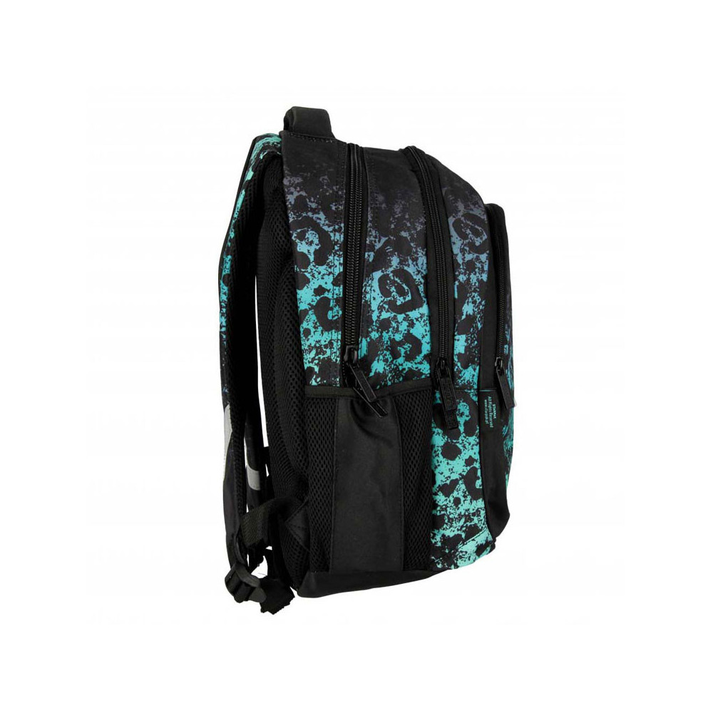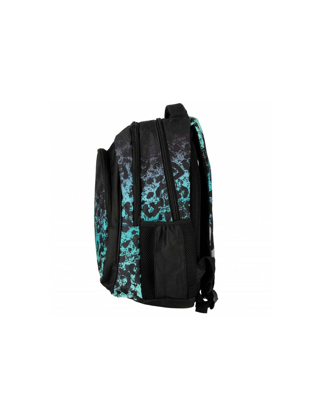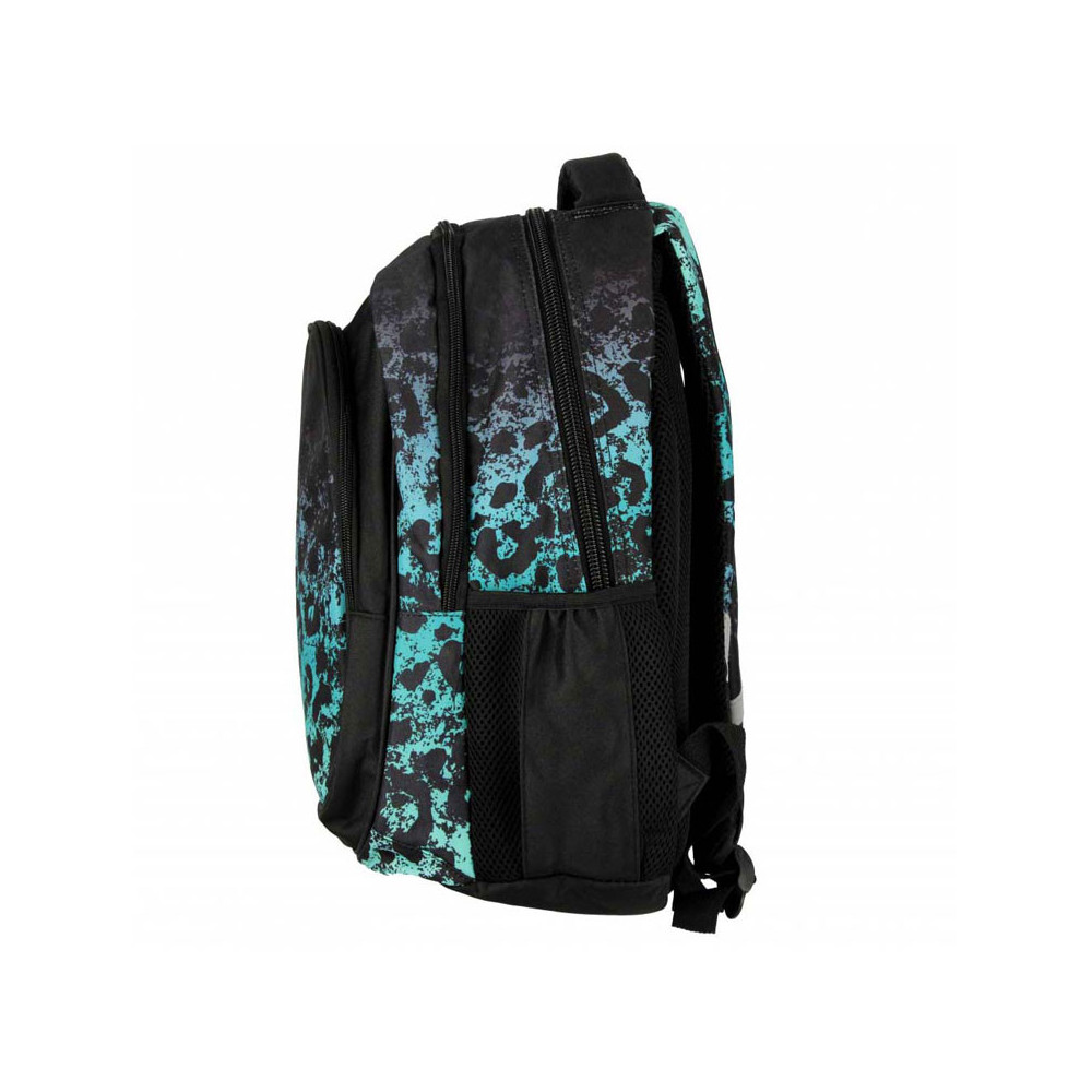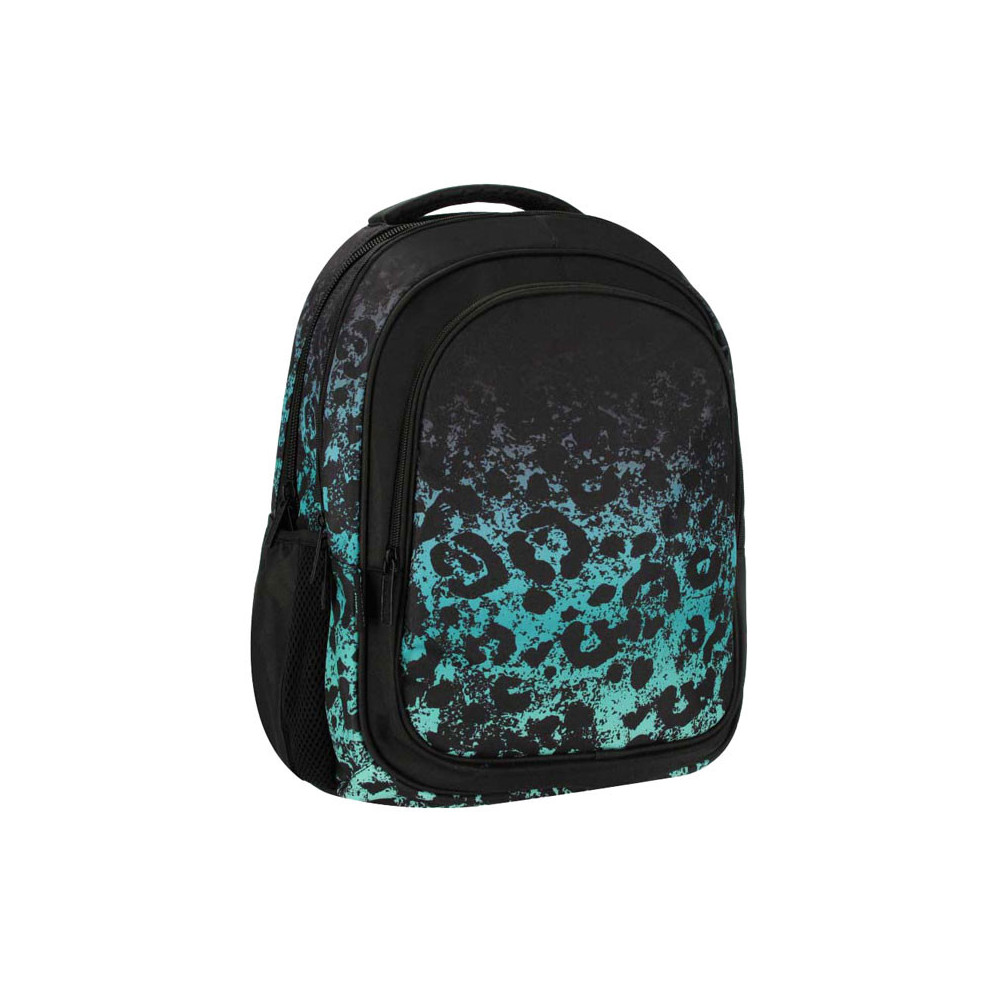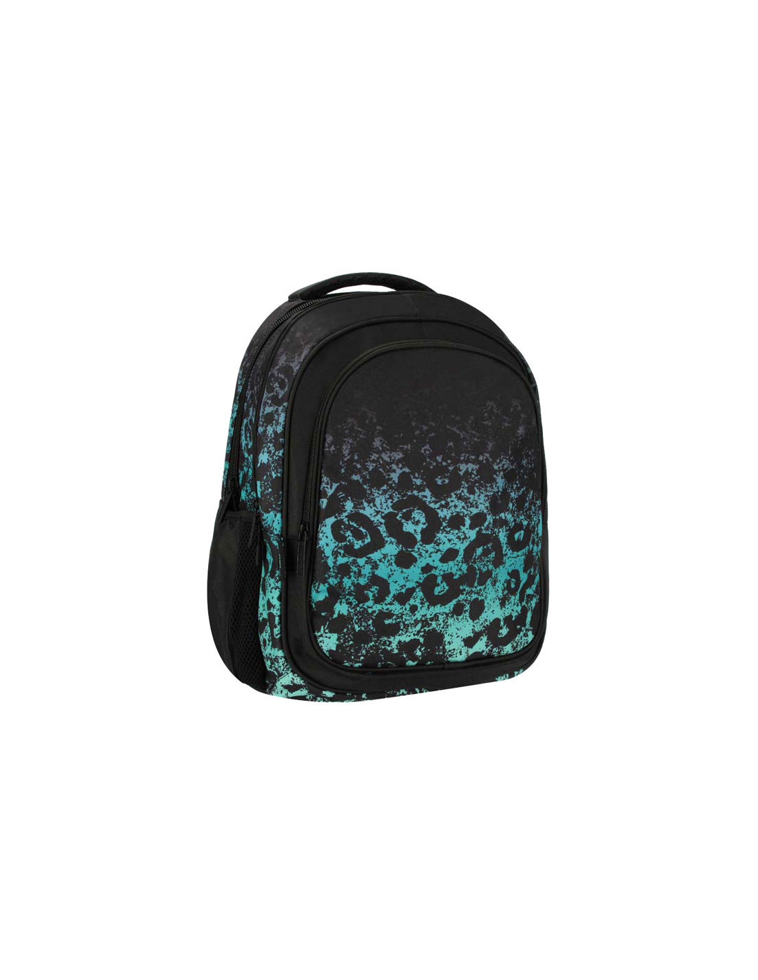 Rugtas met blauw zwarte panterprint. De tas heeft 3 vakken en 2 vakjes voor waterflessen.