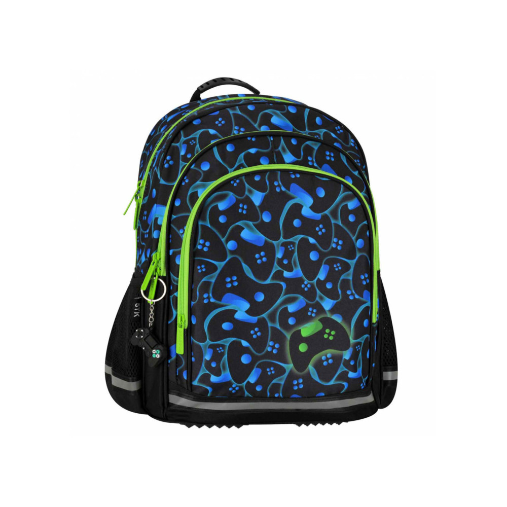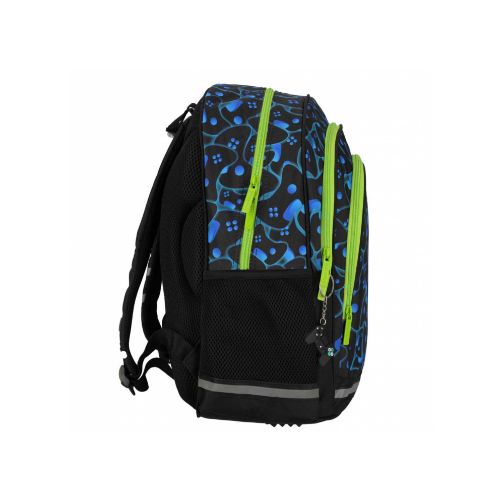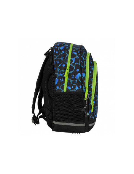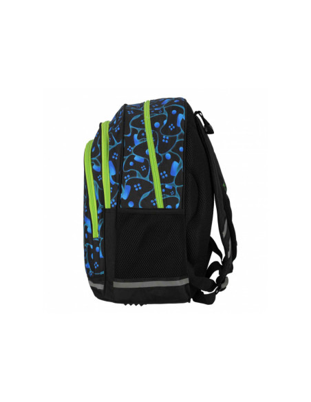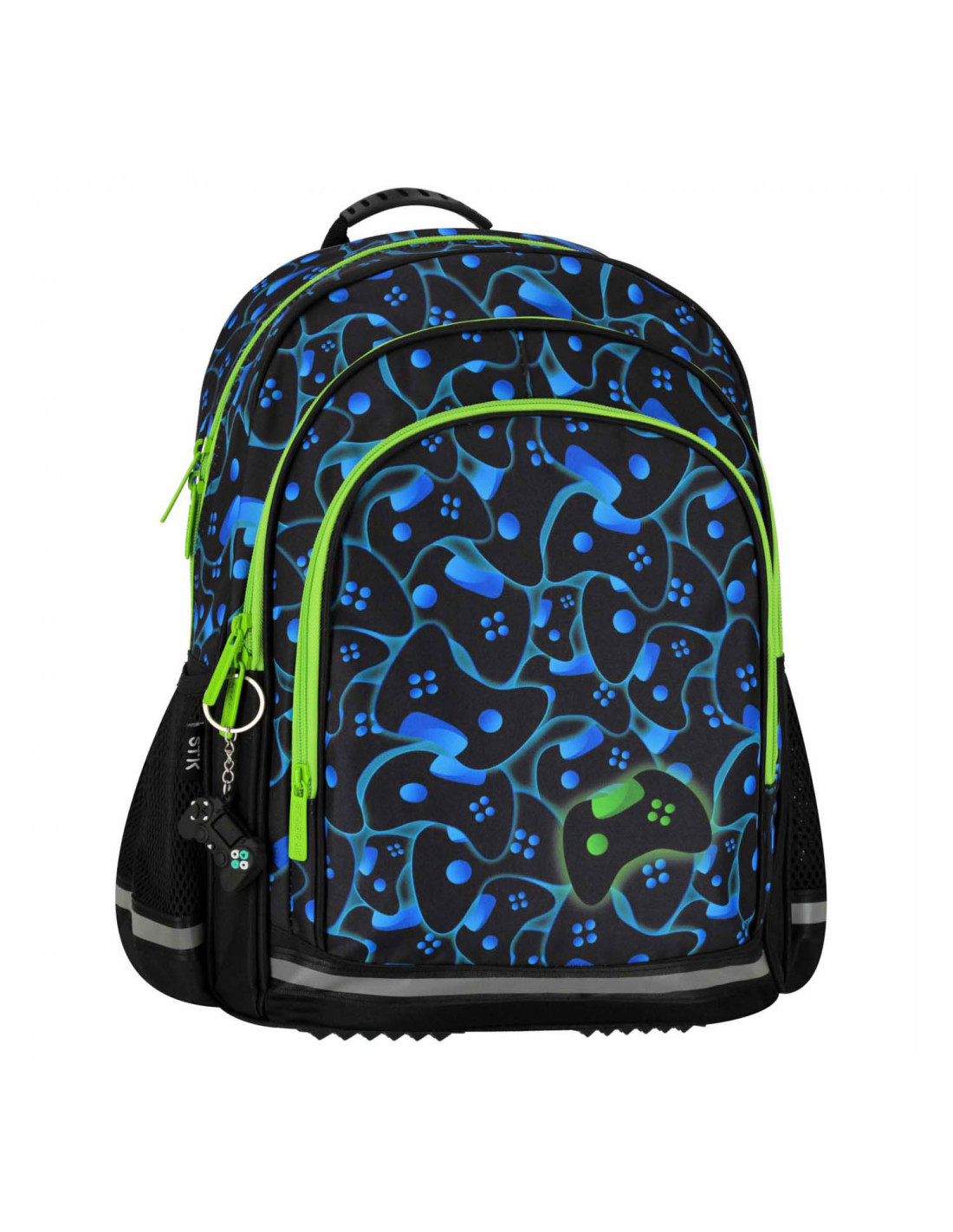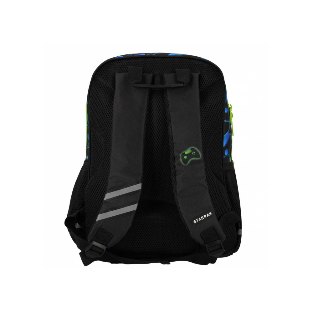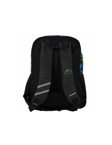 Zwart-blauwe STARPAK rugzak met gamepad-graphics, twee hoofdcompartimenten, ruime voorvakken en zijvakken met trekkoord. Met reflecterende strepen, sponsvulling en rubberen speelmat-hanger. Textielproduct van 40 x 29 x 20 cm, inhoud ca. 23 liter.