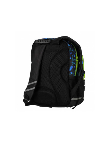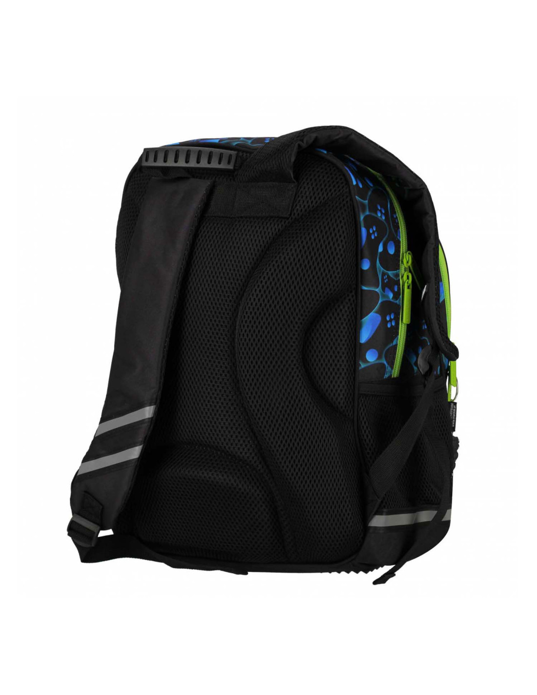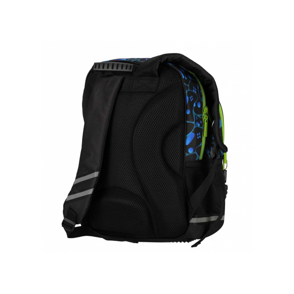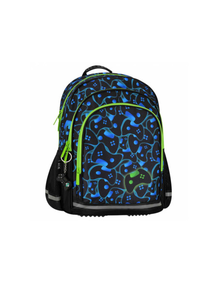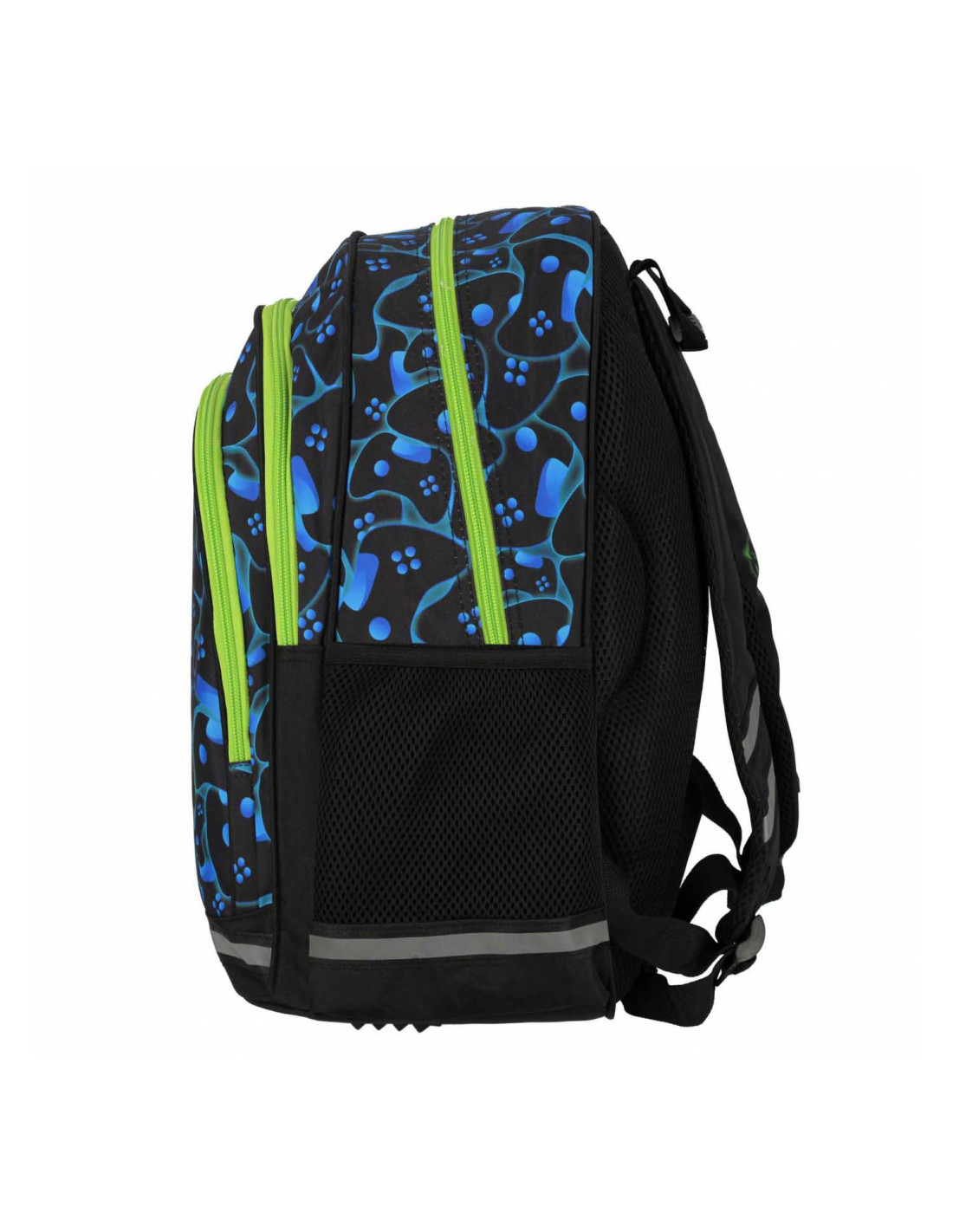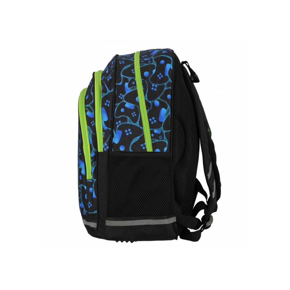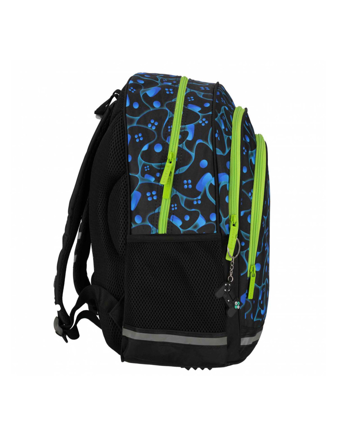 Zwart-blauwe STARPAK rugzak met gamepad-graphics, twee hoofdcompartimenten, ruime voorvakken en zijvakken met trekkoord. Met reflecterende strepen, sponsvulling en rubberen speelmat-hanger. Textielproduct van 40 x 29 x 20 cm, inhoud ca. 23 liter.