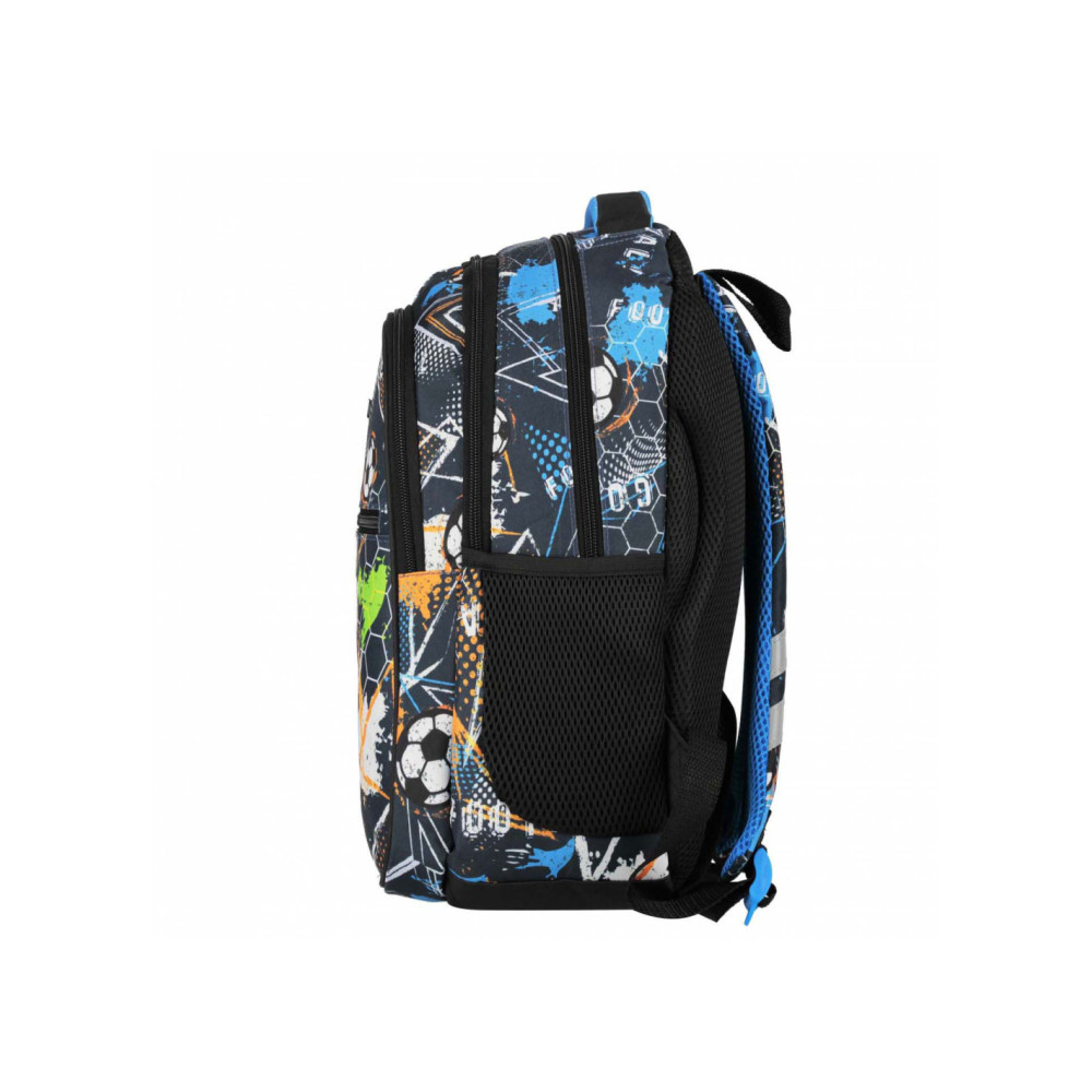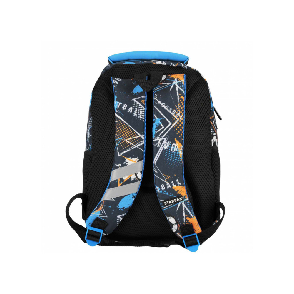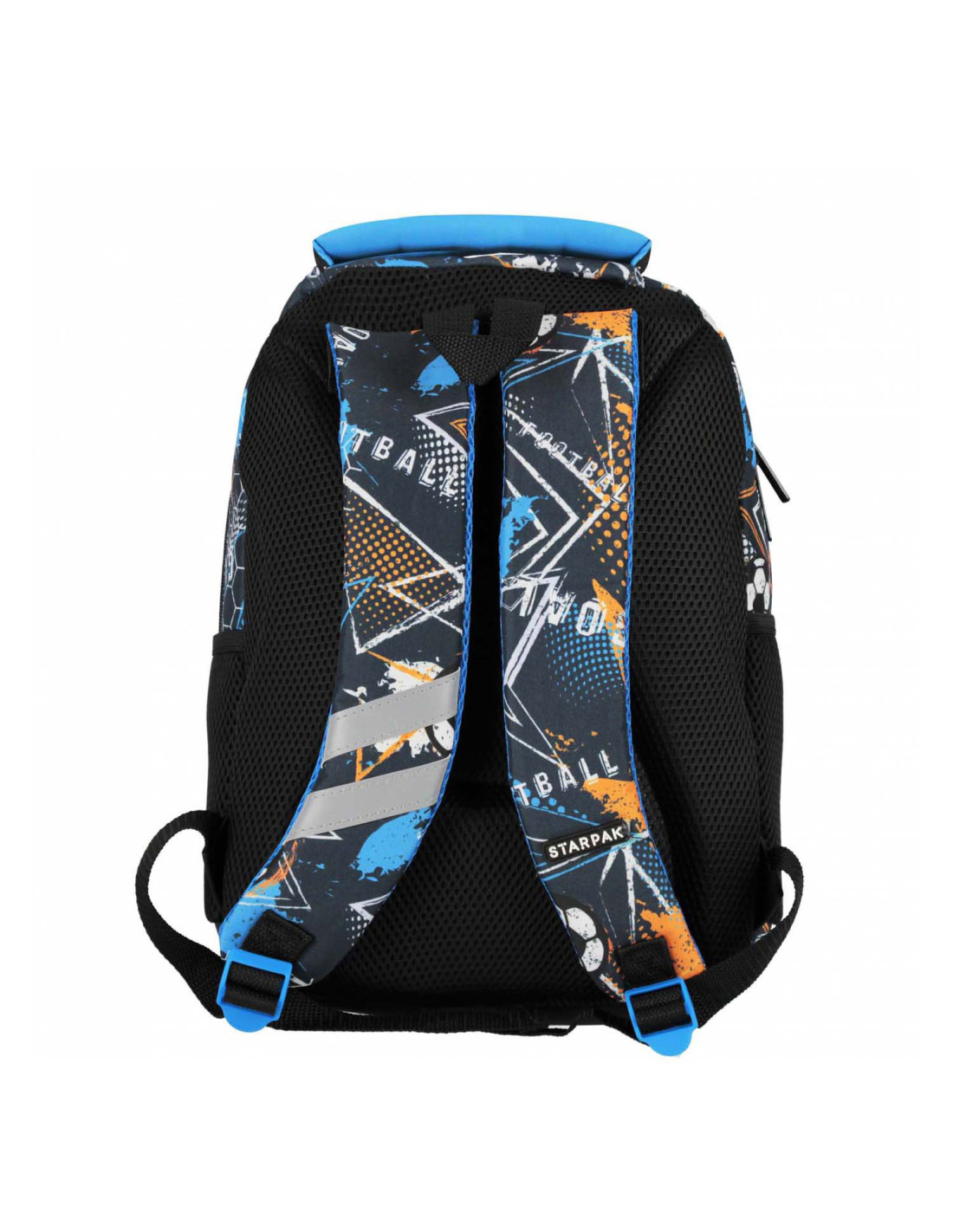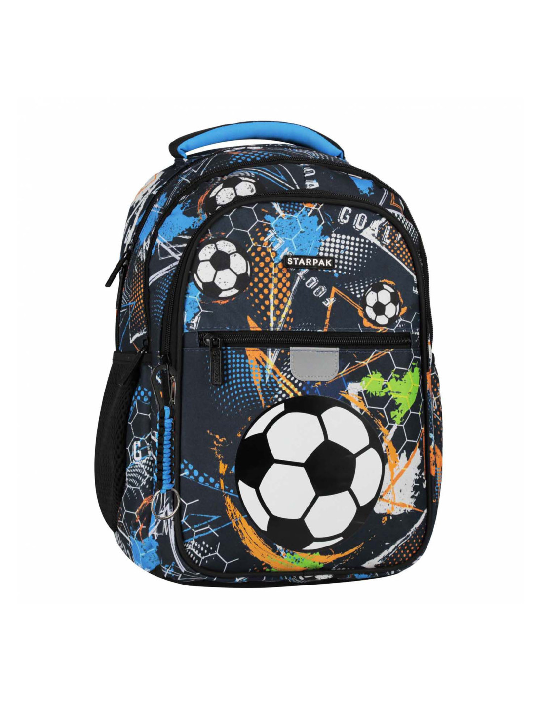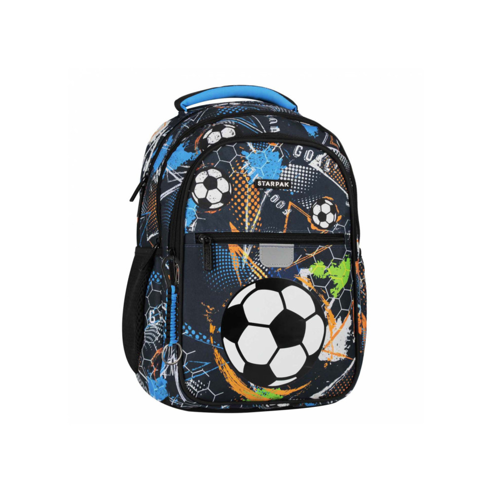 STARPak rugzak met voetbalprint, twee hoofdcompartimenten, voorvakken en zijvakken met trekkoord. Textielrugzak van 38 x 25 x 18 cm met 24 liter inhoud. Voorzien van reflecterende details.