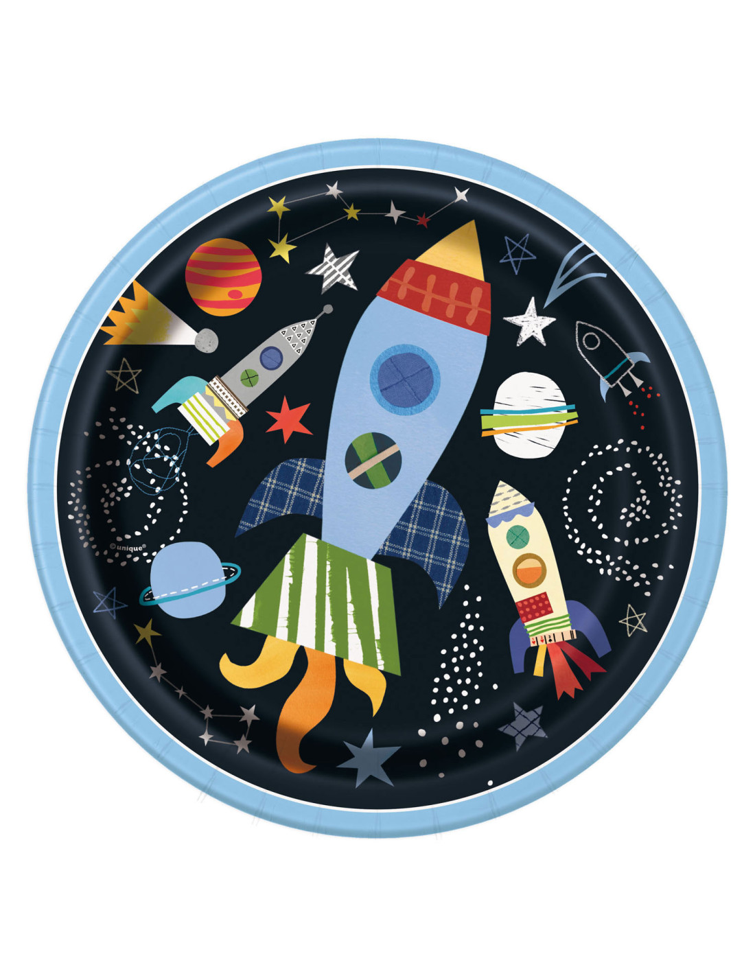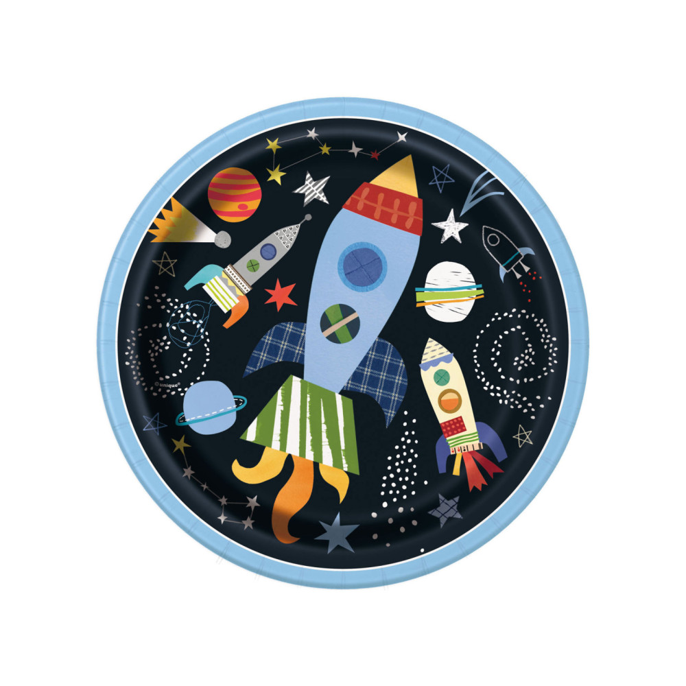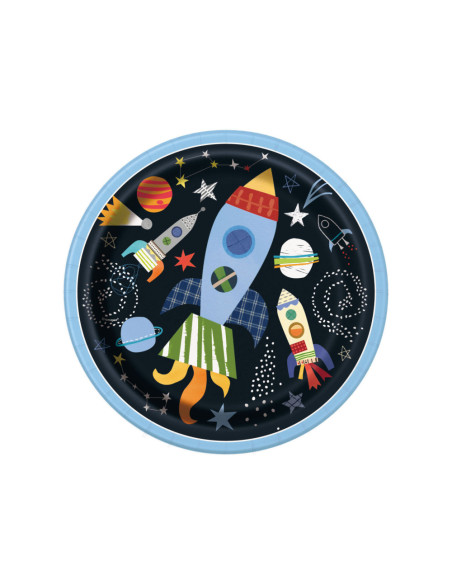 Papieren bordjes in ruimte/raketthema. De bordjes zijn 23 centimeter groot en zitten per 8 stuks verpakt.