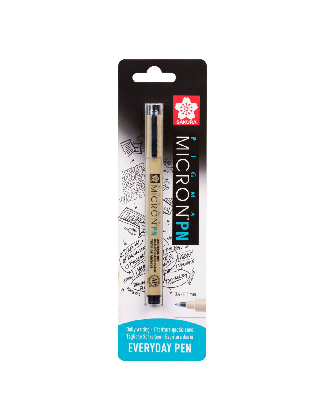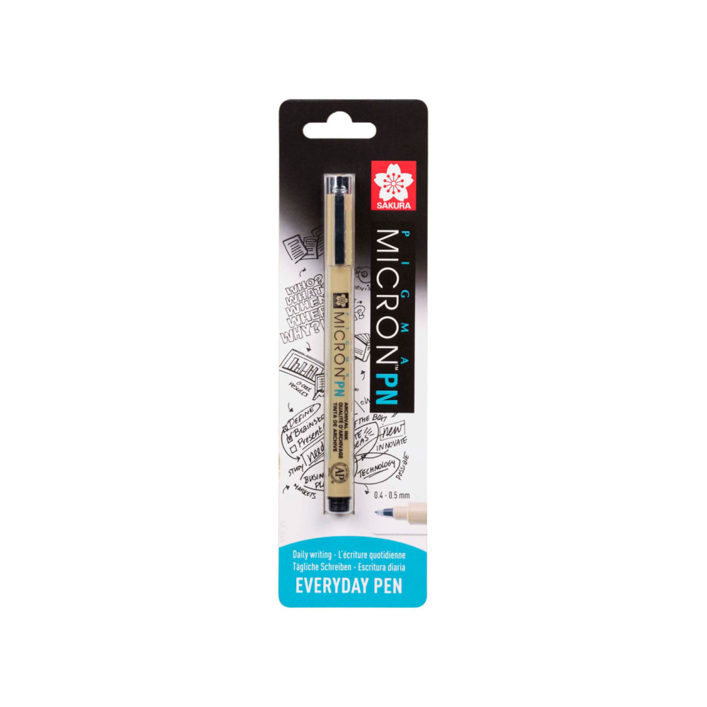 De Pigma Micron PN-pen heeft een punt die ideaal is voor alledaags multifunctioneel gebruik en dezelfde hoogwaardige Pigma-inkt in een diepzwarte kleur. De fijne punt maakt deze pen ideaal voor zowel technische als artistieke tekeningen. met de Pigma Micron PN met duurzame plastic punt (PN) kun je vloeiend schrijven of tekenen. De pen is verkrijgbaar in acht populaire Pigma-inktkleuren. De puntstructuur van polyacetaal zorgt voor een soepele inktstroom, bij snel of langzaam schrijven, voor rechts- of linkshandige gebruikers, en voor schrijven onder een hoek. Voor fijne tot medium lijndiktes (0,4/0,5 mm), afhankelijk van jouw schrijfstijl. De archiveerbare Pigma-inkt loopt niet door papier en is permanent, watervast, sneldrogend, pH-neutraal en vervaagt niet. De Pigma Micron PN-pen voor alledaags gebruik is verkrijgbaar in 8 kleuren.