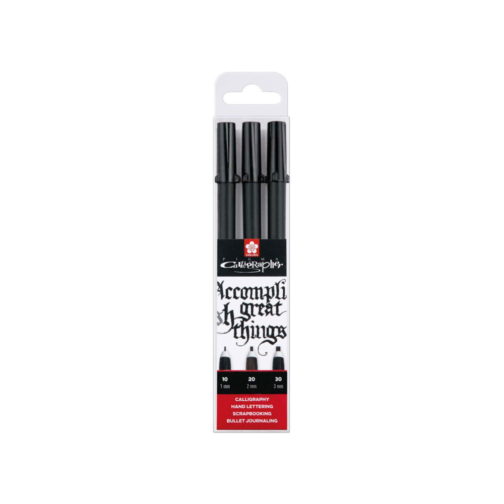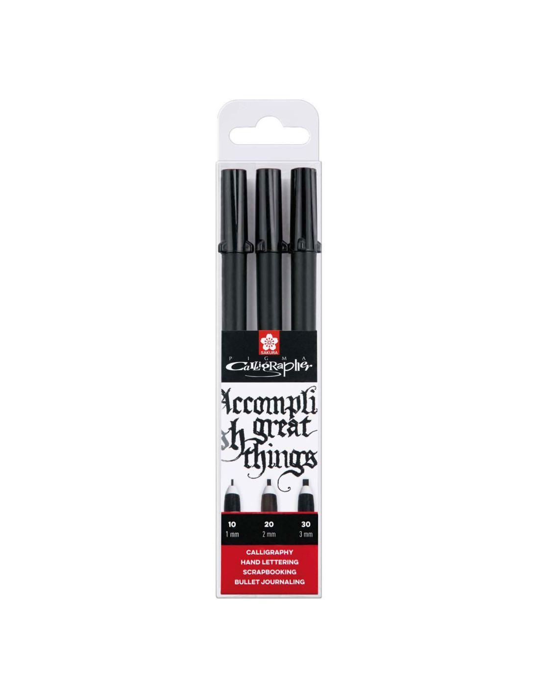 Sakura Pigma Calligrapher Pen-serie is speciaal ontworpen voor kalligrafen en letterkunstenaars van alle vaardigheidsniveaus. In tegenstelling tot de meeste kalligrafiestiften waarvan de punten bij gebruik slijten, wat resulteert in inconsistente, steeds zwaardere markeringen, behoudt de Pigma-kalligraaf zijn vermogen om voortdurend scherpe, vloeiende lijnen en lettervormen te creëren. Pigma-inkt is meer dan 30 jaar geleden uitgevonden door Sakura, is nog steeds de meest betrouwbare permanente inkt op de markt. Een op water gebaseerde formule van op pigment gebaseerde inkten, complexer dan op kleurstof gebaseerde inkten, chemisch stabiel, waterbestendig en bestand tegen vervaging. De Calligrapher Pen elimineert kostenbarrières en apparatuurvereisten voor beginners die net leren over kalligrafie, en biedt een gemakkelijk en snel alternatief voor traditionele kalligrafiepennen voor professionals. Deze set van 3 stuks bevat met de maten Pen 10 (1mm) Pen 20 (2mm) Pen 30 (3mm)