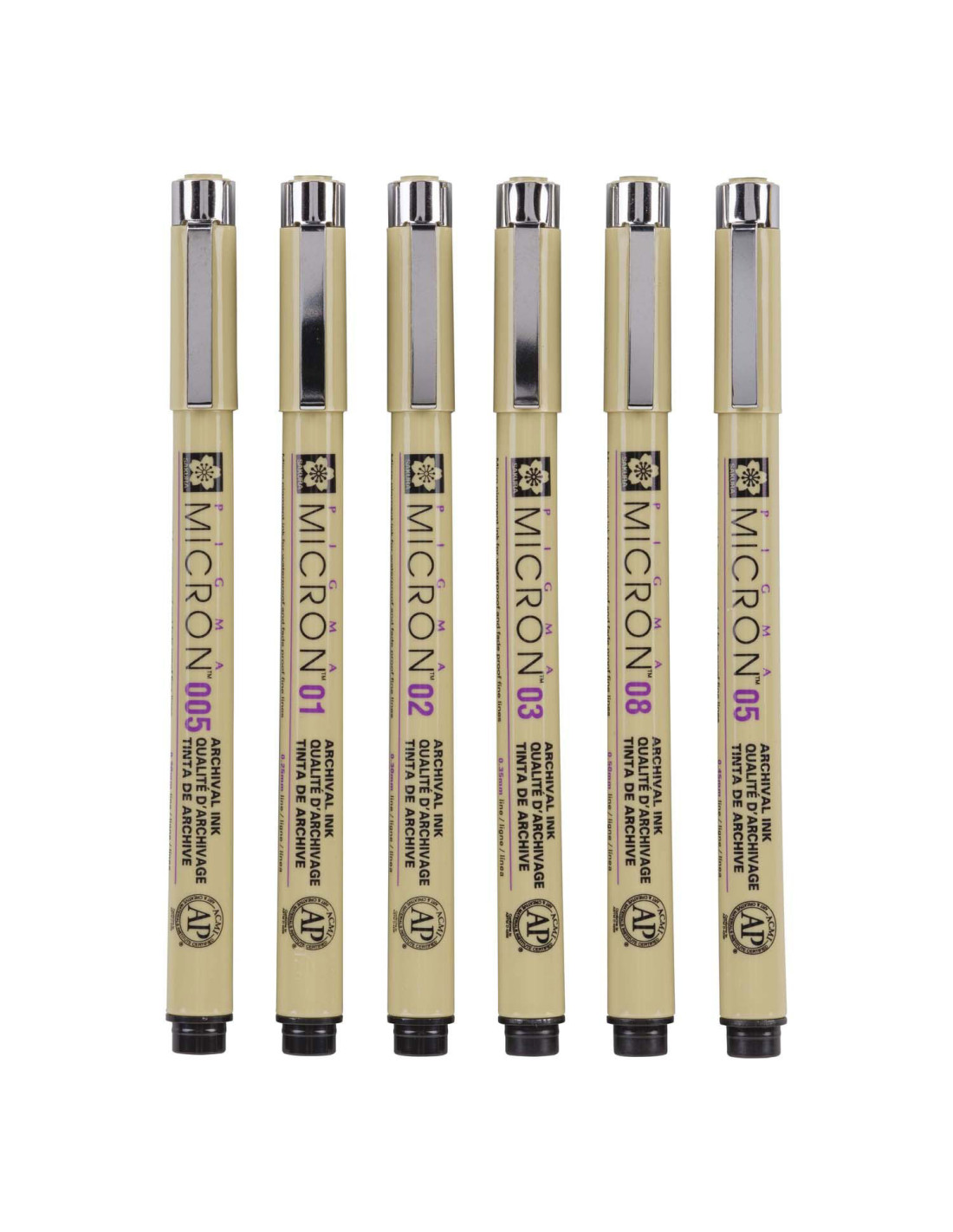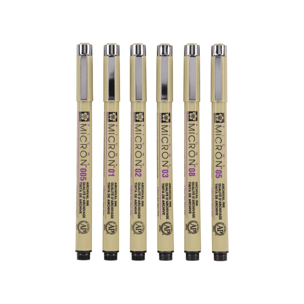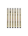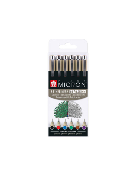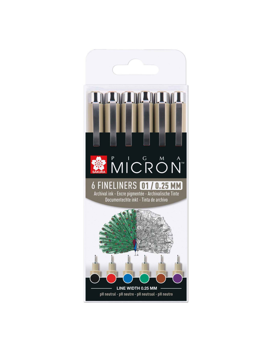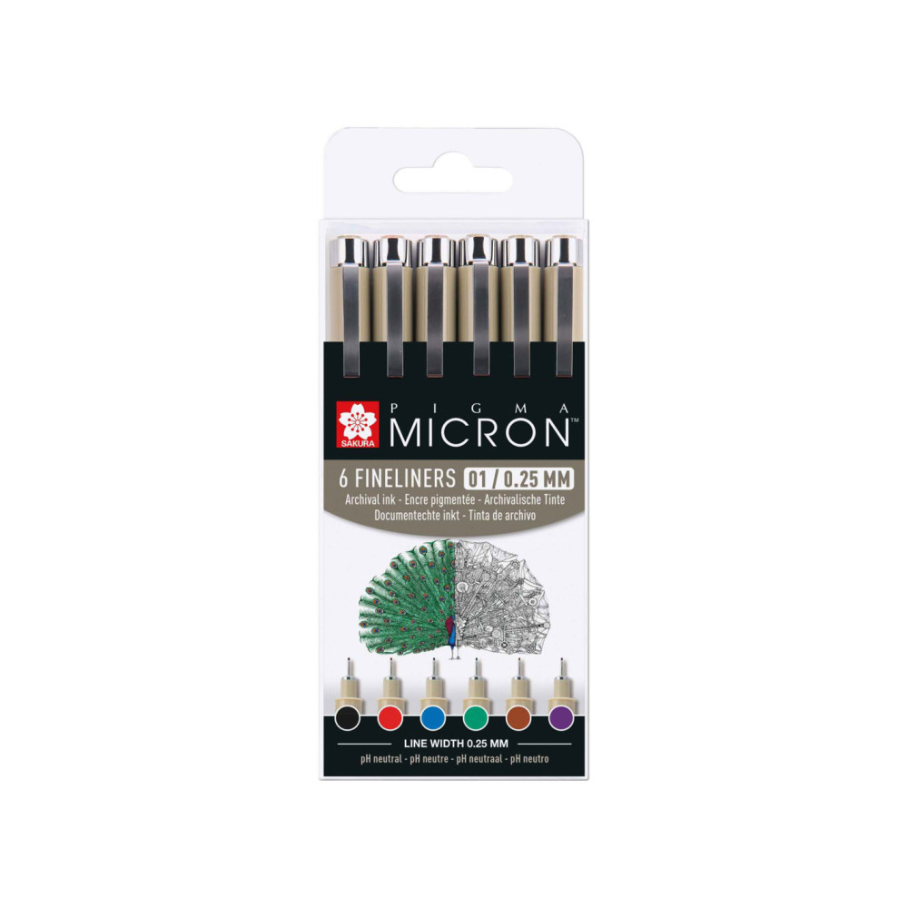 Set van 6 gekleurde Pigma Micron 01 0,25 mm fineliners.