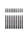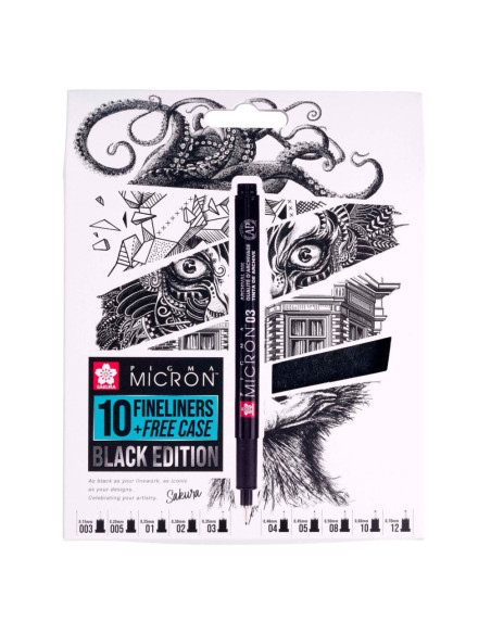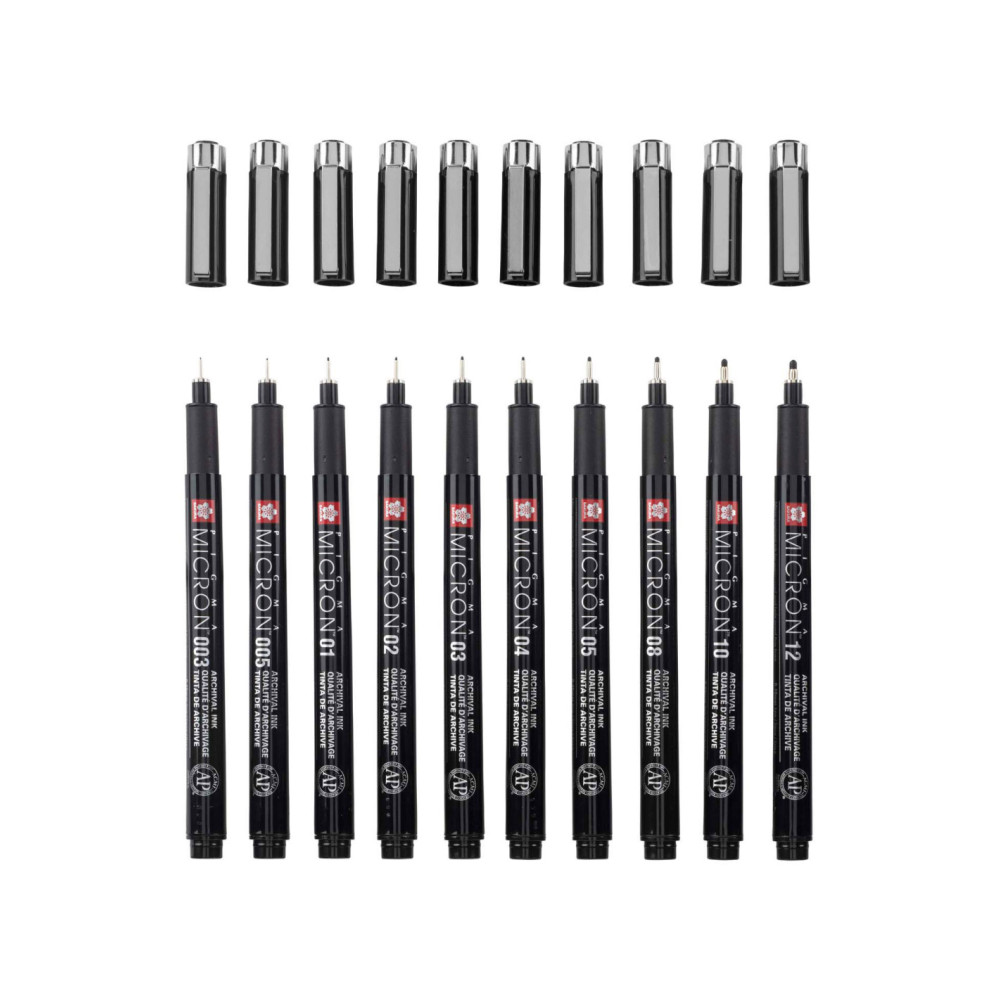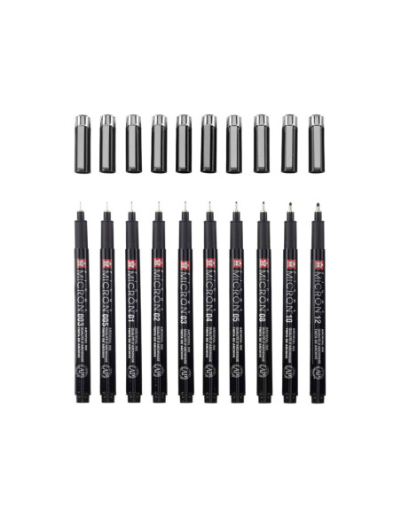 Deze set bevat Pigma Micron fineliners in alle verkrijgbare maten: 1x003 (0.15 mm), 1x005 (0.2 mm), 1x01 (0.25 mm), 1x02 (0.30 mm), 1x03 (0.35 mm), 1x04 (0.40 mm), 1x05 (0.45 mm), 1x08 (0.50 mm), 1x10 (0.60 mm) en 1x 12 (0.70 mm).