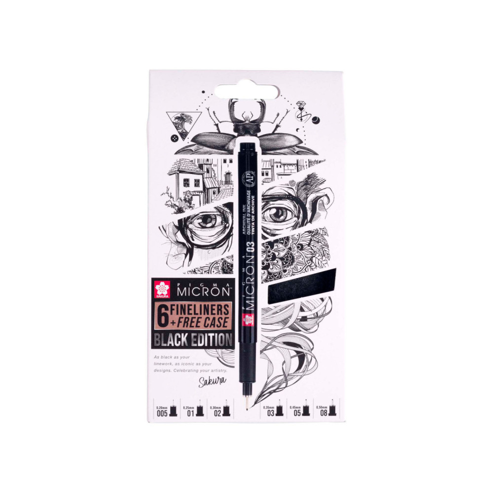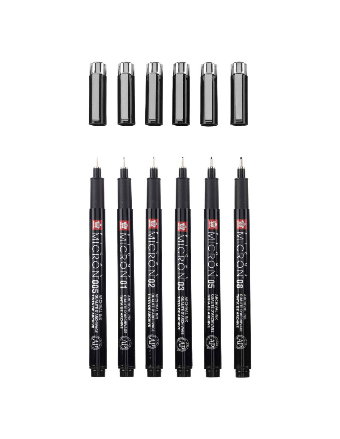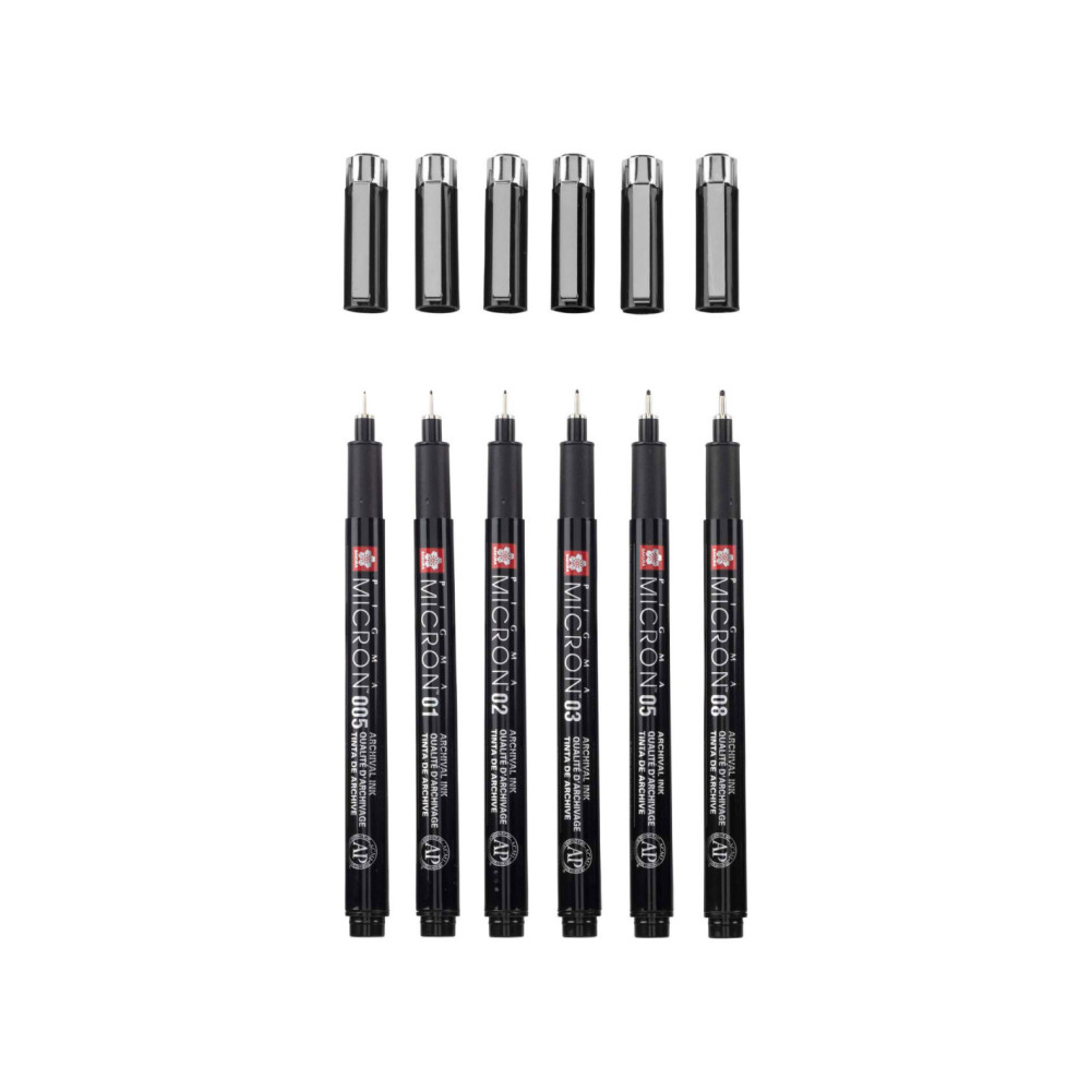 Deze set bevat 6 Pigma Micron fineliners in de populairste maten: 1x005 (0.2 mm), 1x01 (0.25 mm), 1x02 (0.30 mm), 1x03 (0.35 mm), 1x05 (0.45 mm) en 1x08 (0.50 mm).