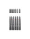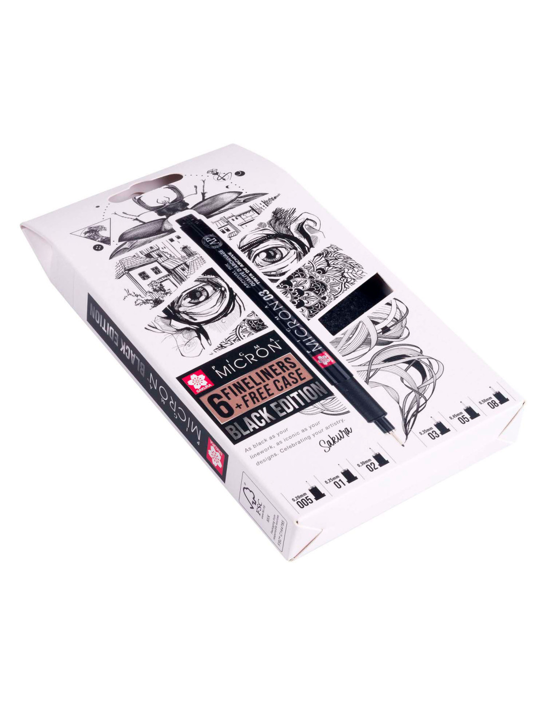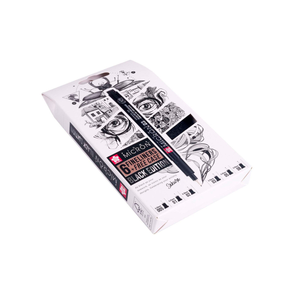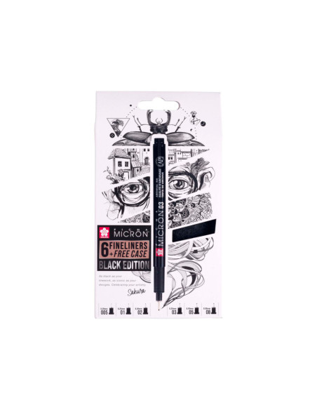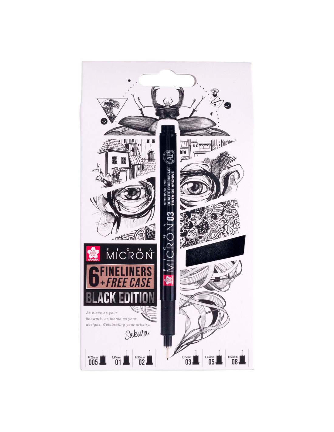 Deze set bevat 6 Pigma Micron fineliners in de populairste maten: 1x005 (0.2 mm), 1x01 (0.25 mm), 1x02 (0.30 mm), 1x03 (0.35 mm), 1x05 (0.45 mm) en 1x08 (0.50 mm).