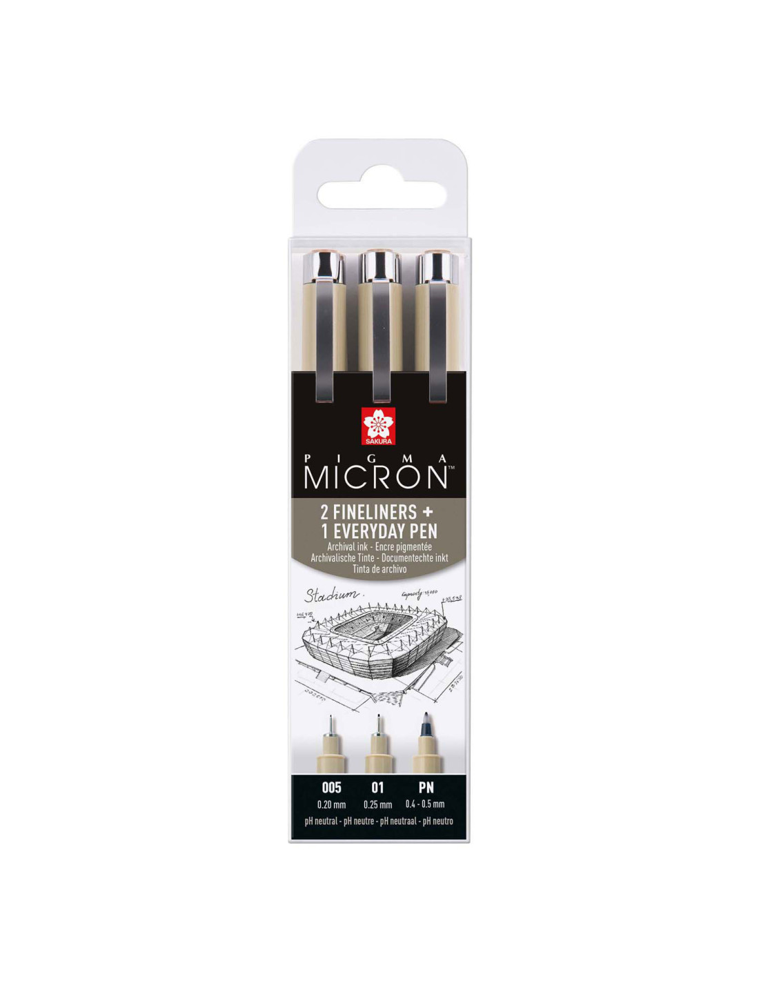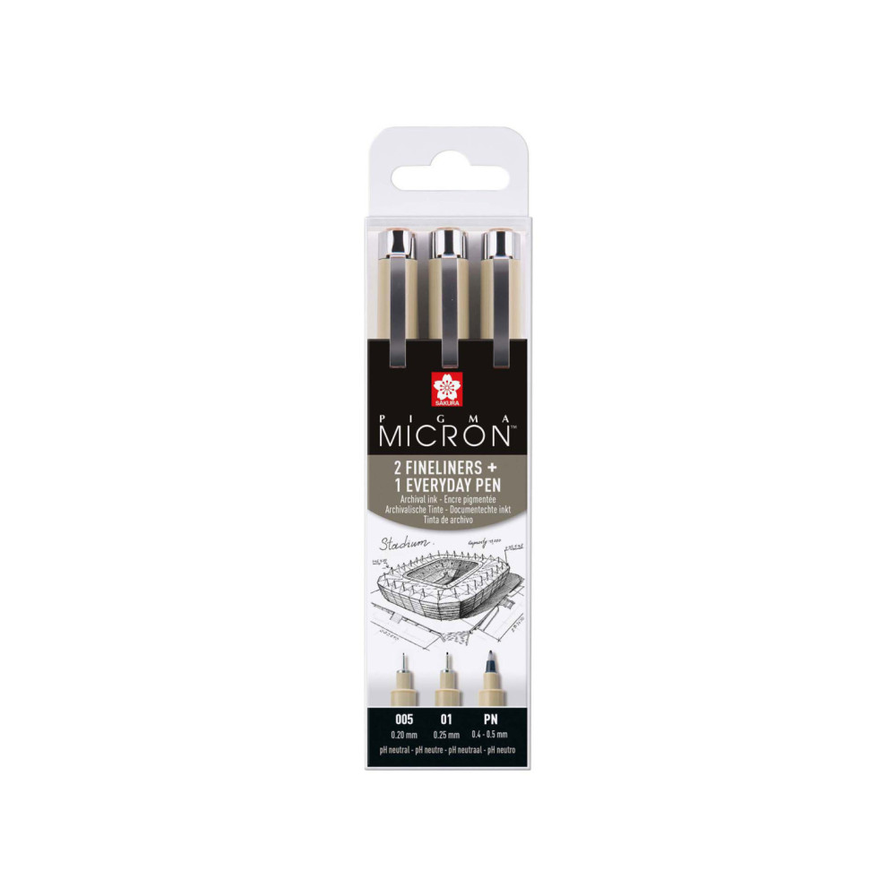 De set bevat 1 Pigma Micron 005 0,2 mm, 1 Pigma Micron 01 0,25 mm en 1 Pigma Micron PN.