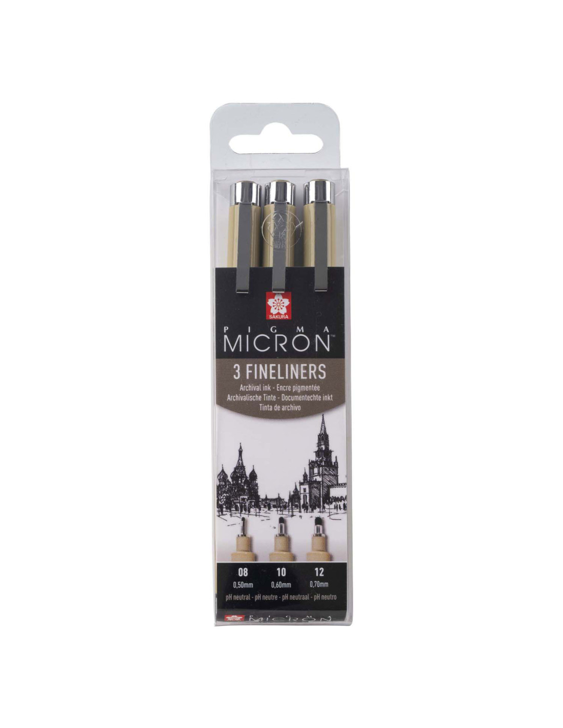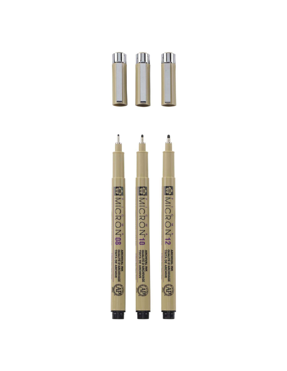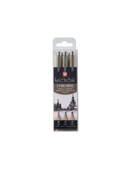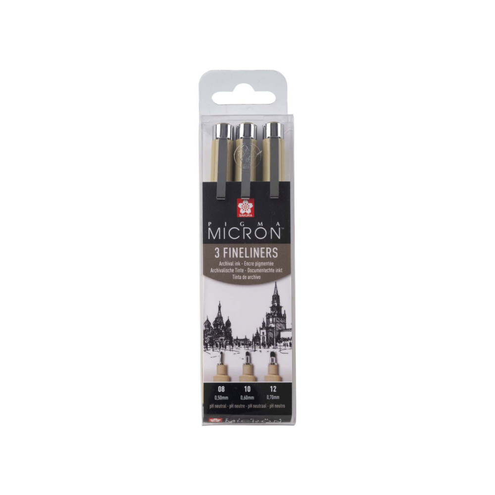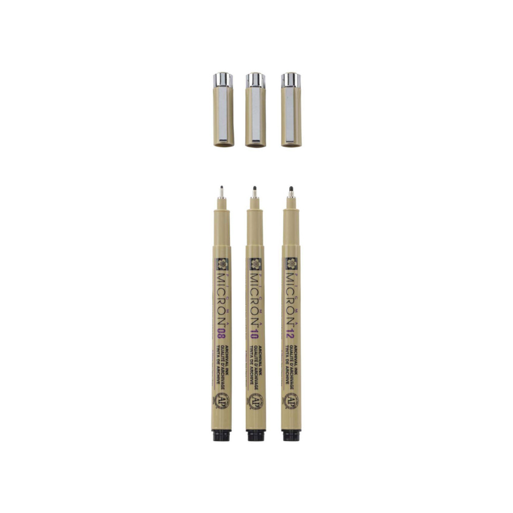Selectie van 3 zwarte Pigma Micron-pennen met de grootste puntdiktes uit dit assortiment: 1x08 (0,50 mm), 1x10 (0,60 mm), 1x 12 (0,70 mm).