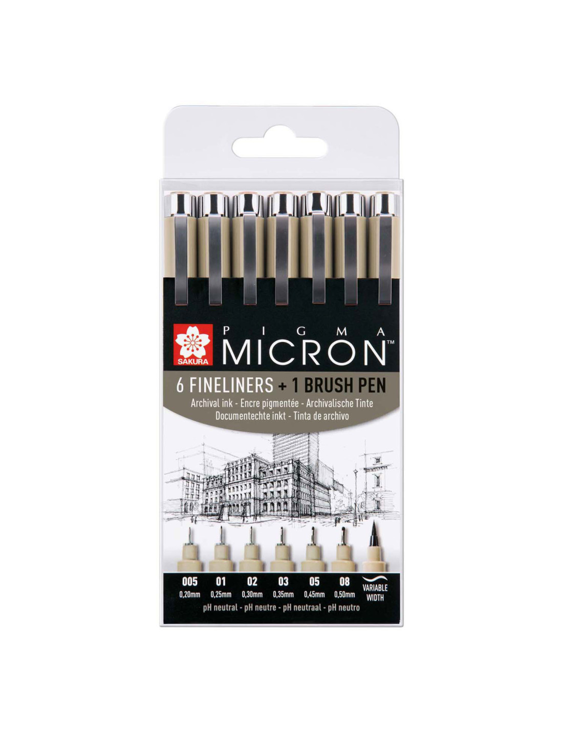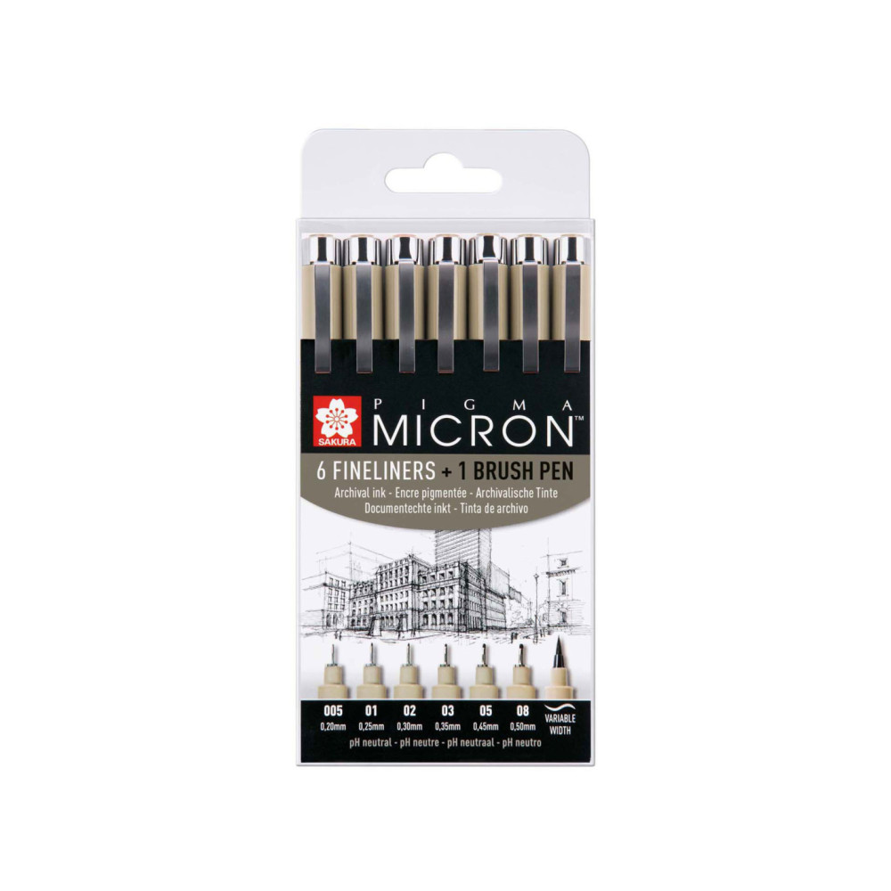 De set bevat 1 Pigma Micron 005 (0,2 mm), 1 Pigma Micron 01 (0,25 mm), 1 Pigma Micron 02 (0,30 mm), 1 Pigma Micron 03 (0,35 mm), 1 Pigma Micron 05 (0,45 mm), 1 Pigma Micron 08 (0,50 mm) en 1 Pigma Penseel-pen.