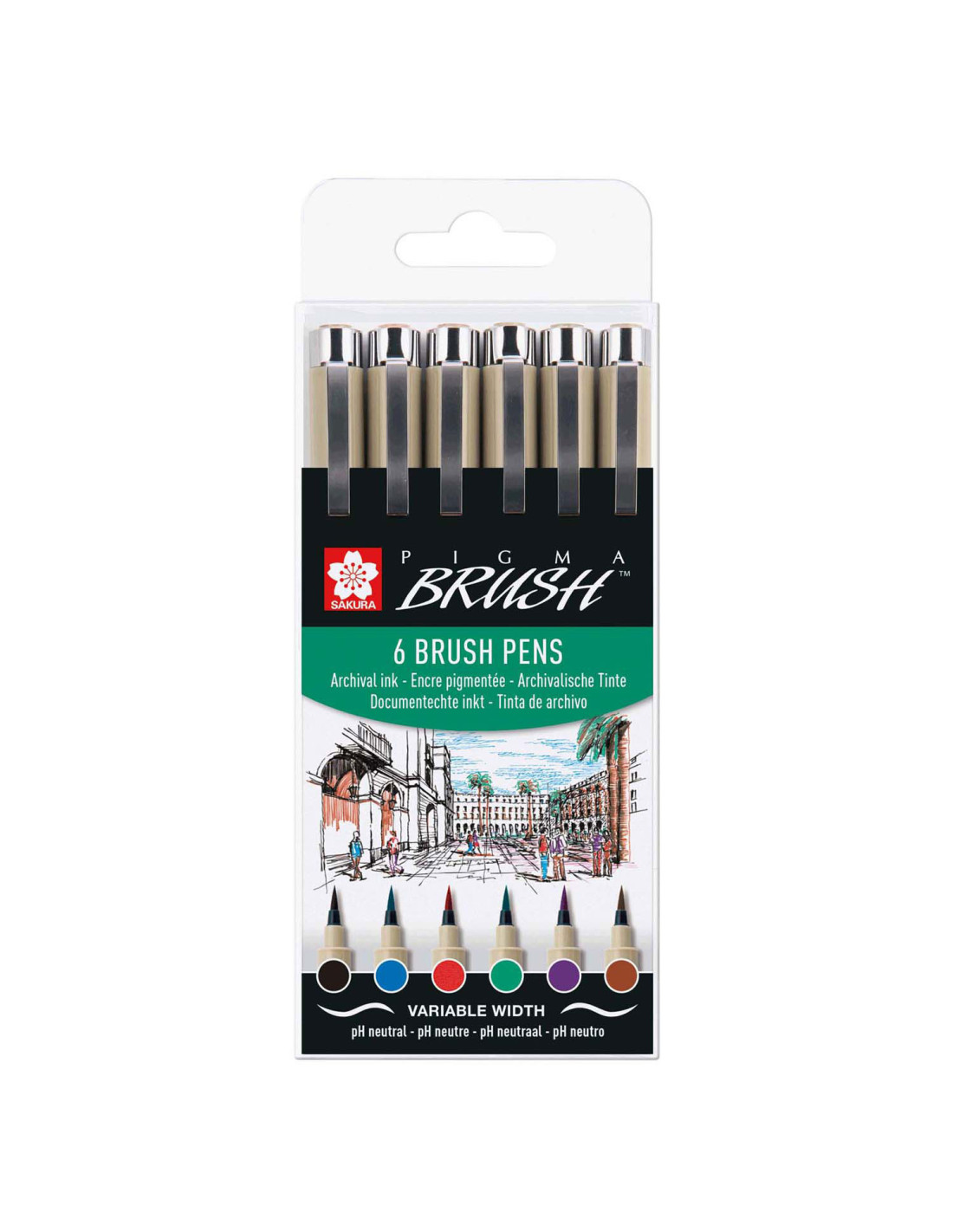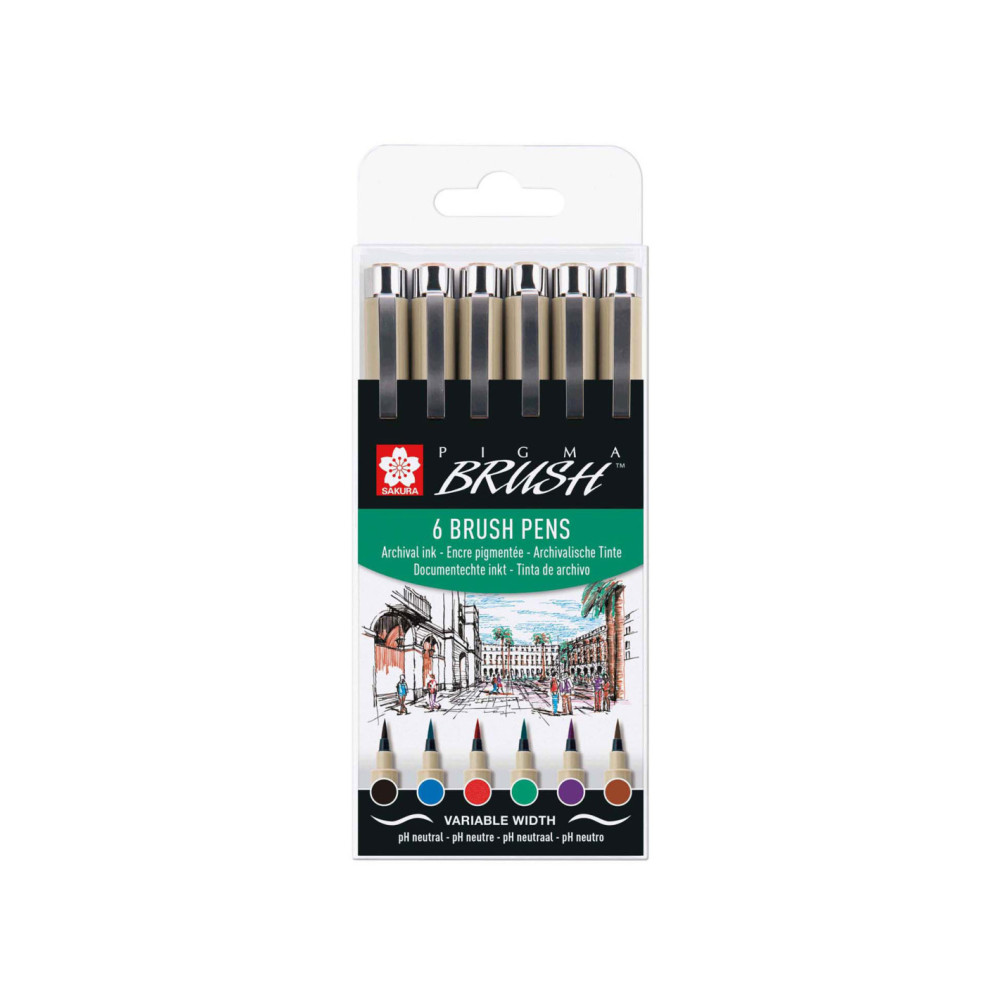 Inhoud van deze PIGMA Penseel-set: 6 Pigma Penselen in de kleuren Bruin (12), Rood (19), Paars (24), Groen (29), Blauw (36), Zwart (49).