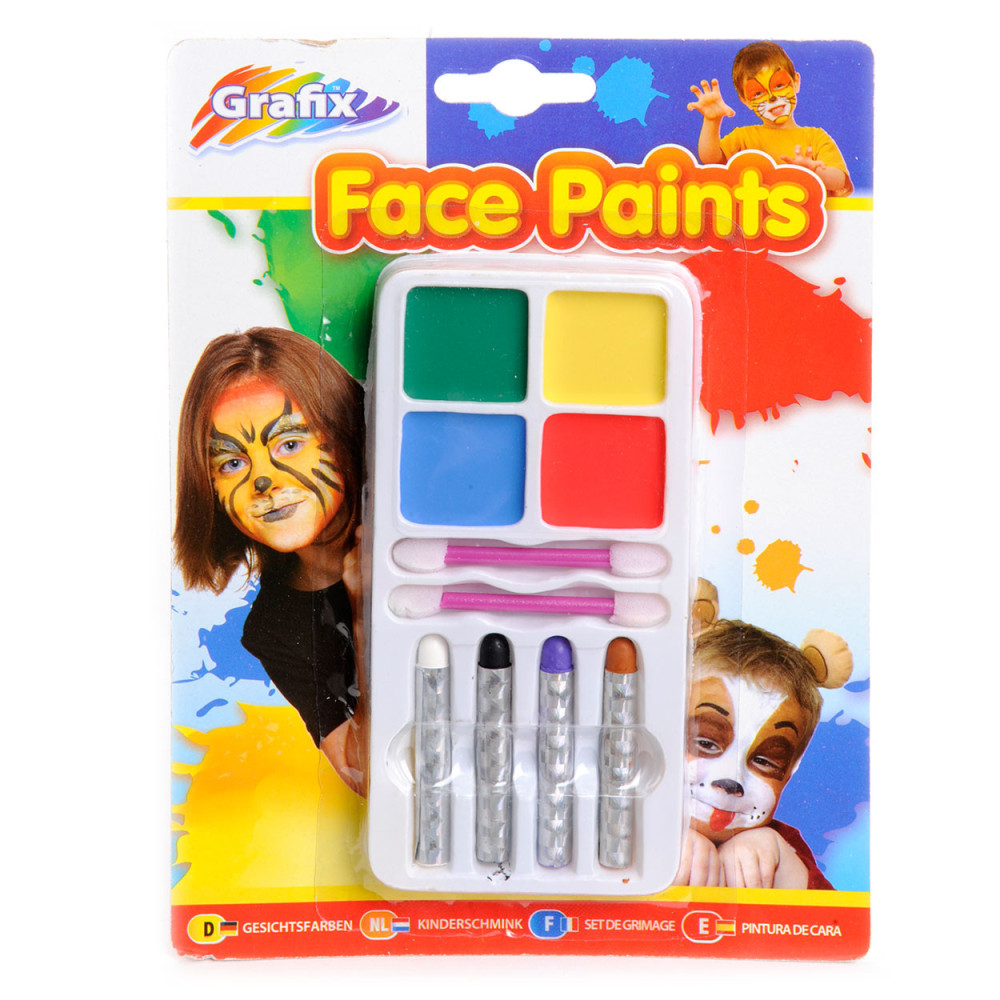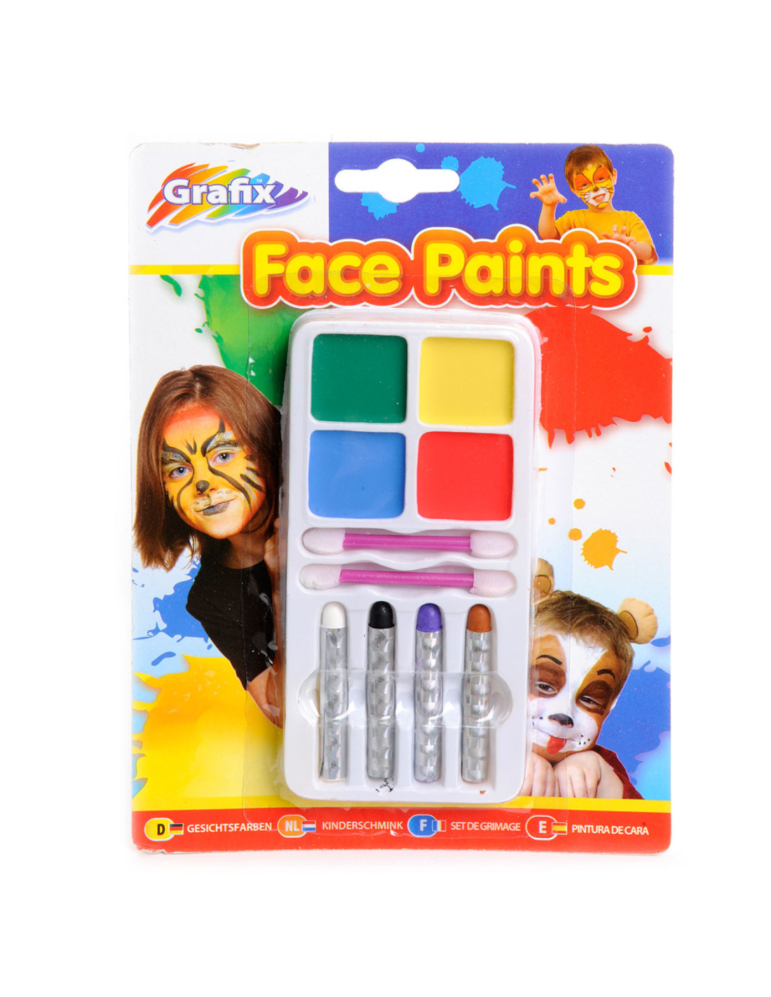 10 delige schminckset. 4 kleuren schmink, 4 potloden en 2 aanbrengkwastjes.