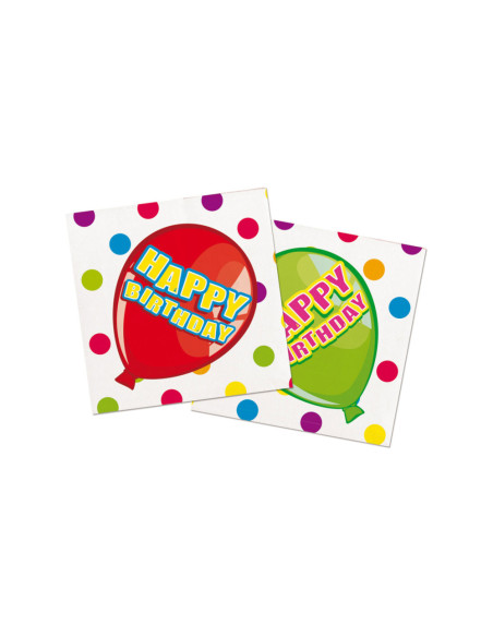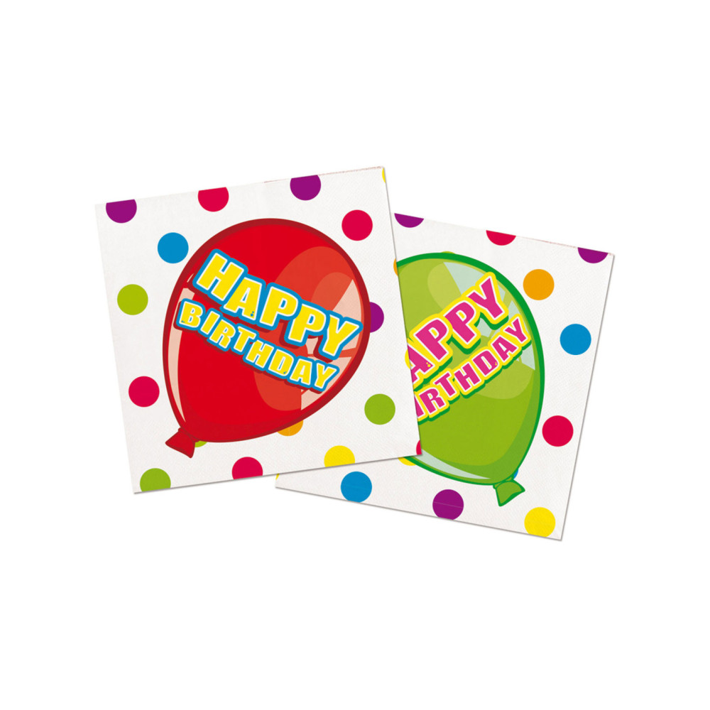 Set van 16 gekleurde servetten met de tekst happy birthday. De servetten zijn 25 x 25 cm groot.