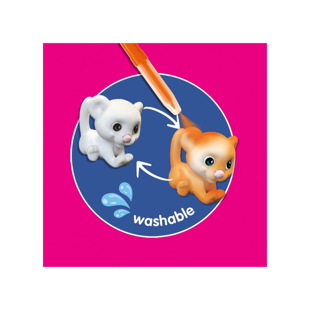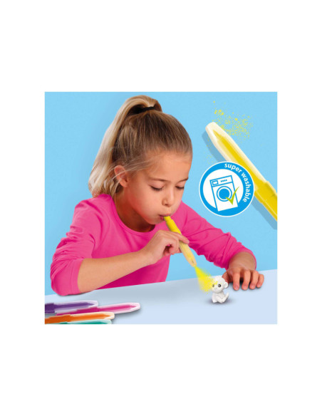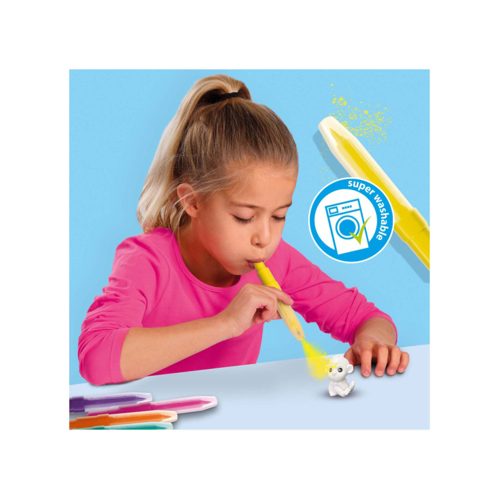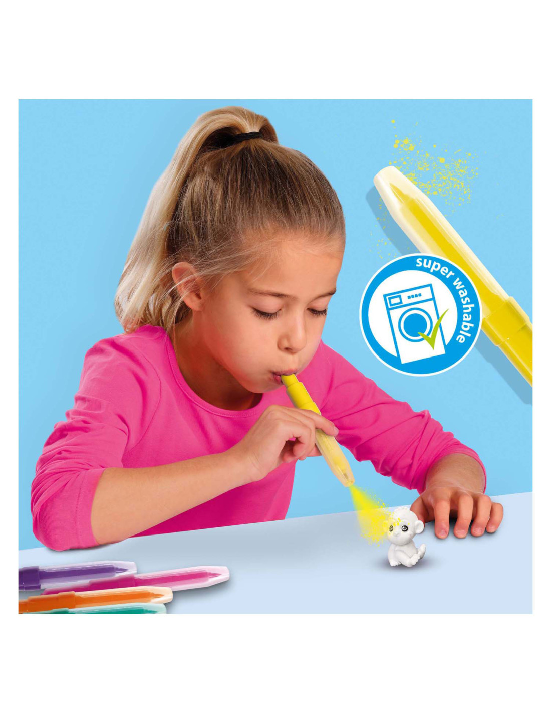 Ontdek creatief plezier met de Blow airbrush pens - Safari dieren! Versier 6 verschillende schattige safari dieren, een zebra, aap, giraffe, tijger, panter en hert, met de 5 meegeleverde blaas airbrush viltstiften in turquoise, geel, oranje, paars en roze. Gebruik de kleuren als gewone viltstiften of maak mooie spray effecten door de stiften in de blow airbrush houders te plaatsen. Gebruik de zwarte viltstift om extra details aan te brengen. Na het kleuren zijn de figuren afwasbaar, zodat je ze keer op keer opnieuw kunt decoreren. Perfect voor kinderen die houden van knutselen en dieren!