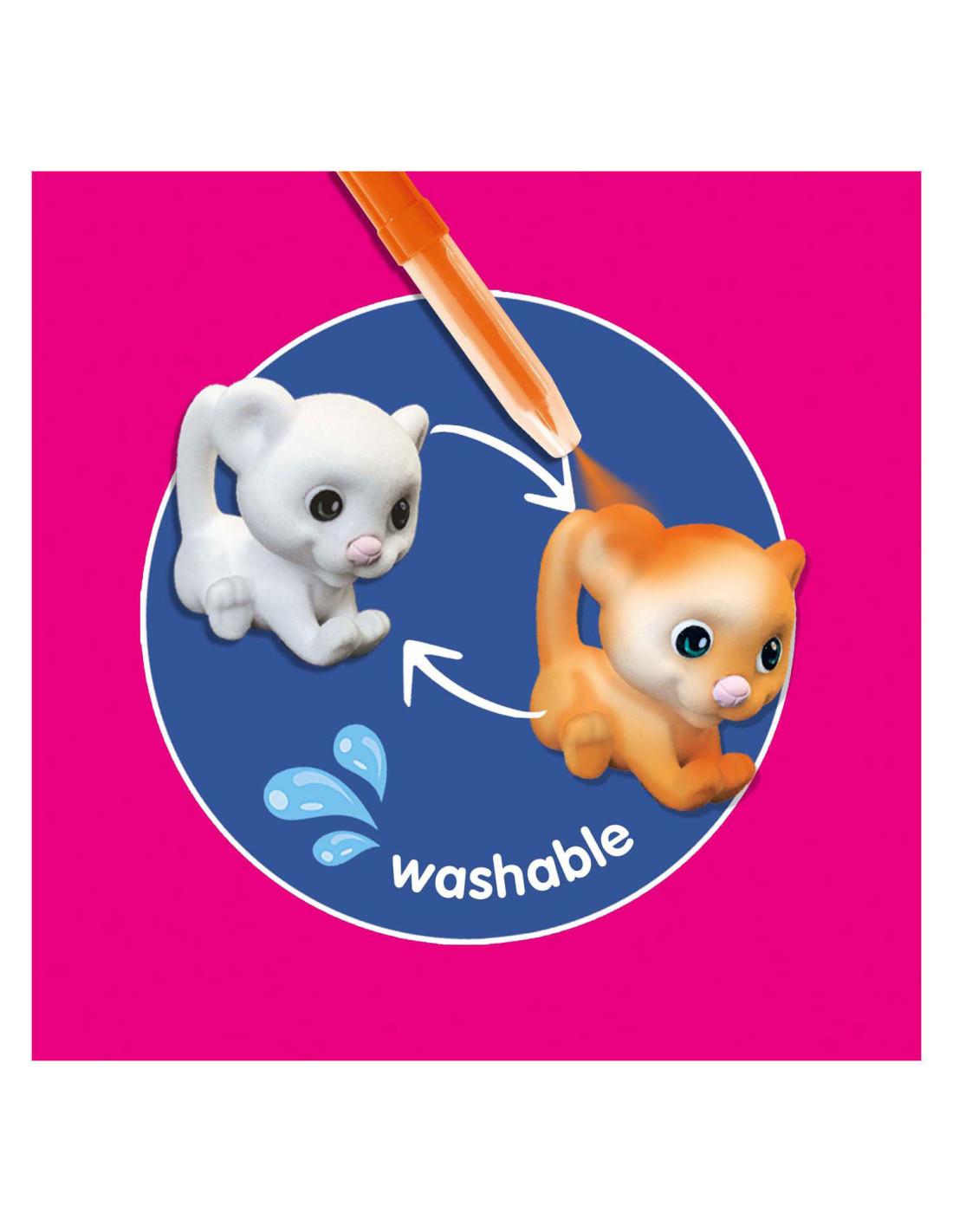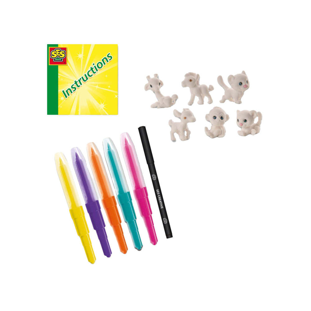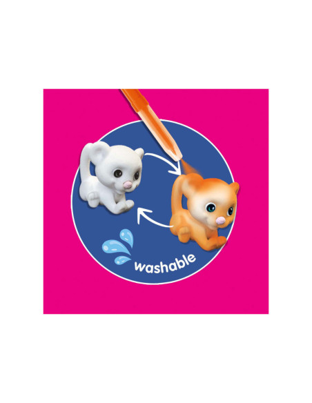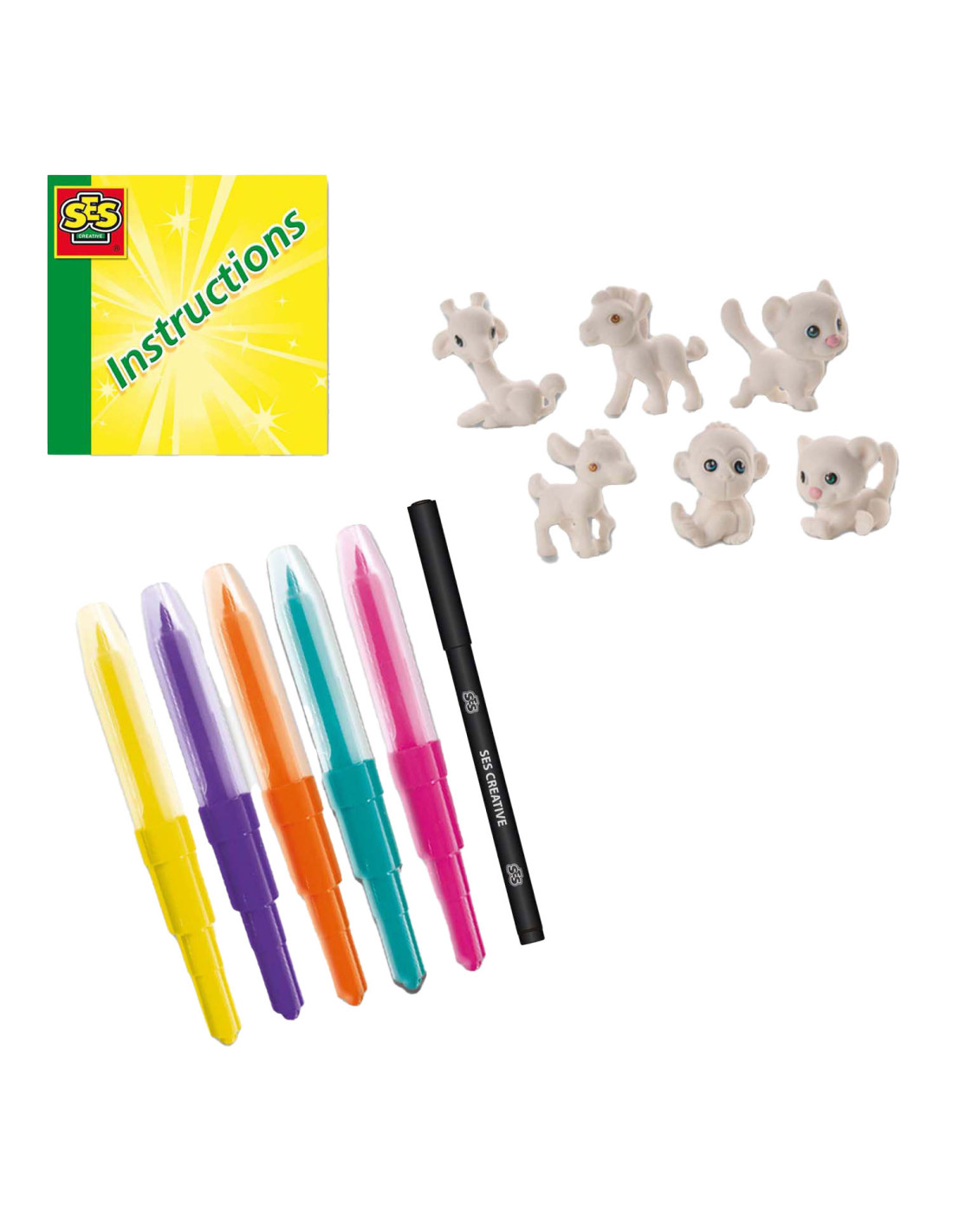 Ontdek creatief plezier met de Blow airbrush pens - Safari dieren! Versier 6 verschillende schattige safari dieren, een zebra, aap, giraffe, tijger, panter en hert, met de 5 meegeleverde blaas airbrush viltstiften in turquoise, geel, oranje, paars en roze. Gebruik de kleuren als gewone viltstiften of maak mooie spray effecten door de stiften in de blow airbrush houders te plaatsen. Gebruik de zwarte viltstift om extra details aan te brengen. Na het kleuren zijn de figuren afwasbaar, zodat je ze keer op keer opnieuw kunt decoreren. Perfect voor kinderen die houden van knutselen en dieren!