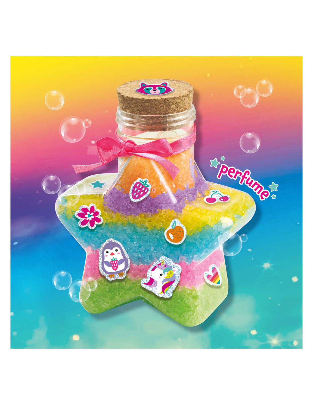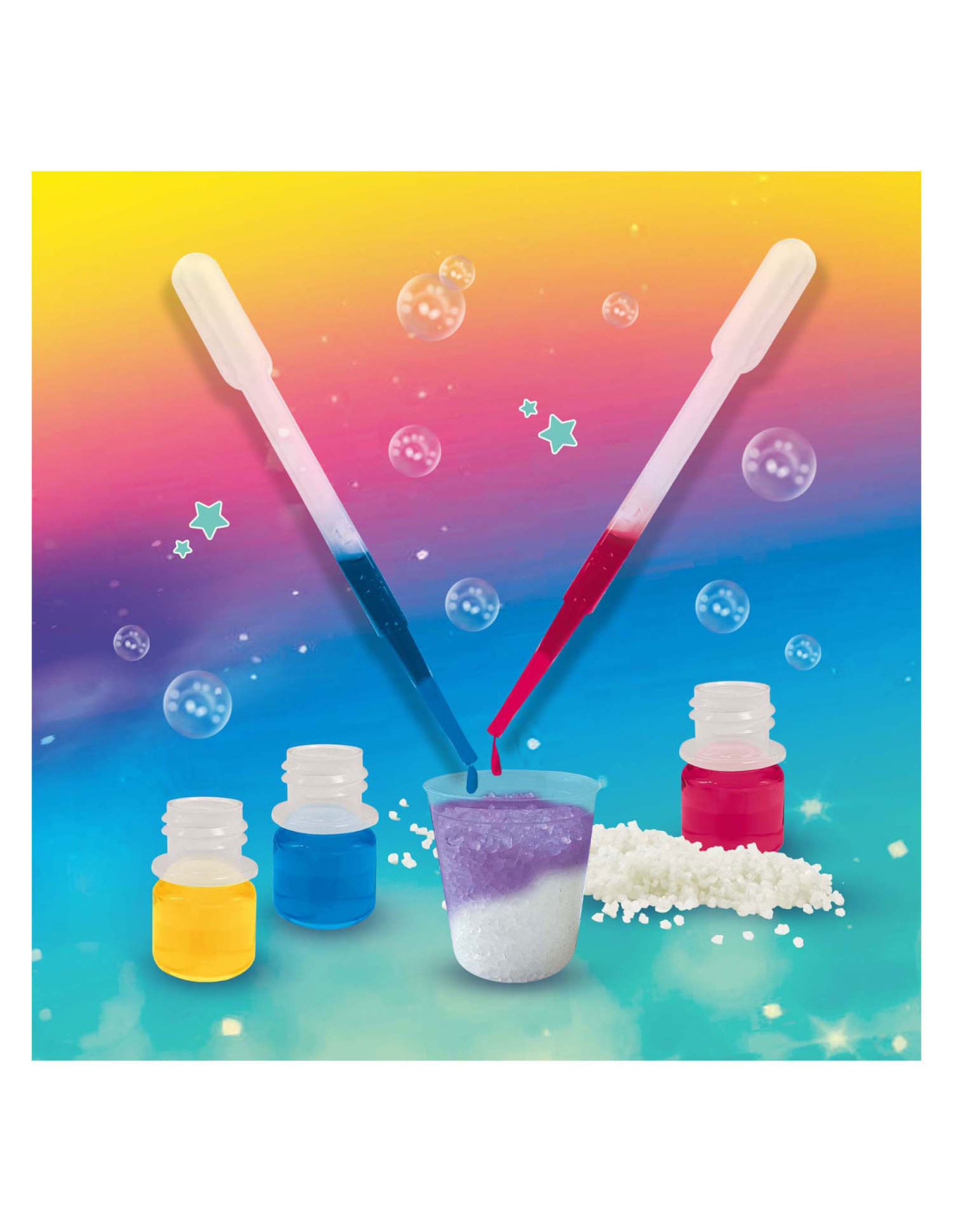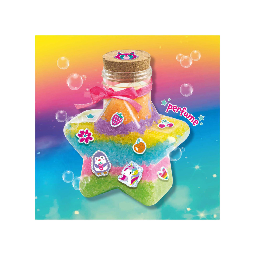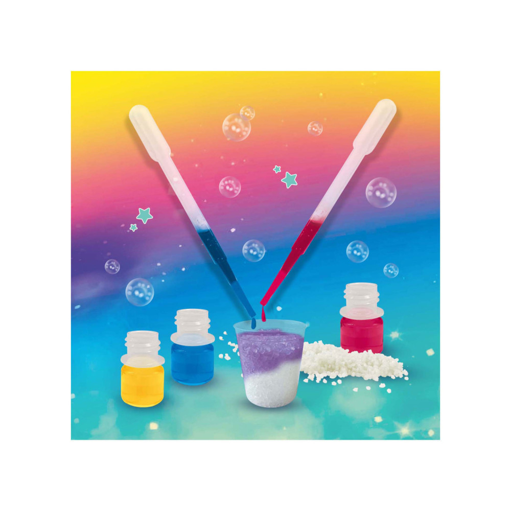 Creëer je eigen magisch Galaxy badzout! Met deze lab set kun je zelf badzout kleuren en parfumeren. Maak verschillende kleuren badzout door steeds wat badzoutkorrels te mengen met gekleurde parfum. Door de rode, gele en blauwe parfum te mengen ontstaan verschillende zoete geuren en mengkleuren. Gebruik de maatbeker, pipetjes en het roerstokje voor nauwkeurig doseren en mengen. Giet elke gemaakte kleur in de stervormige bewaarfles en creëer zo prachtig gekleurde lagen. Sluit de fles af met de kurken dop en versier jouw magische badzout met glitterstickers en lint.Dit prachtige, zelfgemaakte badzout is goed afwasbaar, cosmetisch en veilig te gebruiken. Perfect voor kinderen die van experimenteren houden!