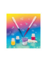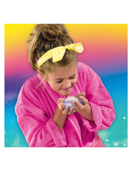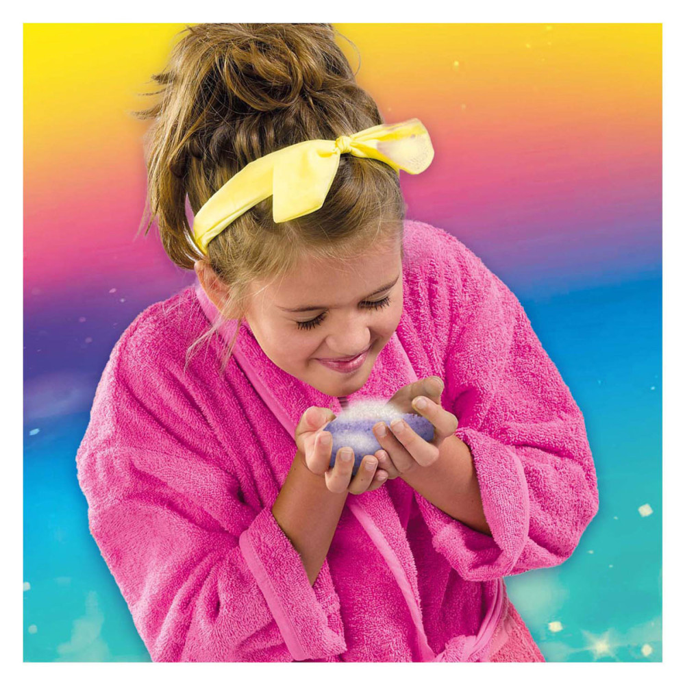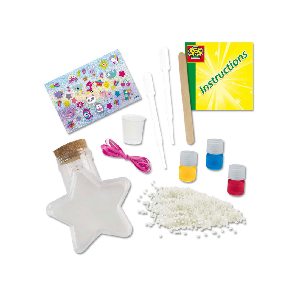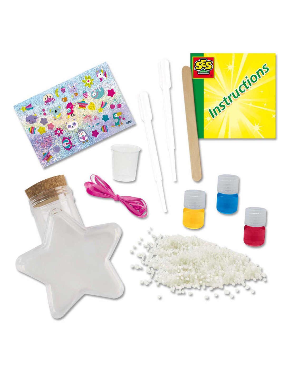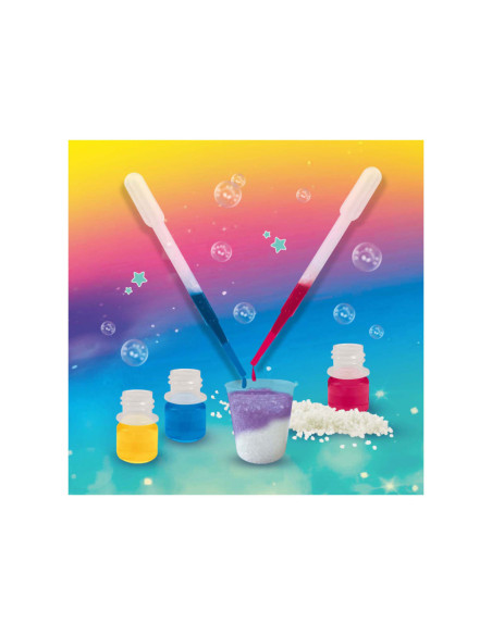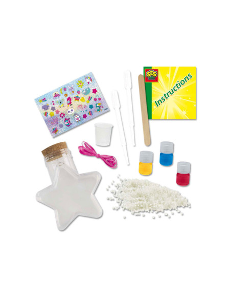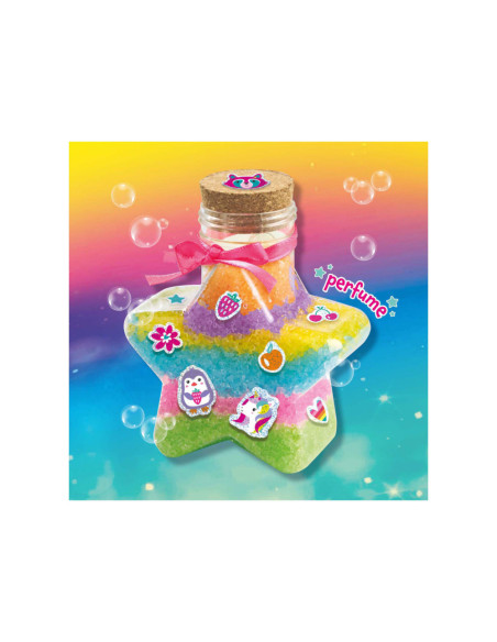 Creëer je eigen magisch Galaxy badzout! Met deze lab set kun je zelf badzout kleuren en parfumeren. Maak verschillende kleuren badzout door steeds wat badzoutkorrels te mengen met gekleurde parfum. Door de rode, gele en blauwe parfum te mengen ontstaan verschillende zoete geuren en mengkleuren. Gebruik de maatbeker, pipetjes en het roerstokje voor nauwkeurig doseren en mengen. Giet elke gemaakte kleur in de stervormige bewaarfles en creëer zo prachtig gekleurde lagen. Sluit de fles af met de kurken dop en versier jouw magische badzout met glitterstickers en lint.Dit prachtige, zelfgemaakte badzout is goed afwasbaar, cosmetisch en veilig te gebruiken. Perfect voor kinderen die van experimenteren houden!