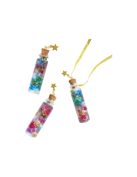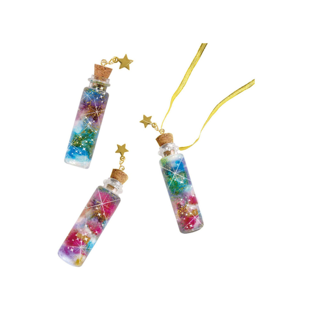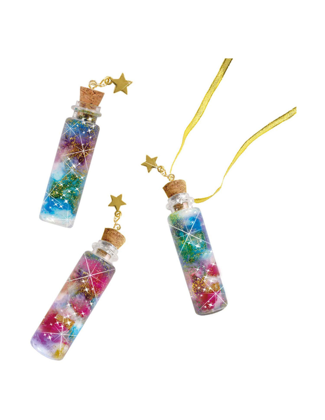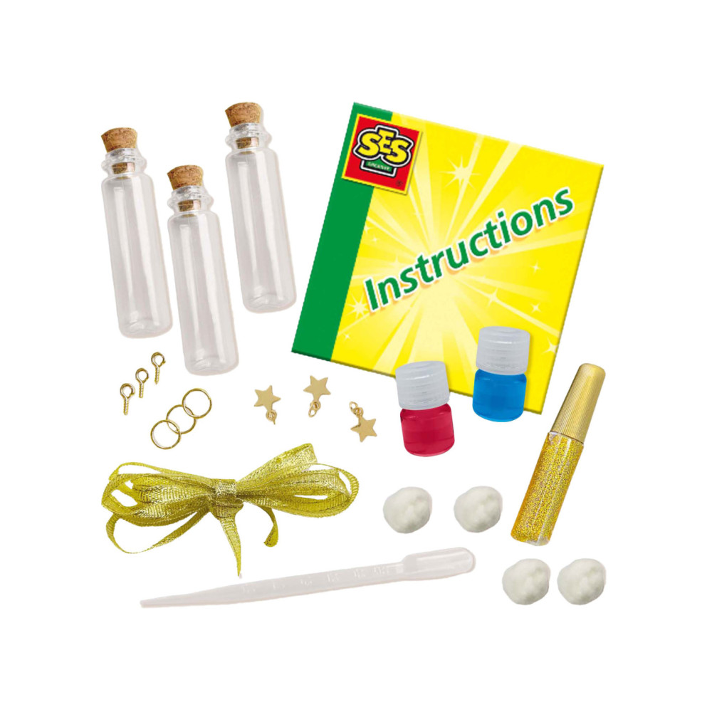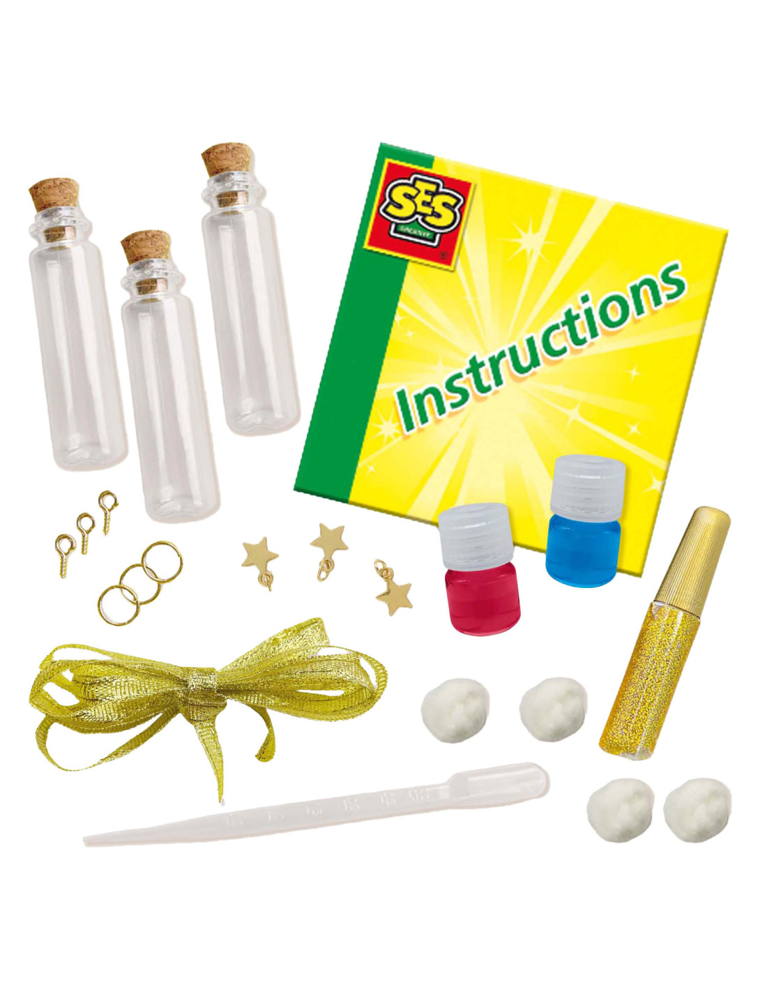 Creëer Magische Galaxy Stardust Sieraden Met de Galaxy Stardust Sieraden set kun je je eigen betoverende kettinghangers maken met een magisch effect. De rode en blauwe kleurstof vloeien prachtig samen met de glitters in de watten, wat zorgt voor een mysterieuze en schitterende sfeer. Versier de flesjes met het goudkleurige lint, een stervormige bedel, en een echte kurken dop. Deze zelfgemaakte sieraden worden gegarandeerd de favorieten van elk kind! Inhoud van de verpakking: 3 Mini flesjes met dop van kurk 3 Ster bedels 3 Bevestigingshaakjes 3 Bevestigingsoogjes Rode kleurstof (5ml) Blauwe kleurstof (5ml) Glitterlijm goud Wattenbollen Goudkleurig lint Pipet Instructies Unieke Eigenschappen: Magisch effect in 3 flesjes met veilige kurken dop Maak unieke kleureffecten door rode en blauwe kleurstof te mengen Inclusief prachtige sterrenbedels en glitterlijm Gebruik de pipet om de kleuren nauwkeurig aan te brengen Leuk om te maken en om te dragen!Maak je Eigen Galaxy Sieraden! Deze set is perfect voor kinderen vanaf 5 jaar die houden van knutselen en sieraden maken. Laat je creativiteit de vrije loop en creëer iets magisch!Start Vandaag met je Sieradenavontuur! Pak de Galaxy Stardust Sieraden set van SES Creative en maak je eigen schitterende kettinghangers. Perfect om te dragen of cadeau te geven!