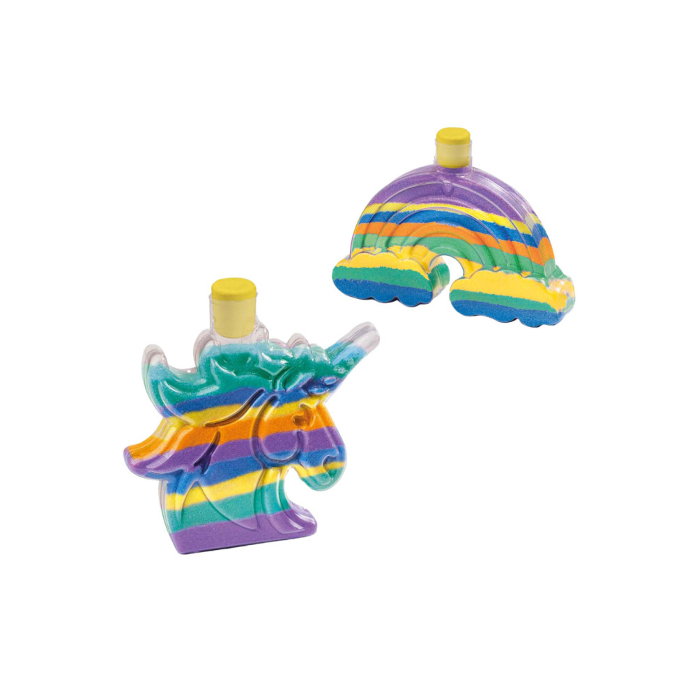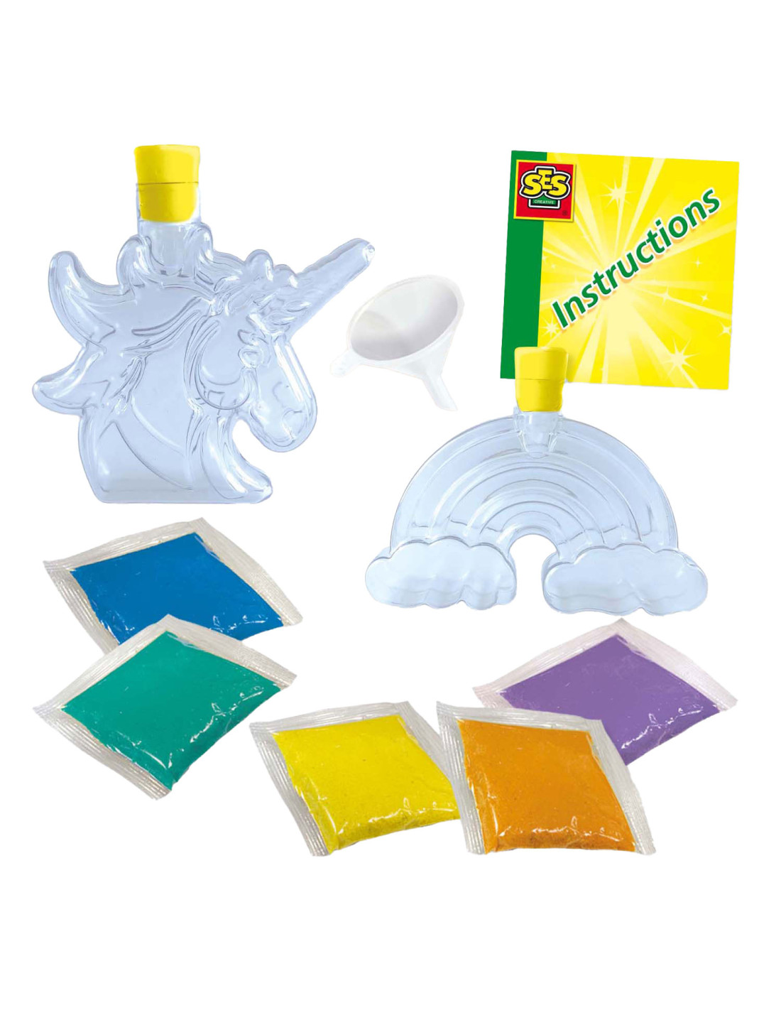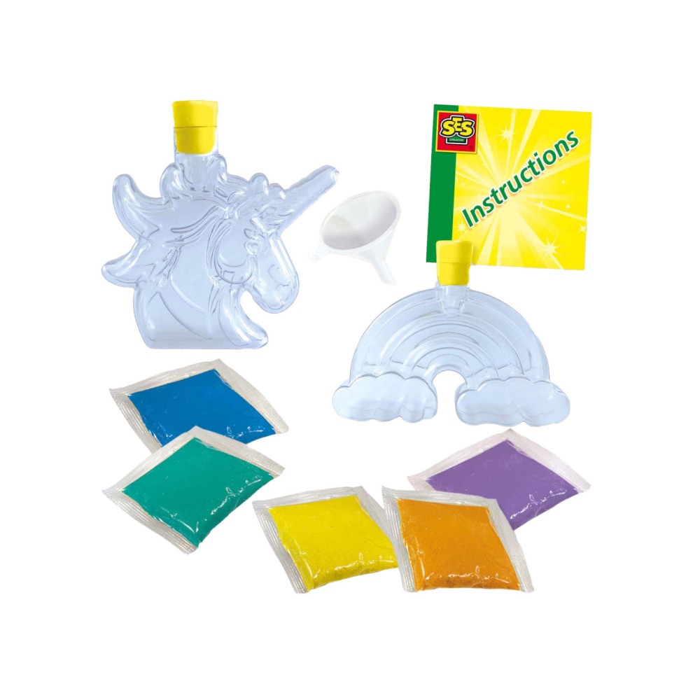 Galaxy Sand Art Bottles �?? Unicorn en Rainbow: Creëer Magische Zandkunst!Met deze Galaxy Sand Art Bottles set van SES Creative kunnen kinderen hun eigen unieke zandkunstwerken maken. Vul de eenhoorn- en regenboogflessen met lagen kleurrijk zand en creëer prachtige decoratieve figuren. De lagen zand kunnen eenvoudig in de flessen worden gegoten met de bijgeleverde trechter. De flessen sluiten goed af met de mooie gele doppen, waardoor je kunstwerk veilig bewaard blijft. Inhoud van de verpakking:2 flessen (eenhoorn en regenboog)Kleurrijk zand in verschillende kleuren Trechter Unieke Eigenschappen:Thema: Eenhoorn en Regenboog Kleurrijk zand voor een prachtig effect Gemakkelijk te doseren zand met de trechter Stimuleert creativiteit Perfect om tentoon te stellen in de kinderkamer Creëer Sprankelende Zandkunstwerken Met deze set kunnen kinderen hun creativiteit de vrije loop laten en prachtige zandkunstwerken maken. De heldere kleuren en de thematische flessen maken het eenvoudig om unieke en mooie creaties te maken. Het proces van zand gieten en lagen maken helpt bij de ontwikkeling van fijne motoriek en stimuleert het inbeeldingsvermogen. Waarom Dit Perfect Voor Jou Is Deze set is ideaal voor kinderen die houden van knutselen en decoreren. Het bevordert niet alleen de creativiteit, maar zorgt ook voor een prachtig eindresultaat dat perfect is om tentoon te stellen in de kinderkamer. De set is veilig en gemakkelijk te gebruiken, wat het een ideale keuze maakt voor ouders. Begin Vandaag Nog Met Zandkunst Ontdek het plezier van zandkunst maken en creëer de mooiste kunstwerken met SES Creative's Galaxy Sand Art Bottles. Perfect voor urenlang creatief plezier!