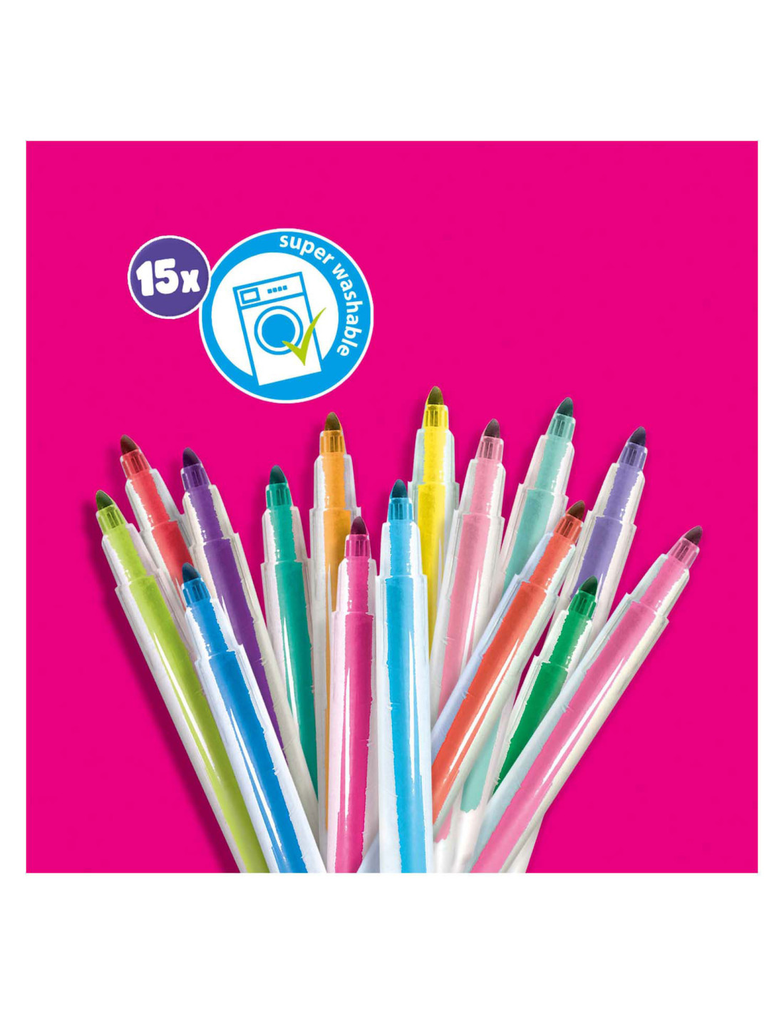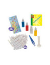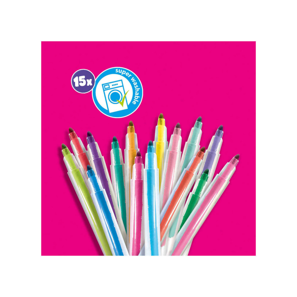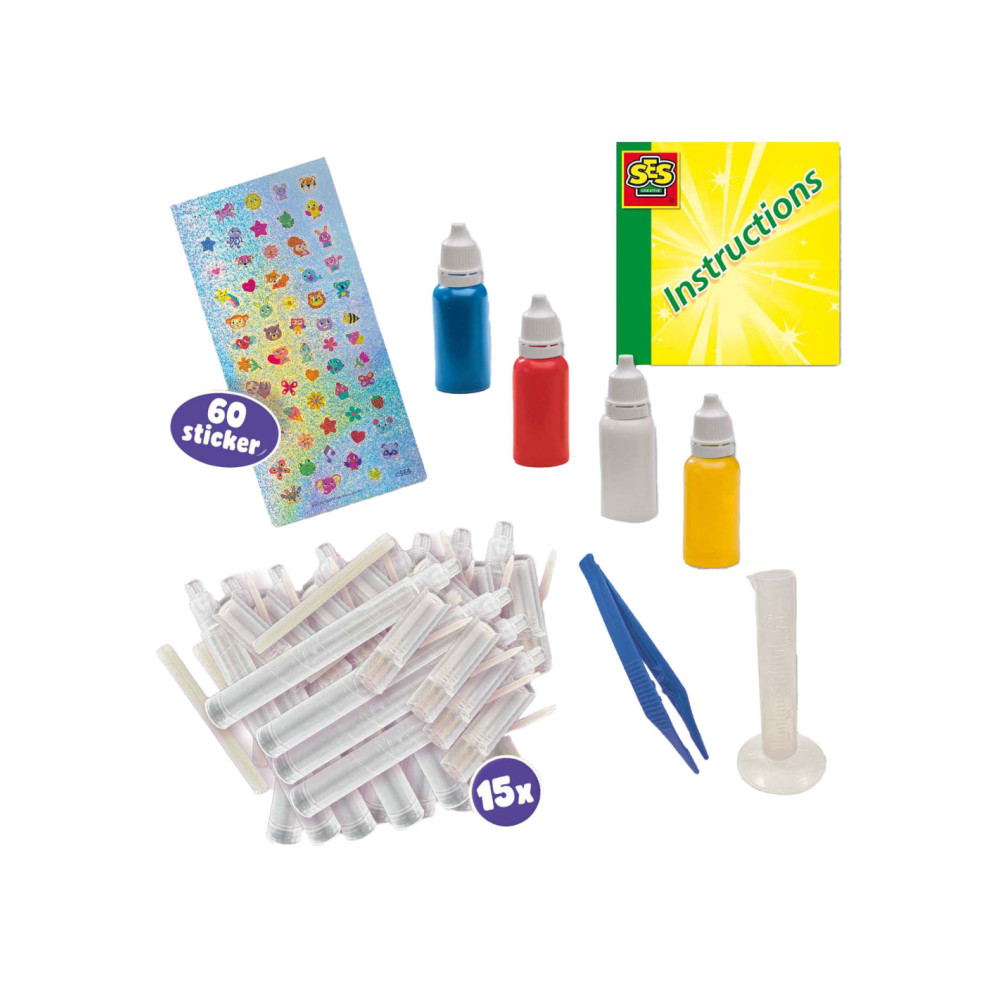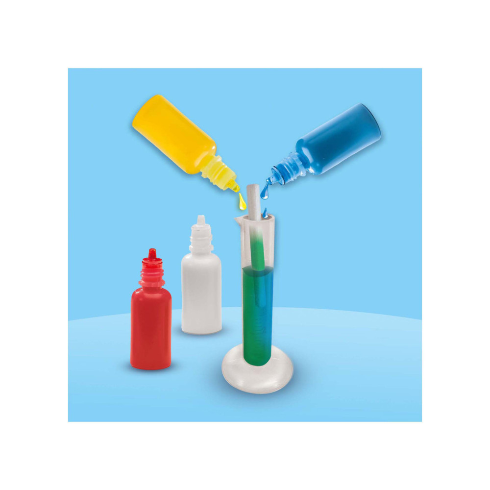 Maak nu zelf je 15 unieke kleuren viltstiften met het Viltstiften lab! Houd je van experimenteren? Ga dan aan de slag met de vier kleuren goed uitwasbare inkt en duidelijke menginstructies om 15 verschillende kleuren en tinten te maken voor je eigen viltstiften. Gebruik het pincet om precies te werk te gaan en plaats de filters in de mengbeker om de inkt te absorberen. Zet de stiften vervolgens in elkaar en versier ze met de 60 vrolijke glitterstickers. Perfect voor kinderen die graag experimenteren, kleuren en personaliseren!