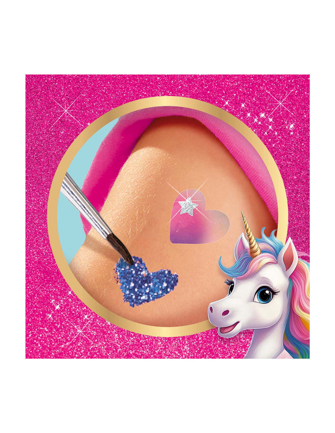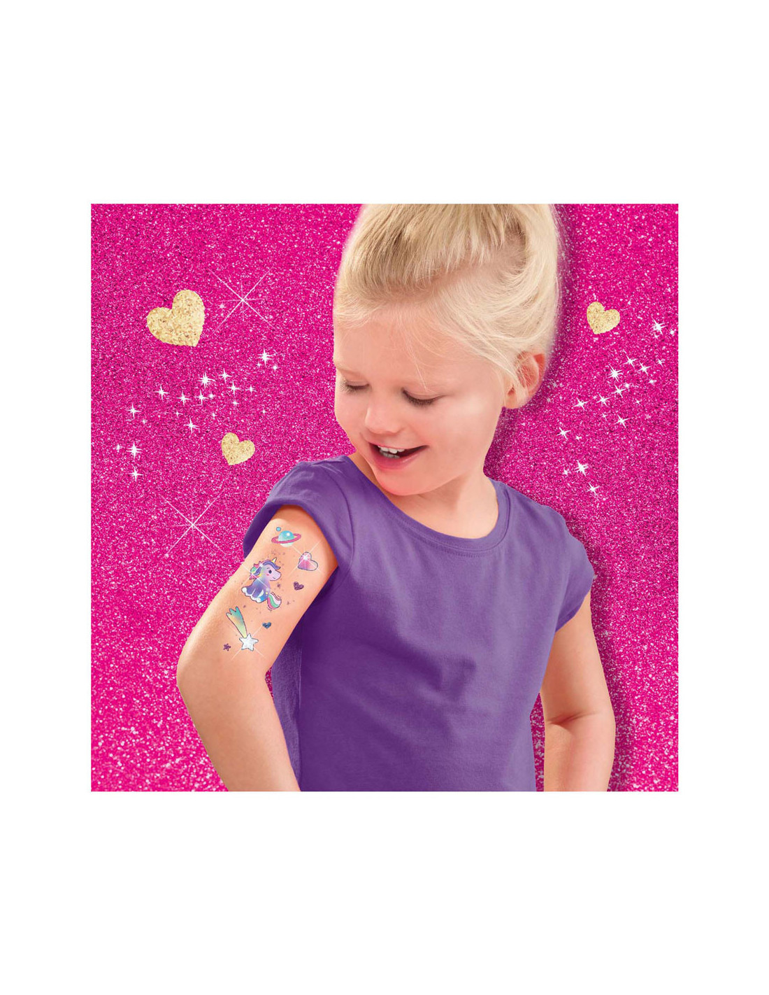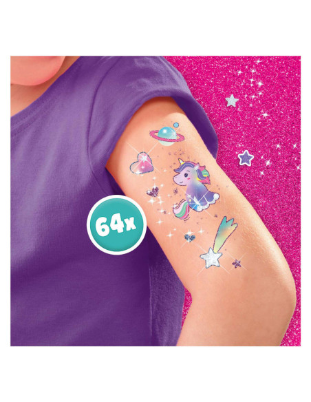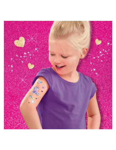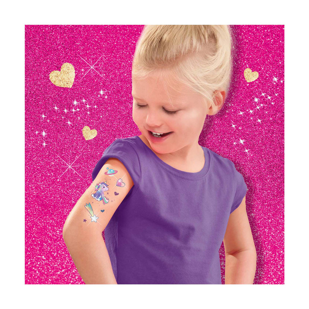 Voeg een vleugje magie toe met de Unicorn - Tattoos en glitters set! De metallic afwerking van de plak tattoos zorgt voor een sprankelend effect. Ze zijn gemakkelijk aan te brengen en te verwijderen, en cosmetisch getest. Zo zijn ze veilig te gebruiken op de kinderhuid. Naast de tattoos bevat de set twee kleuren cosmetische glitters en glitterlijm, voor nog meer schitteringen en personalisatie. Een hit voor iedereen die van unicorns houdt of een unicorn feestjes heeft.