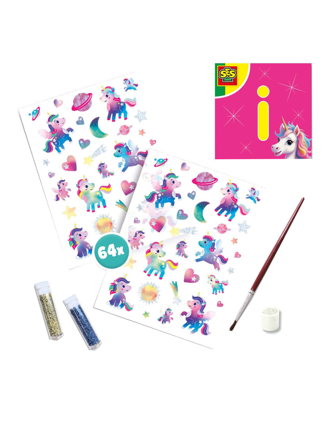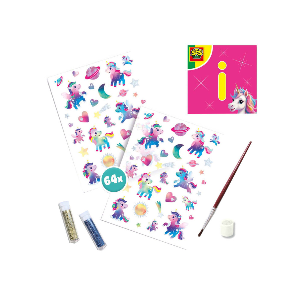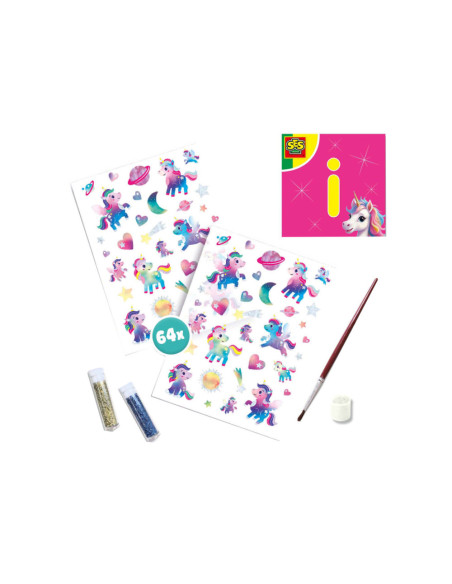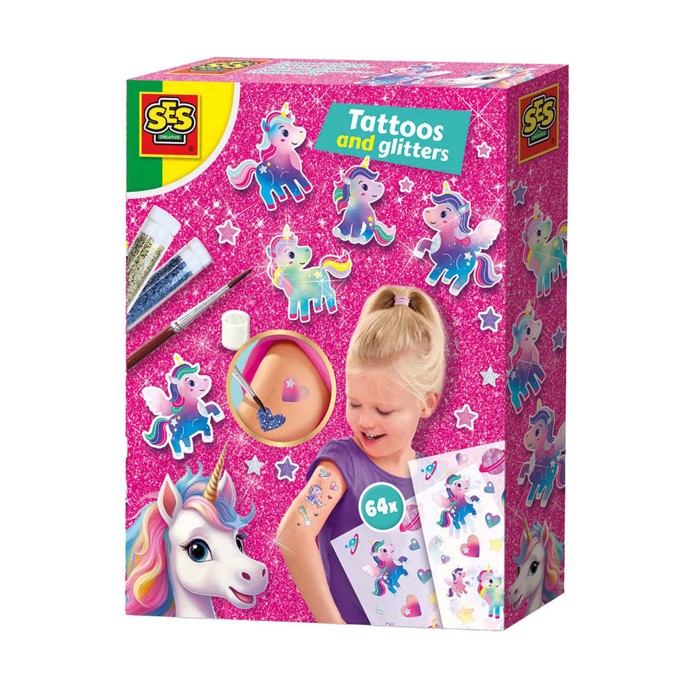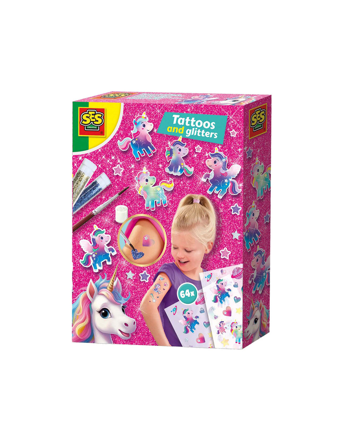Voeg een vleugje magie toe met de Unicorn - Tattoos en glitters set! De metallic afwerking van de plak tattoos zorgt voor een sprankelend effect. Ze zijn gemakkelijk aan te brengen en te verwijderen, en cosmetisch getest. Zo zijn ze veilig te gebruiken op de kinderhuid. Naast de tattoos bevat de set twee kleuren cosmetische glitters en glitterlijm, voor nog meer schitteringen en personalisatie. Een hit voor iedereen die van unicorns houdt of een unicorn feestjes heeft.