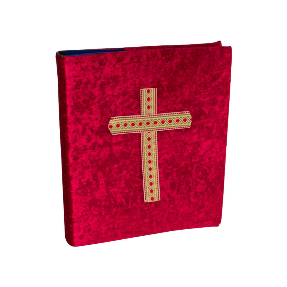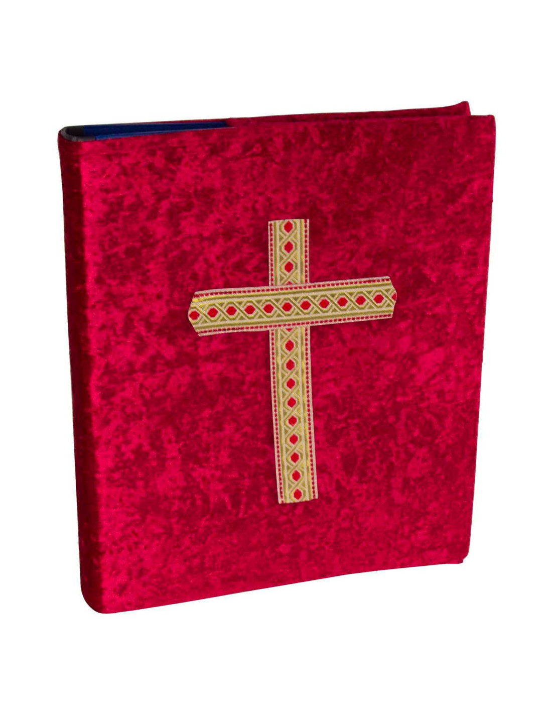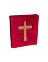 Rode Sinterklaas boekomslag met goudkleurig kruis, geschikt voor boeken tot A4-formaat (max. 20 x 32 cm). Gemaakt van polyester, afmetingen ca. 21 x 33 cm.