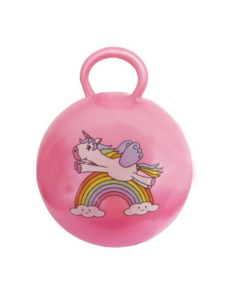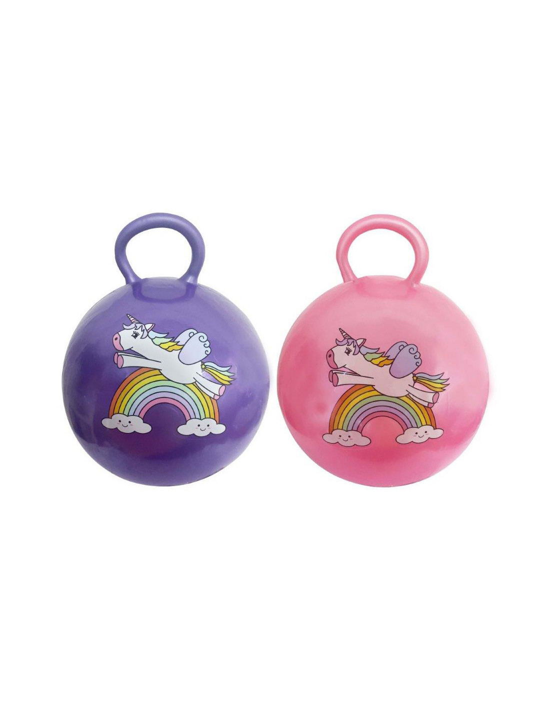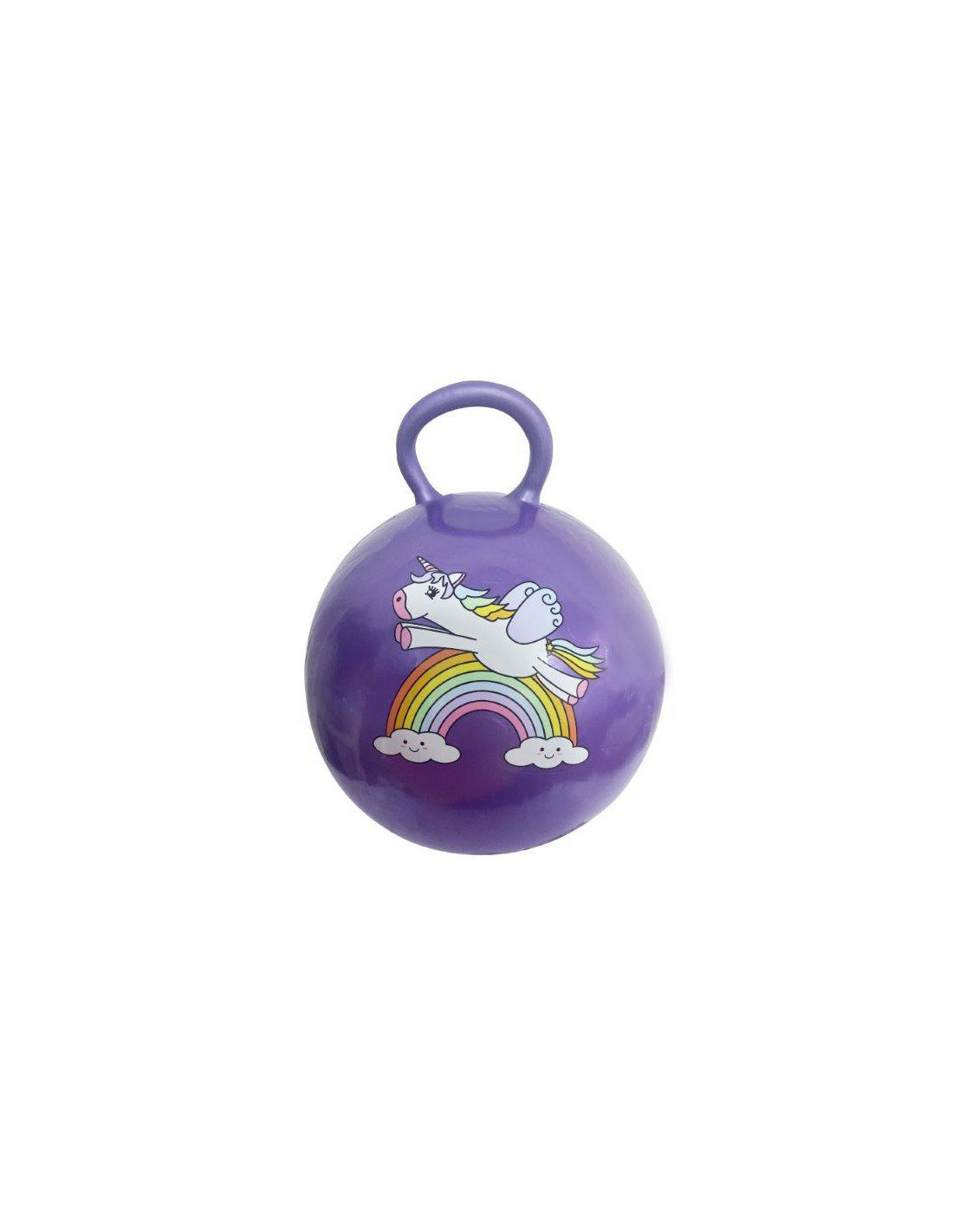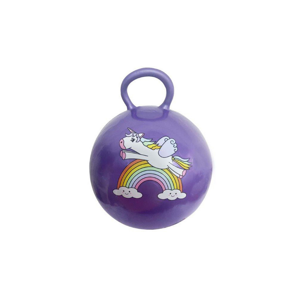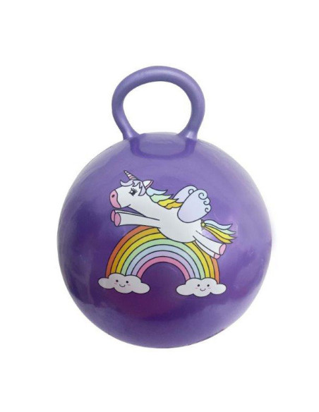 Spring als een konijntje door de lucht op jouw Skippybal Eenhoorn! Pak je stevig vast aan het hengsel, neem plaats op de bal en hop daar ga je! Deze skippybal wordt geleverd in de kleuren paars en groen en heeft een diameter van 46 centimeter. De Skippybal Eenhoorn is voorzien van een afbeelding van een witte unicorn met regenboog manen!