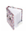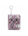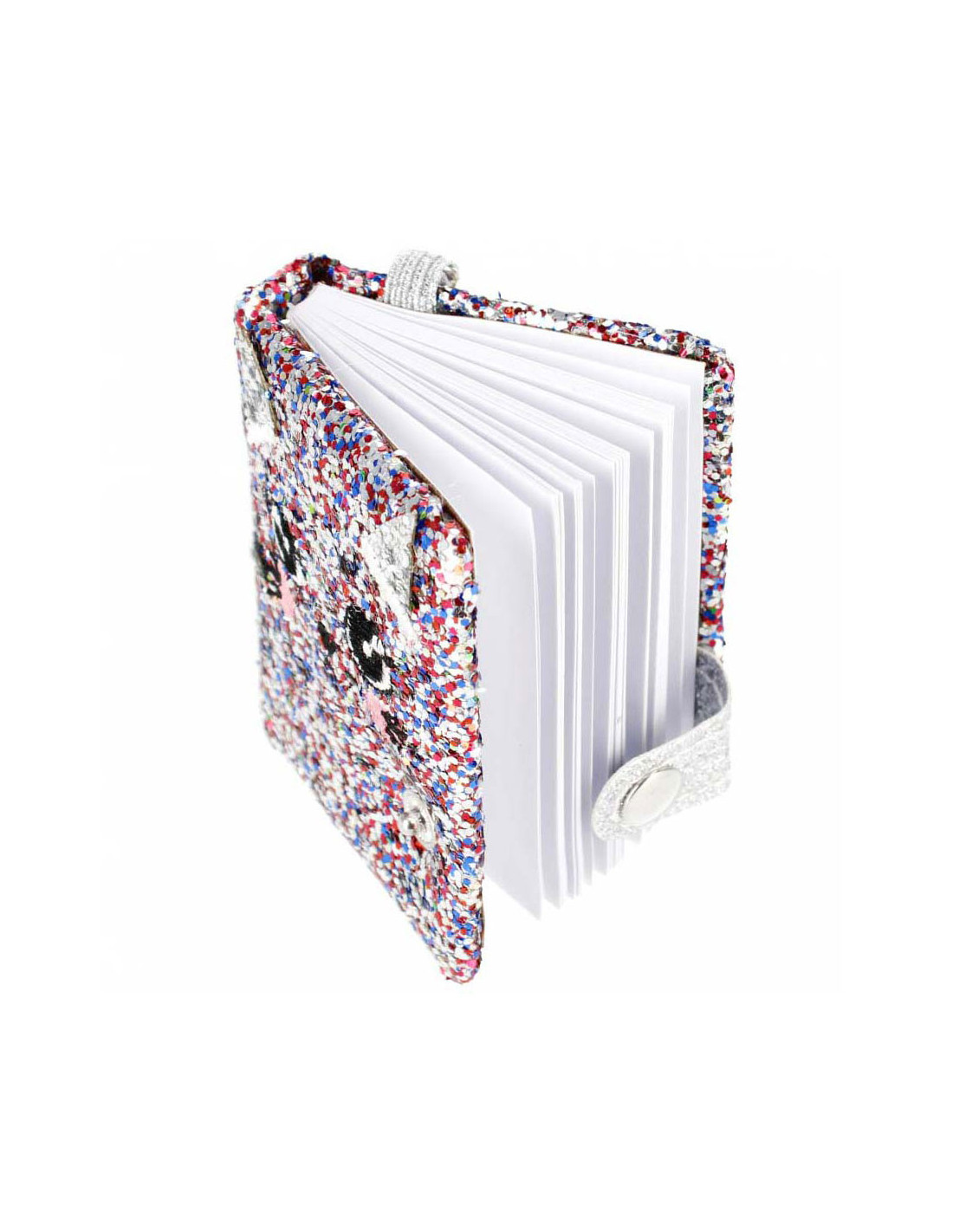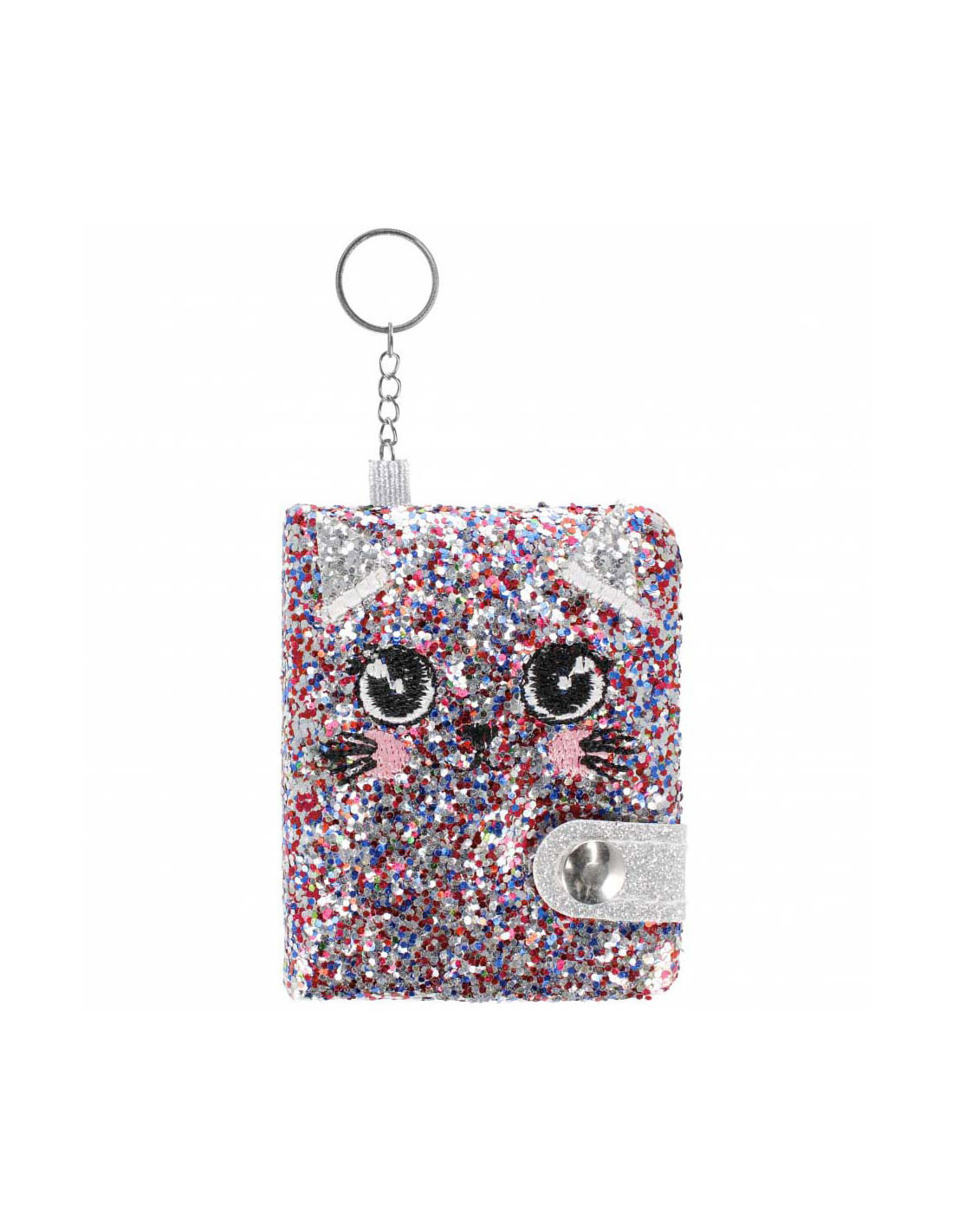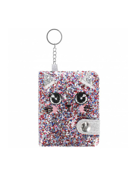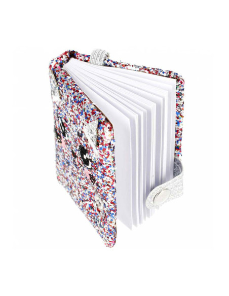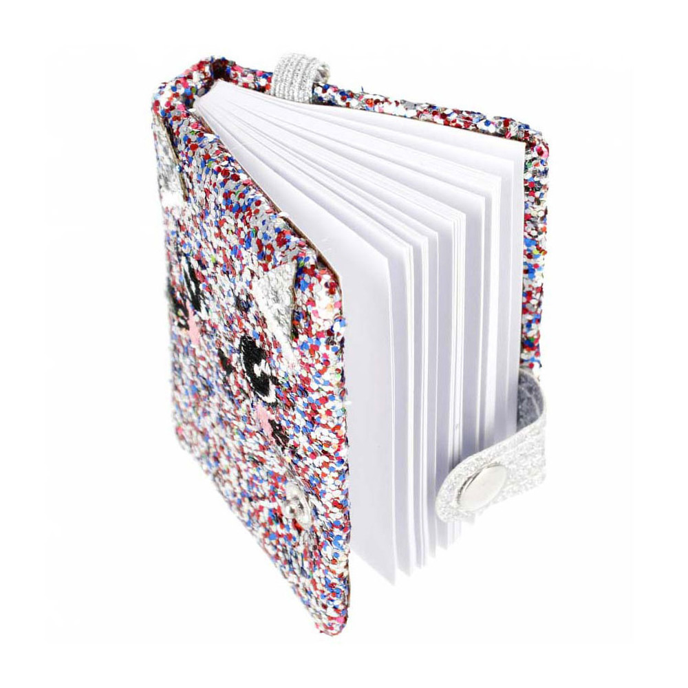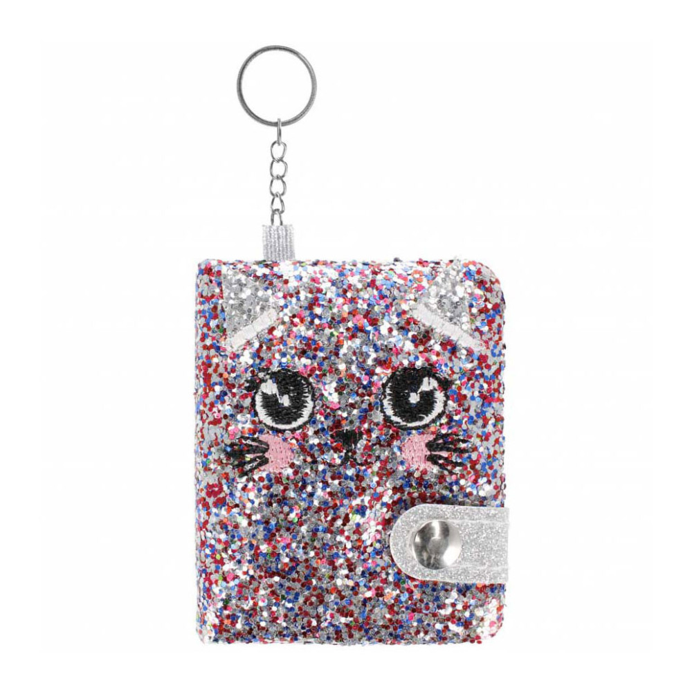 Glitter notitieboekje aan sleutelhanger met ongelinieerde bladzijden, een glitterende drukknoop als sluiting en een katten design.