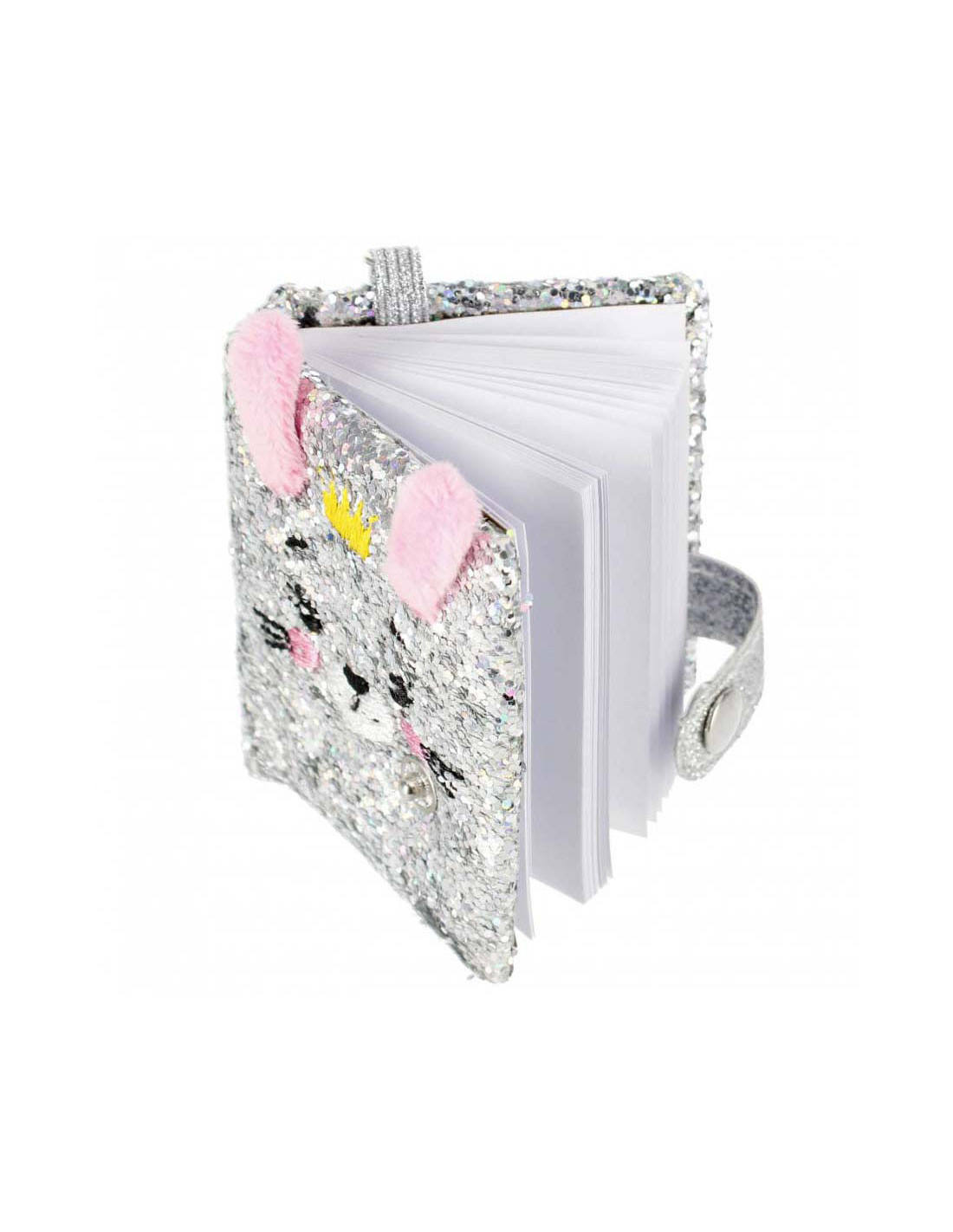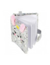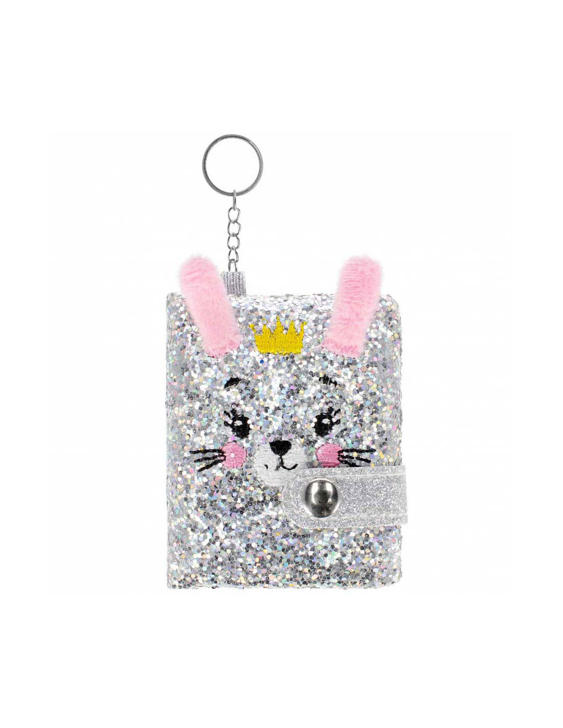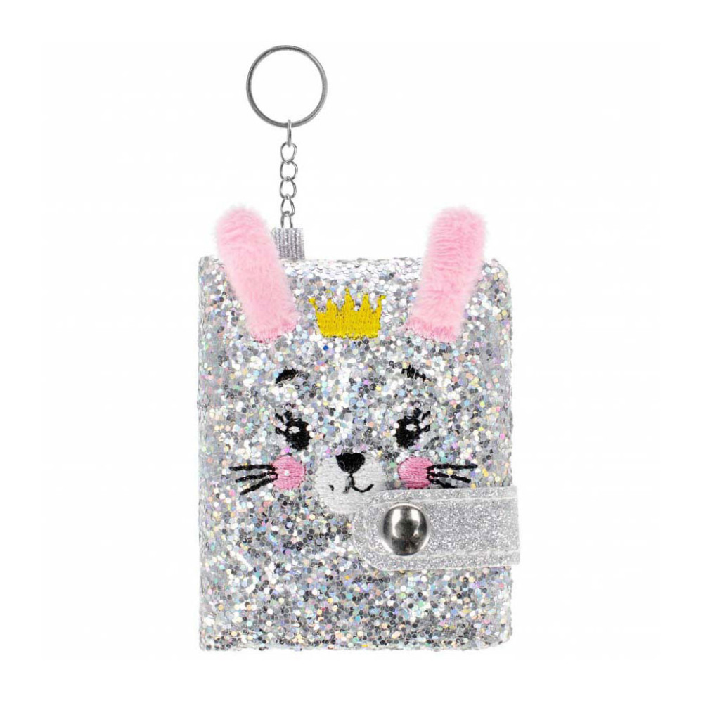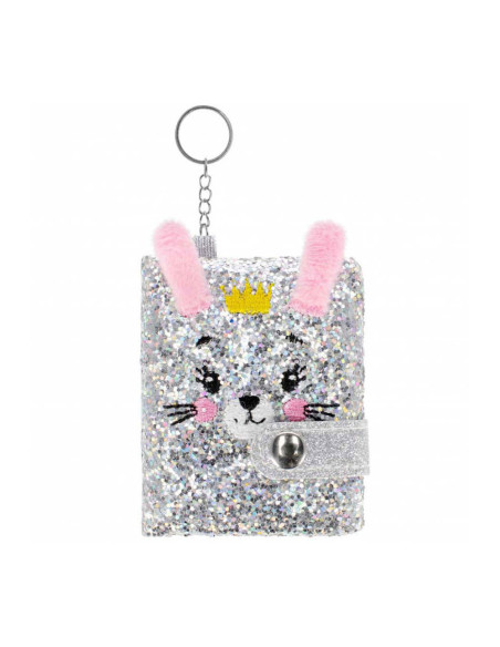 Glitter notitieboekje aan sleutelhanger met ongelinieerde bladzijden, een glinsterende drukknoopsluiting en een konijnendesign.