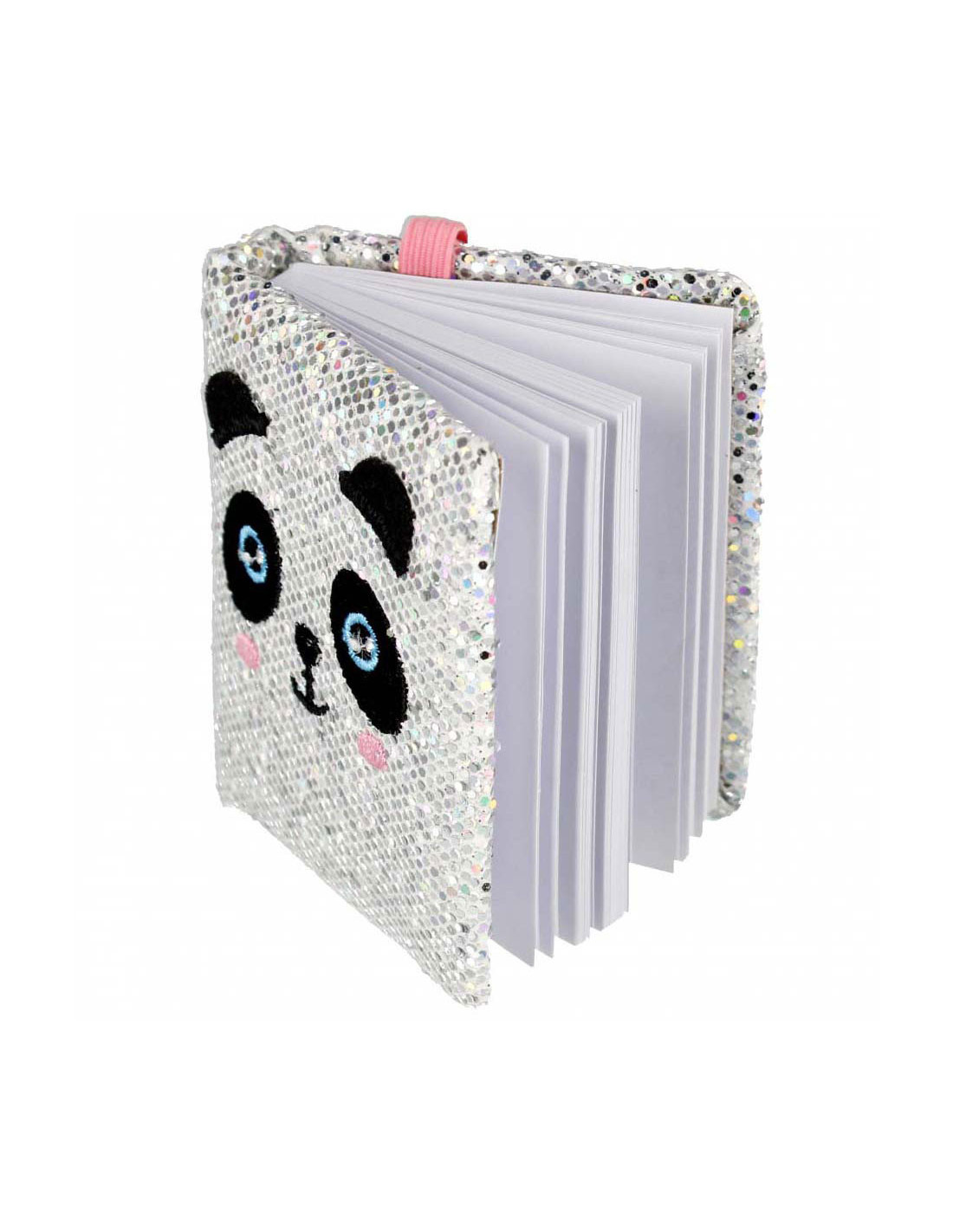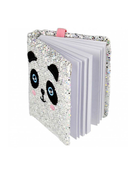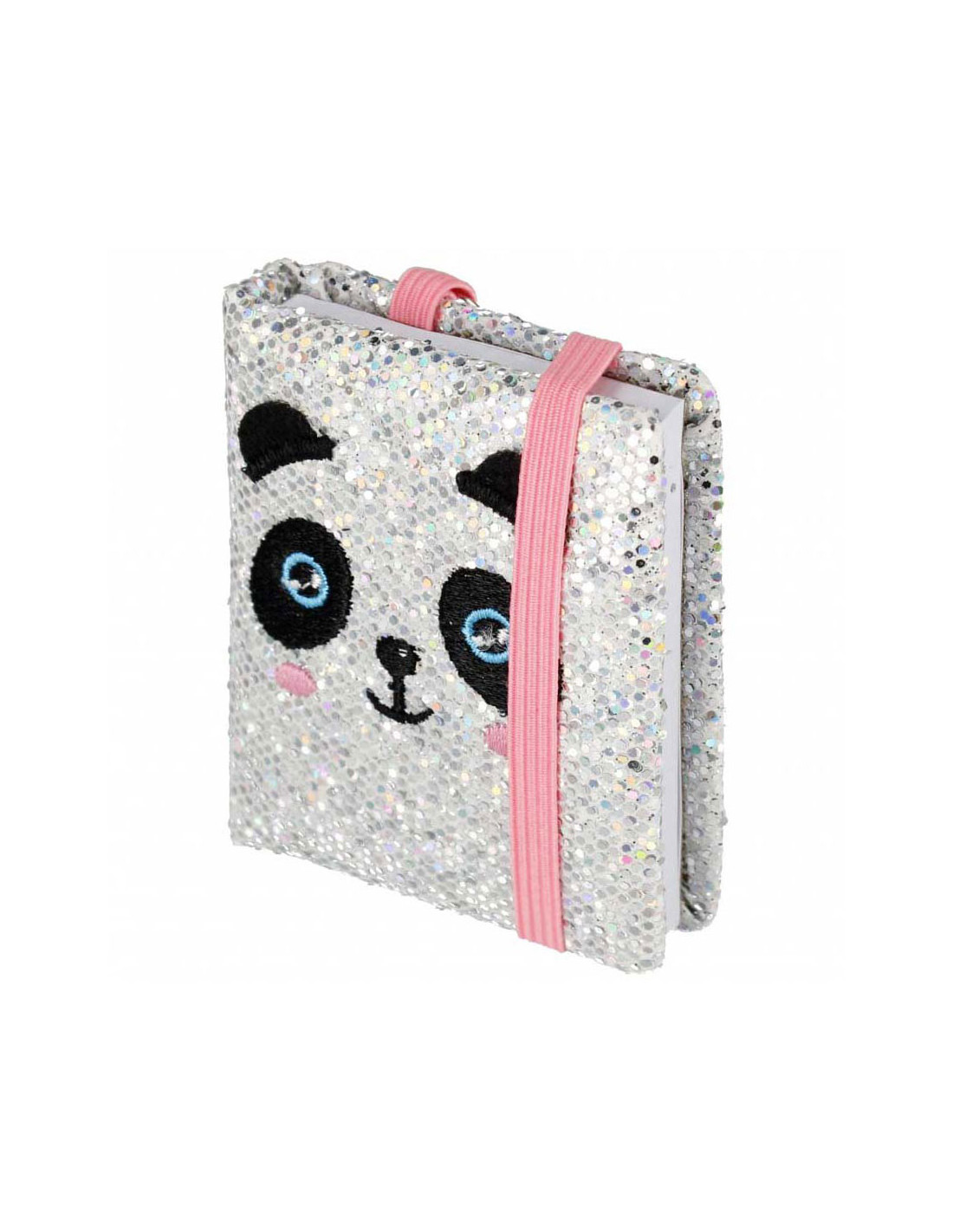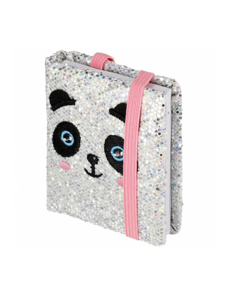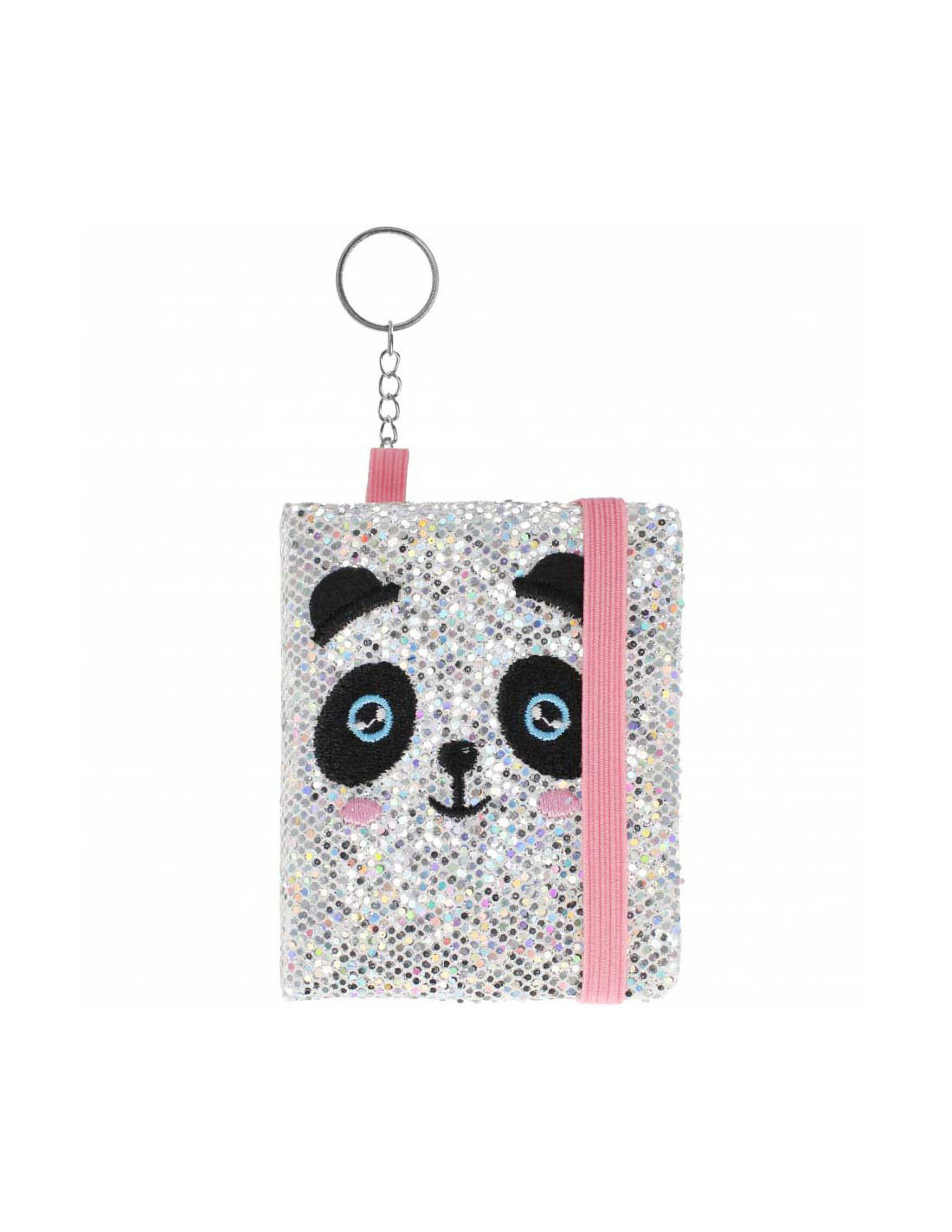 Glitter notitieboekje aan sleutelhanger met ongelinieerde bladzijden, een roze sluitelastiek en een panda design.