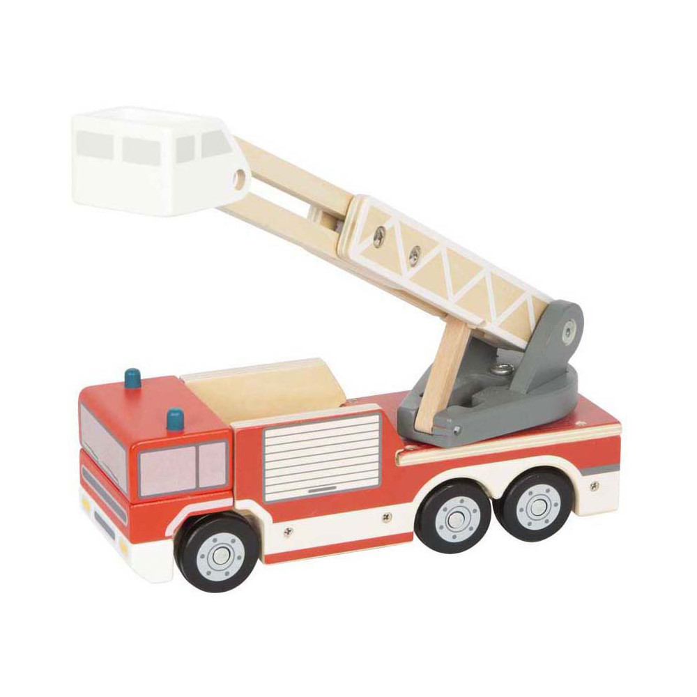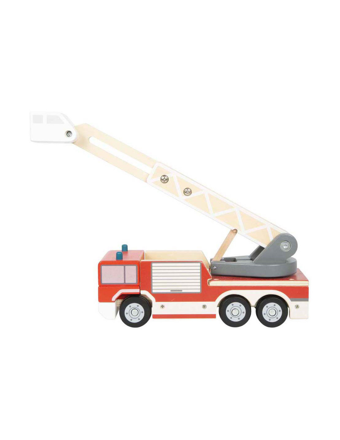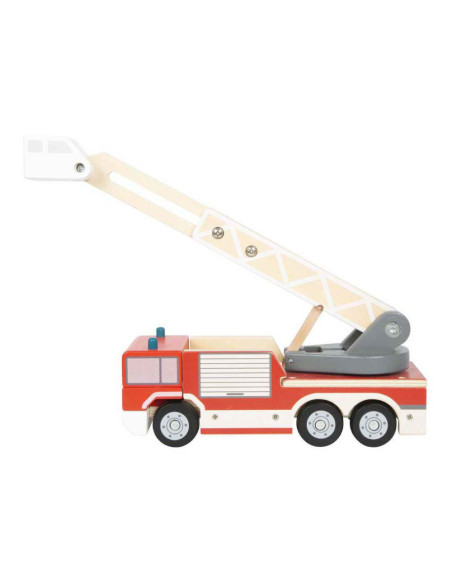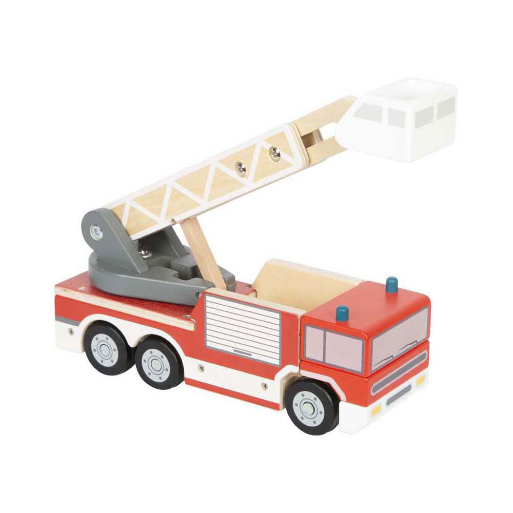 Deze houten brandweerauto is het perfecte voertuig voor jonge brandweermannen. Met een ladder die 360 graden kan draaien en uitschuiven, kunnen kinderen klassieke brandweerscènes uitbeelden waarbij ze hoog in de lucht branden moeten bereiken en blussen. De emmer aan het einde van de draaiende ladder kan eenvoudig worden bediend met de handslinger om het redden van mensen of dieren na te spelen. De rubberen, geruisloos rollende banden zorgen ervoor dat de truck rustig en zachtjes rondrijdt en de veiligheidsbeugels houden de draaiende ladder stabiel. Deze brandweerwagen maakt een sterke indruk met zijn stabiliteit en veelzijdige speelbaarheid, waardoor het een must-have is voor elk speelgoedwagenpark in de kinderkamer. Het manoeuvreren en bedienen van de laddermotor verbetert de hand-oog coördinatie van kinderen terwijl ze de kracht van hun verbeelding gebruiken om allerlei reddingsscenario's na te spelen. Spelen met dit speelgoedvoertuig stimuleert ook de sociale saamhorigheid wanneer kinderen samen hun eigen reddingsmissies plannen en uitvoeren!