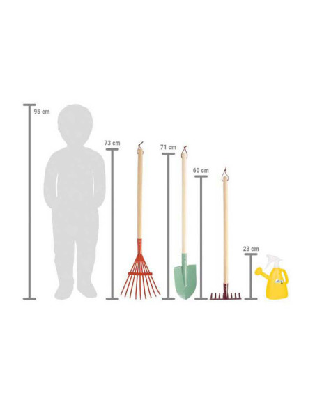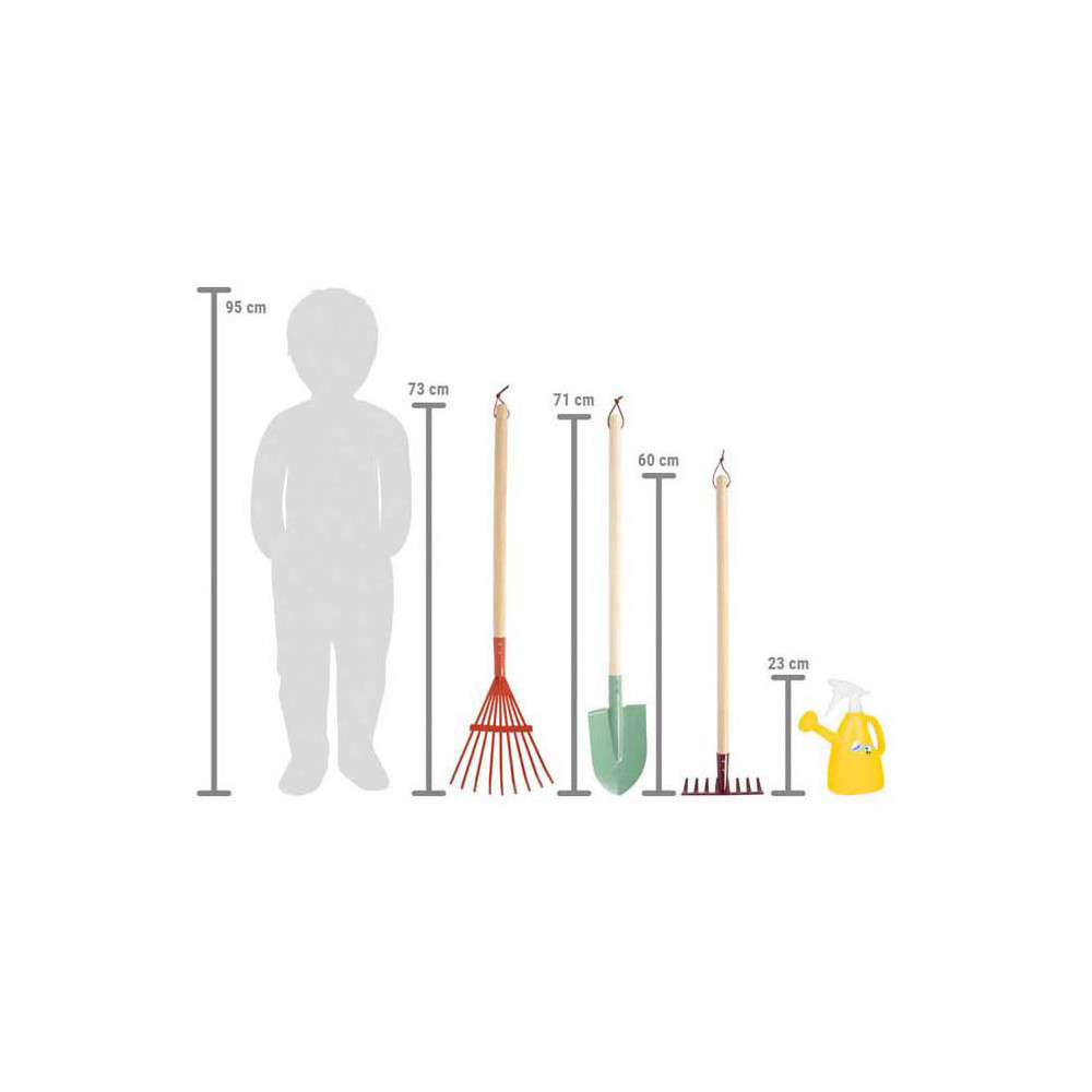 De vierdelige “Tiny Garden” tuingereedschapsset met gieter is de perfecte metgezel voor kleine tuiniers! Met een hark, schop, bladhark en een leuke bedrukte 2-in-1 gieter/sproeifles zijn kinderen perfect uitgerust om creatief te zijn in de tuin, zandbak of op het strand. Het gereedschap op kinderformaat heeft stevige houten handvatten en frisse trendy kleuren, en kan netjes worden opgehangen dankzij de praktische lussen. De “Tiny Garden” tuingereedschapsset met gieter biedt alles wat kinderen nodig hebben voor hun buitenavonturen. Deze set van hoge kwaliteit is perfect voor kleine kinderhandjes!