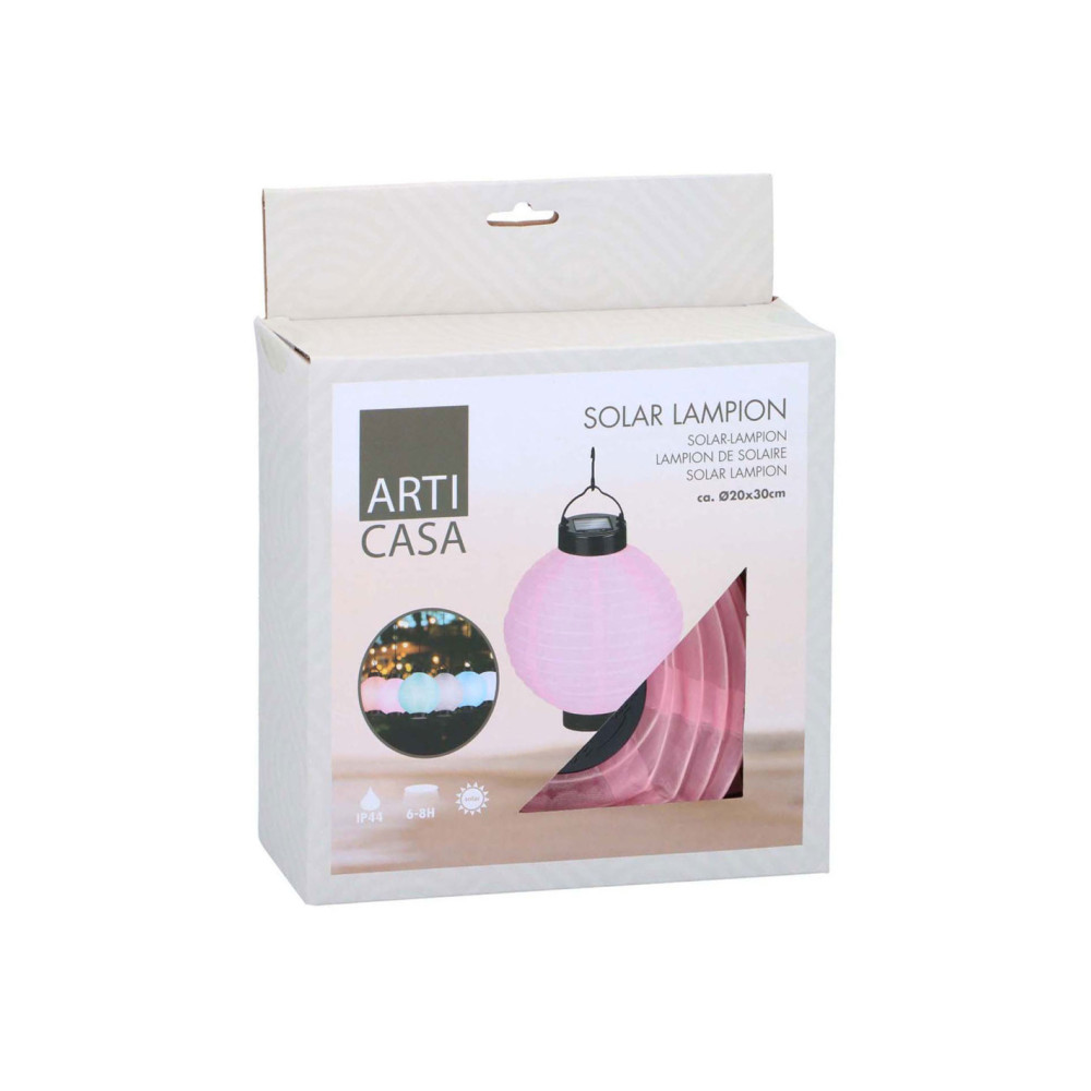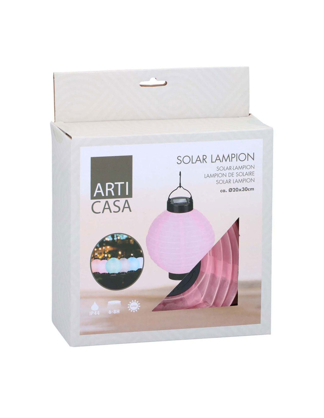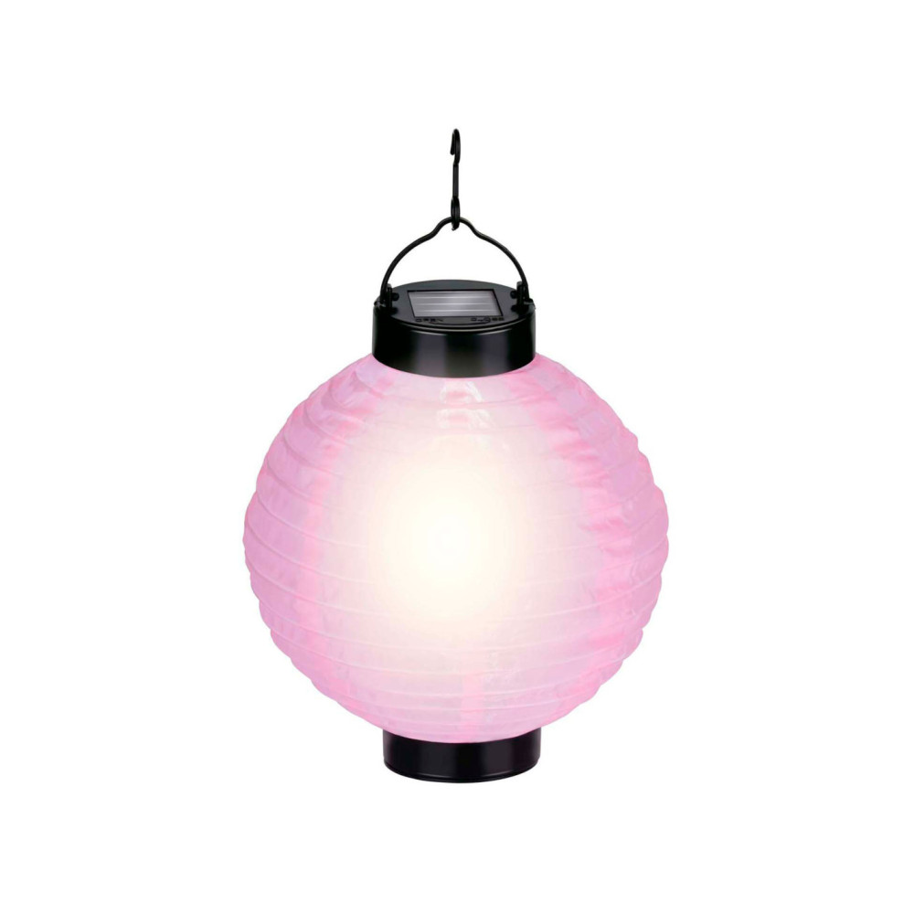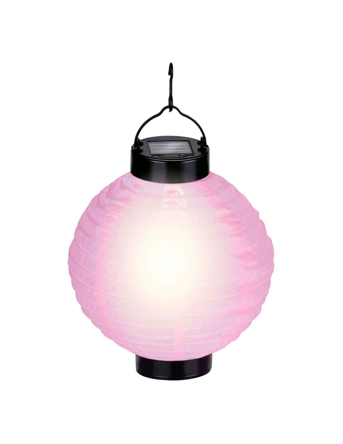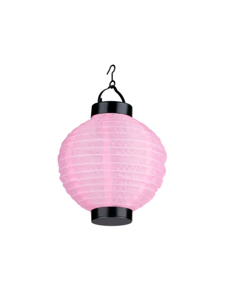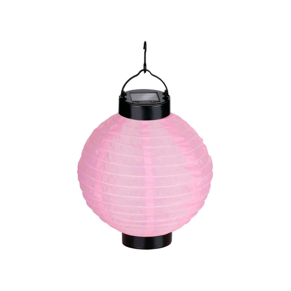 Solar lampion die oplaadbaar is met zonlicht. De lampion is 20 x 30 centimeter groot en roze van kleur.