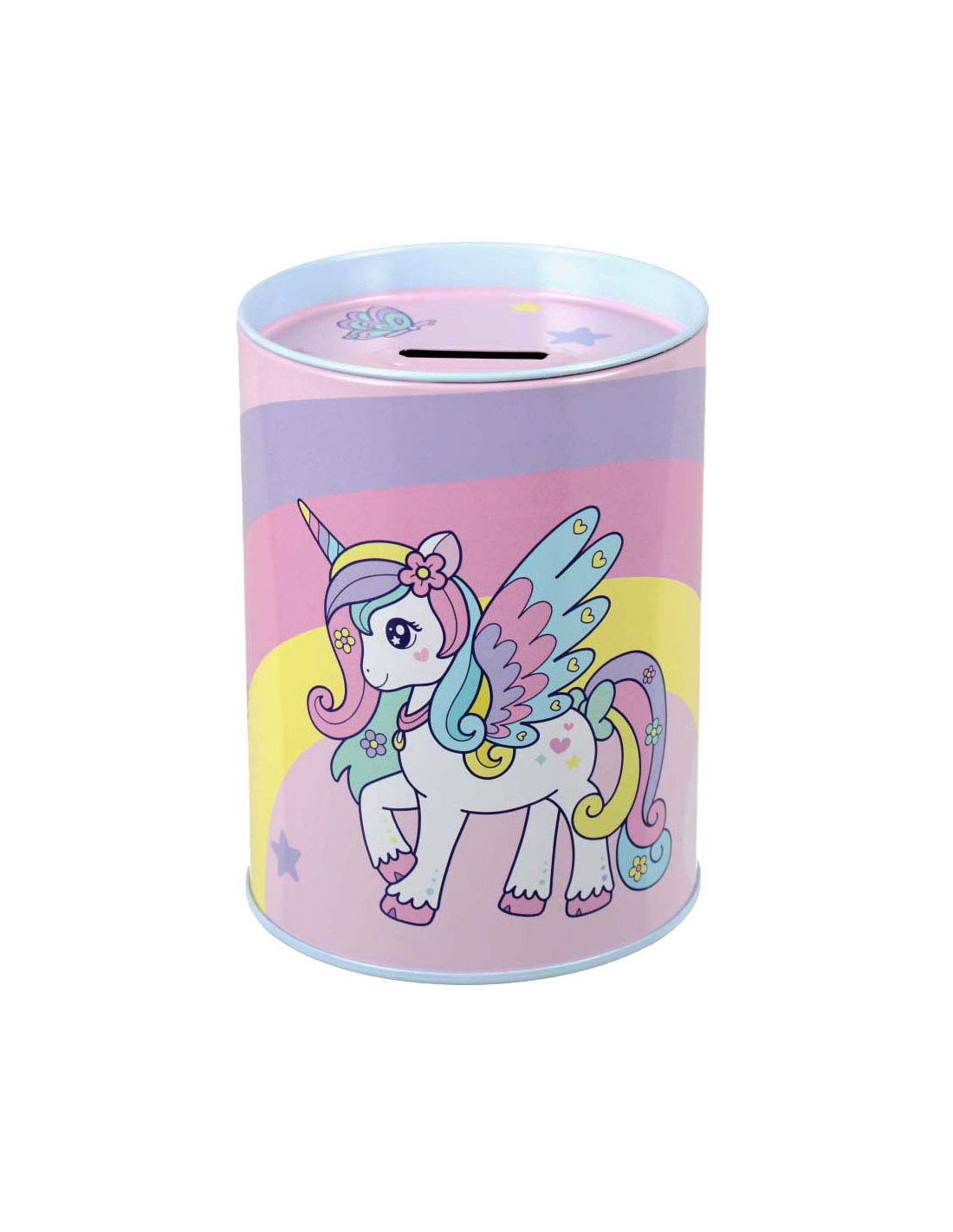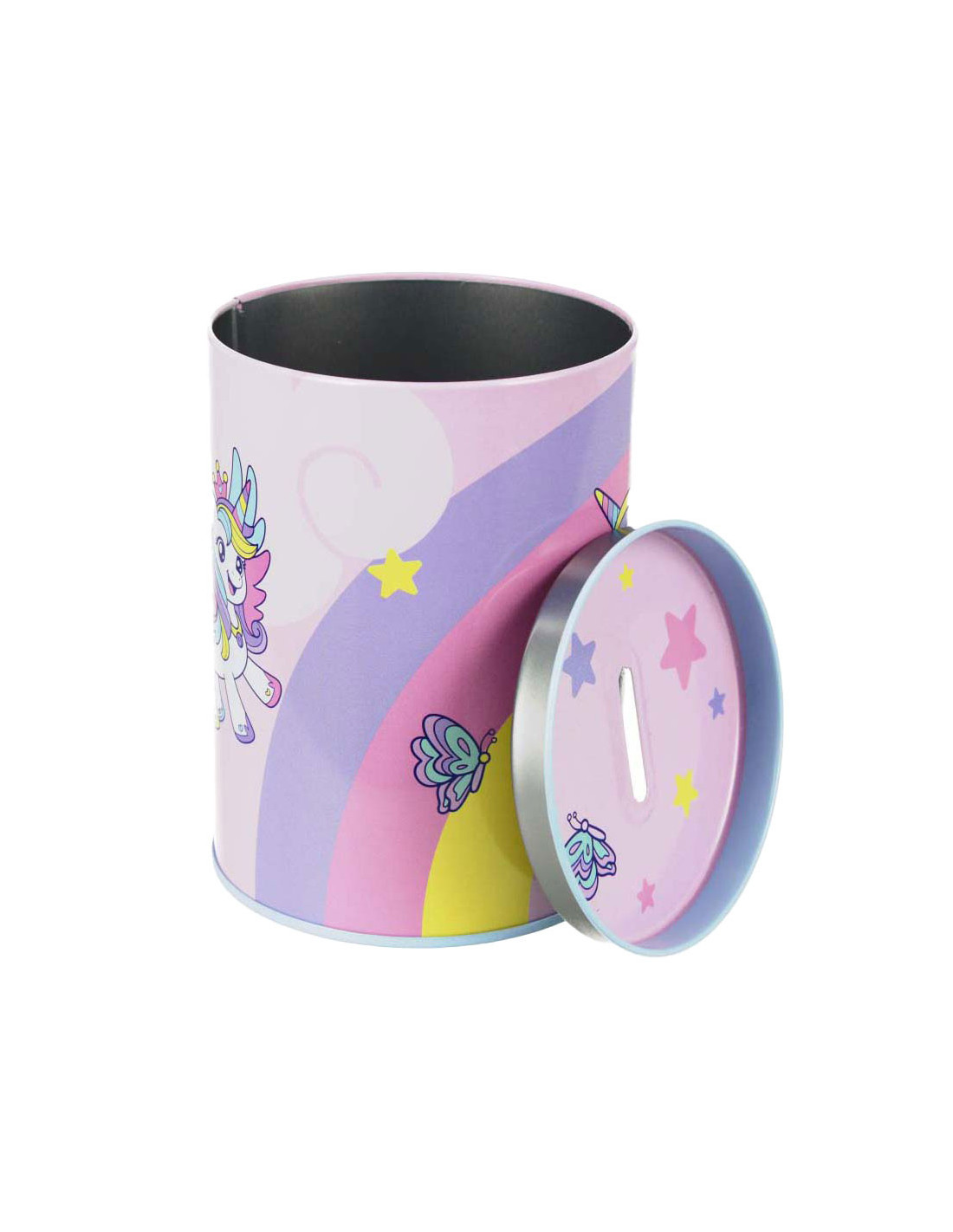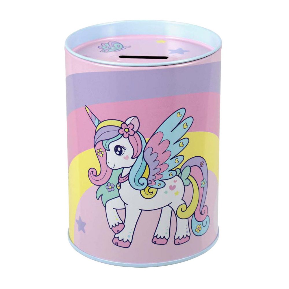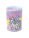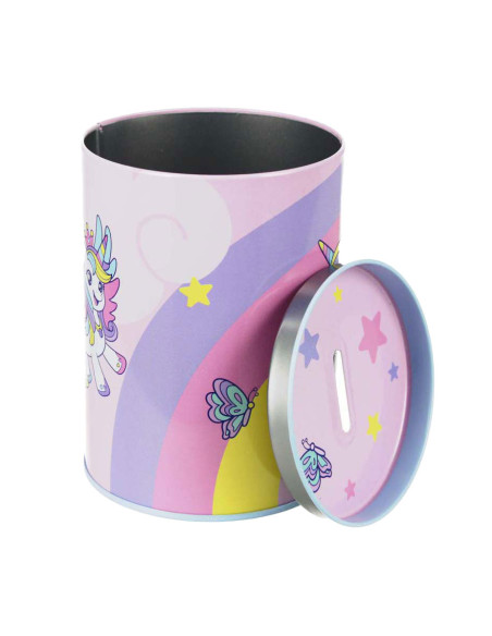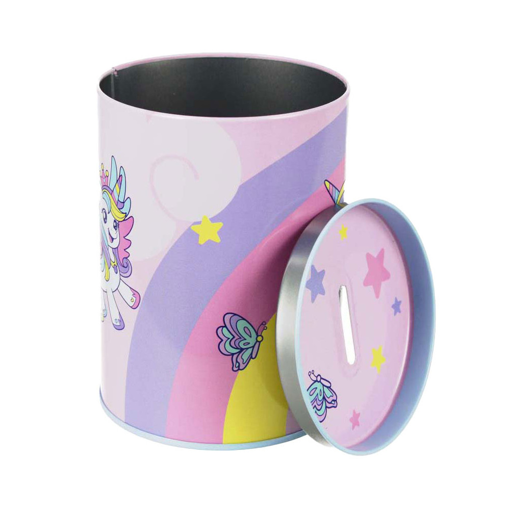 Muntenbox van gelakt metaal met een deksel dat open kan. Een perfect cadeau-idee dat spaargeld leert en geld veilig houdt. Kan ook gebruikt worden als bureau-organizer. Afmetingen: 12 x 8 centimeter.