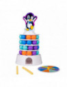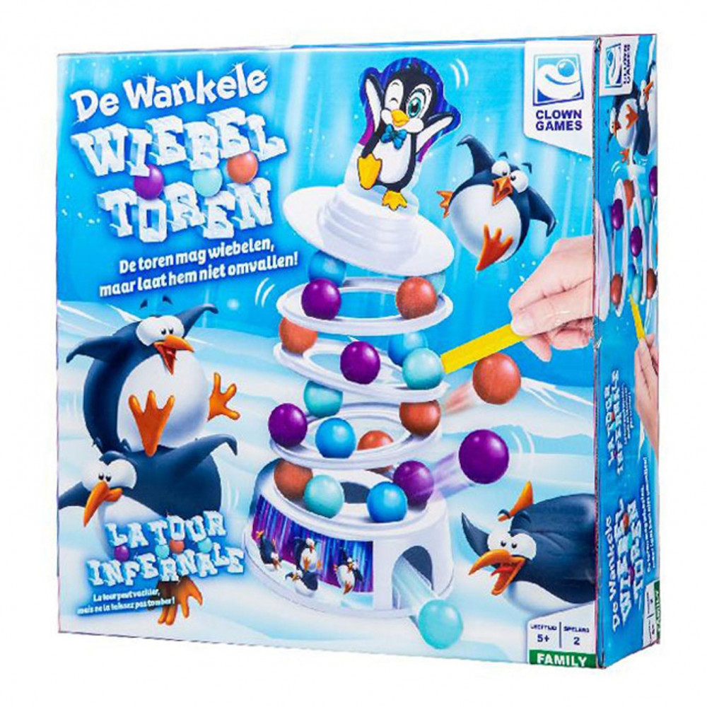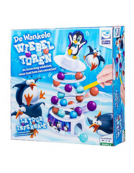 Clown Games wankele wiebeltoren. Plaats de balletjes op de basis en leg er een ring op. Zo bouw je een hoge toren. Nu ga je draaien aan de draaischijf. De kleur waarop 'ie eindigt, geeft aan welke kleur het balletje moet hebben, dat je moet verwijderen. Dit doe je met behulp van een stokje: hiermee valt het balletje in de basis en komt hier weer uit rollen. Elk balletje dat verwijderd wordt, maakt de toren minder stabiel. De speler, die uiteindelijk de toren laat vallen, heeft verloren! Inhoud: 36 gekleurde balletjes, 1 basis, 2 stickers met pinguïn-illustraties, 4 ringen, 1 kartonnen pinguïn om bovenop te plaatsen, 2 stokjes, een draaischijf en instructies. Wordt geleverd in full-colour doos. Geschikt voor 2 spelers vanaf 5 jaar.
