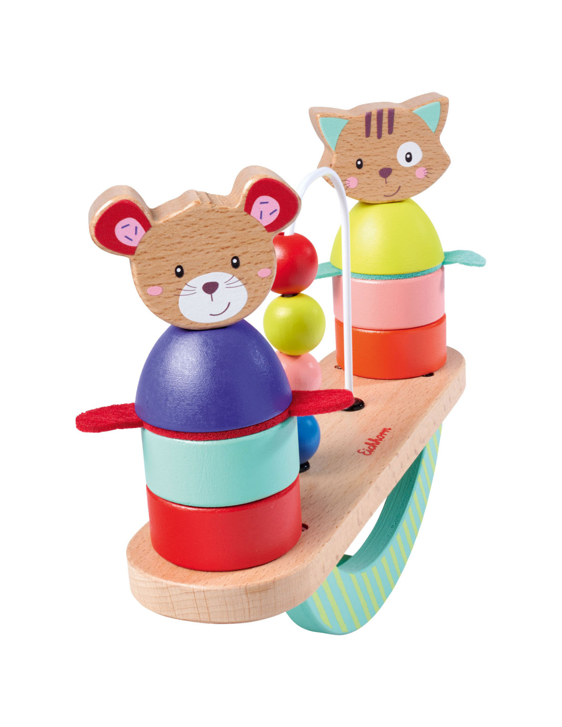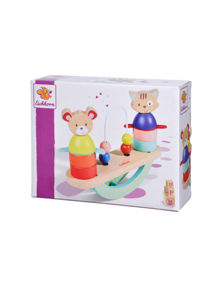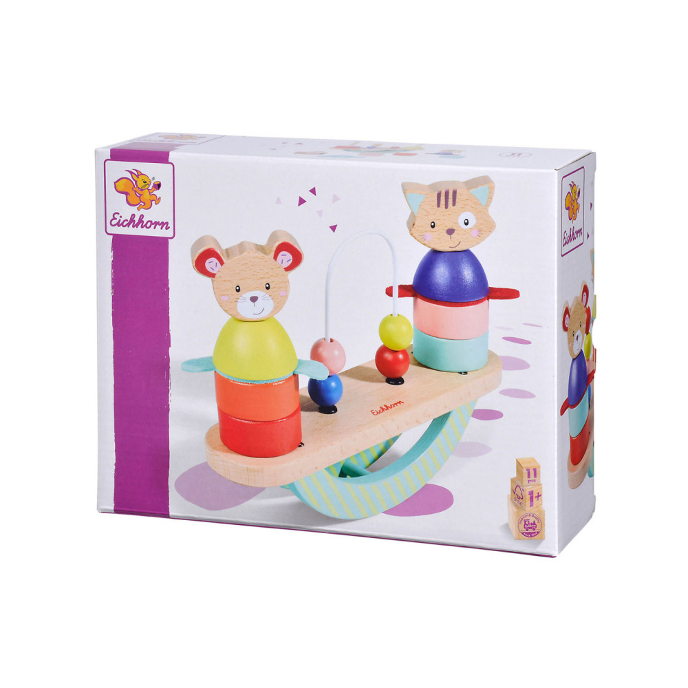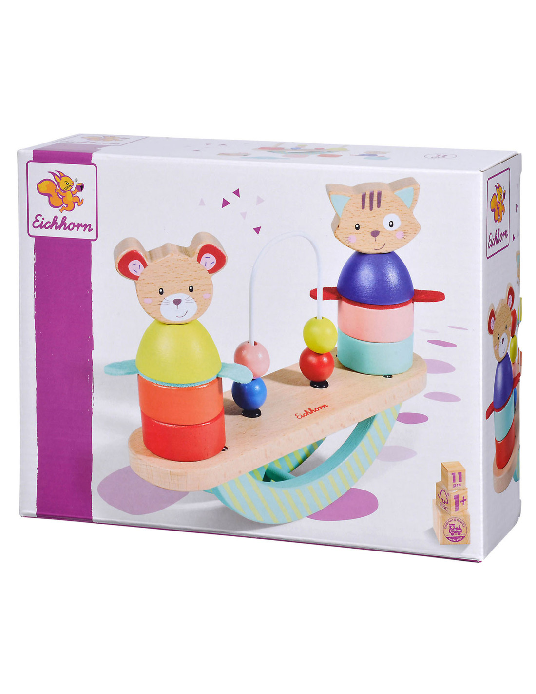Eichhorn Friends stapelspel: Met het 11-delige Eichhorn Friends stapelspel kunnen kleine torens in de vorm van een kat en een muis worden gebouwd van een wip en insteekonderdelen. Er is ook een kleine motoriekspiraal met kleurrijke kralen op de wip, die de fijne motoriek stimuleert. Het spelen met het stapelspel van 5 x 22 x 17 cm bevordert specifiek de motoriek en oog-handcoördinatie bij kinderen vanaf 1 jaar. Gemaakt van 100% FSC® hout uit duurzame bosbouw.