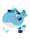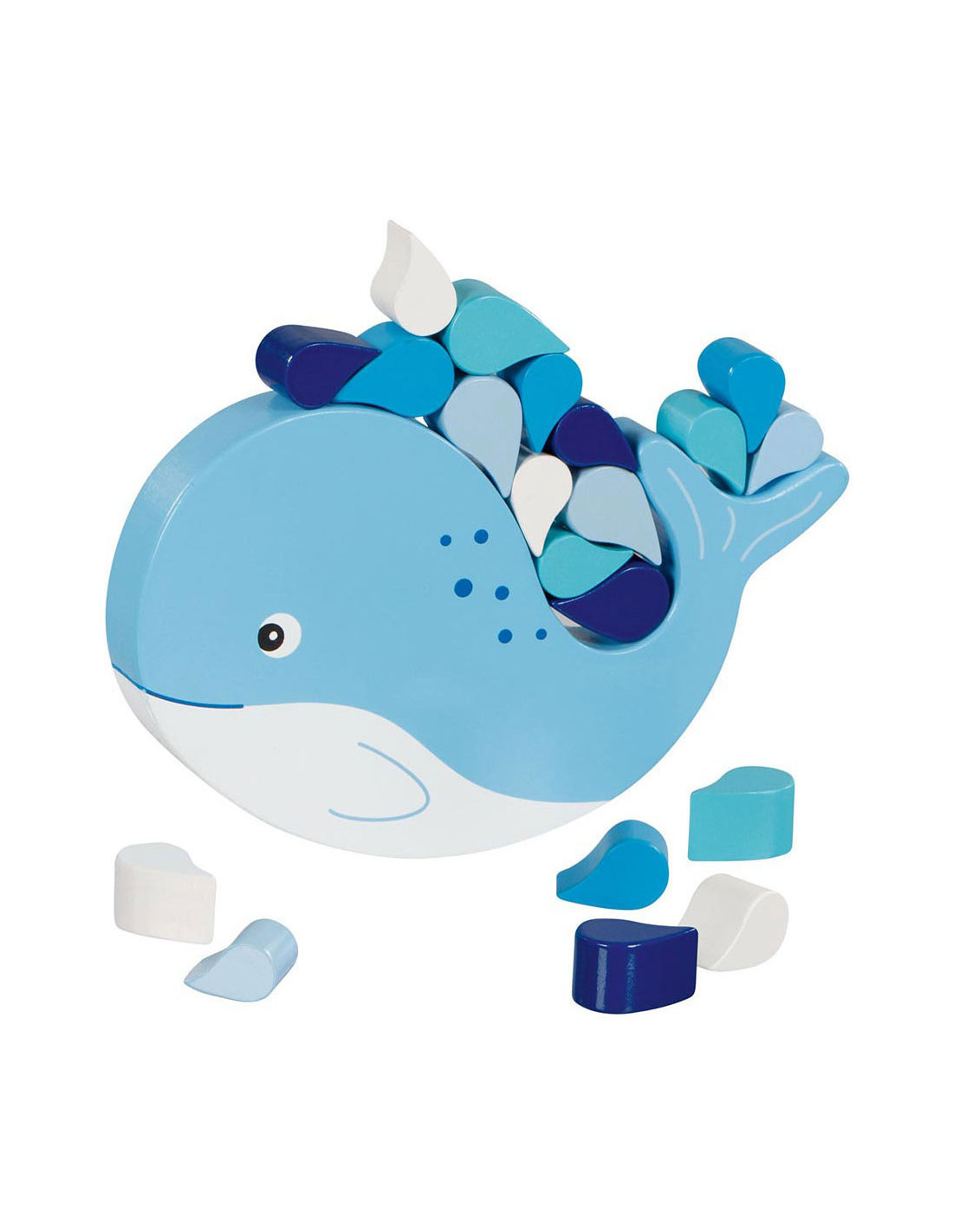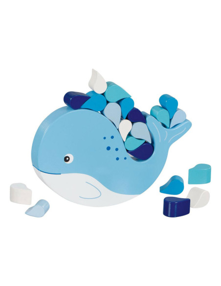 Balanceerspel met een houten walvis en houten waterdruppels. Het 21-delige spel is 16 x 2,5 x 15 centimeter groot en geschikt voor kinderen van 4 jaar en ouder.